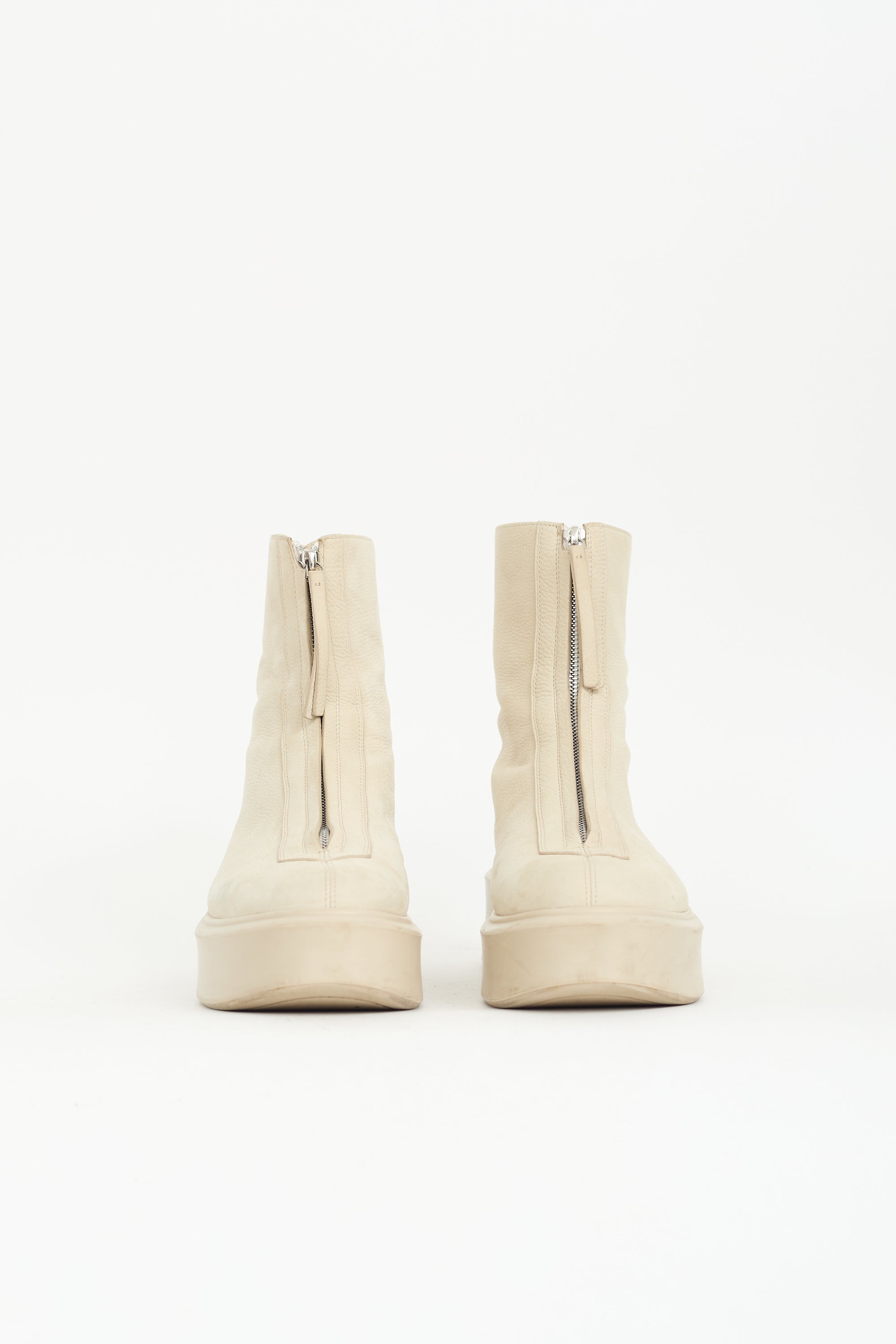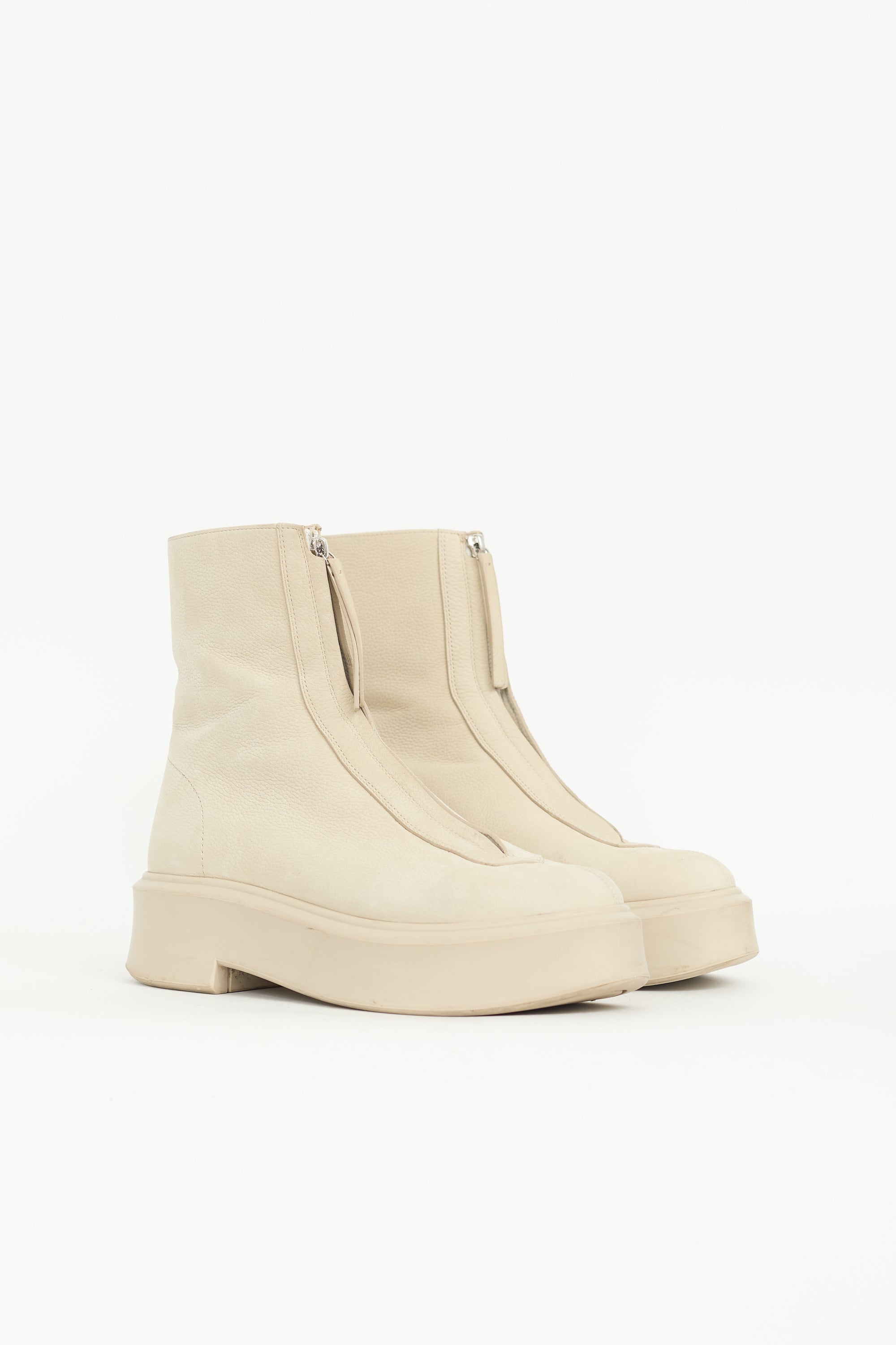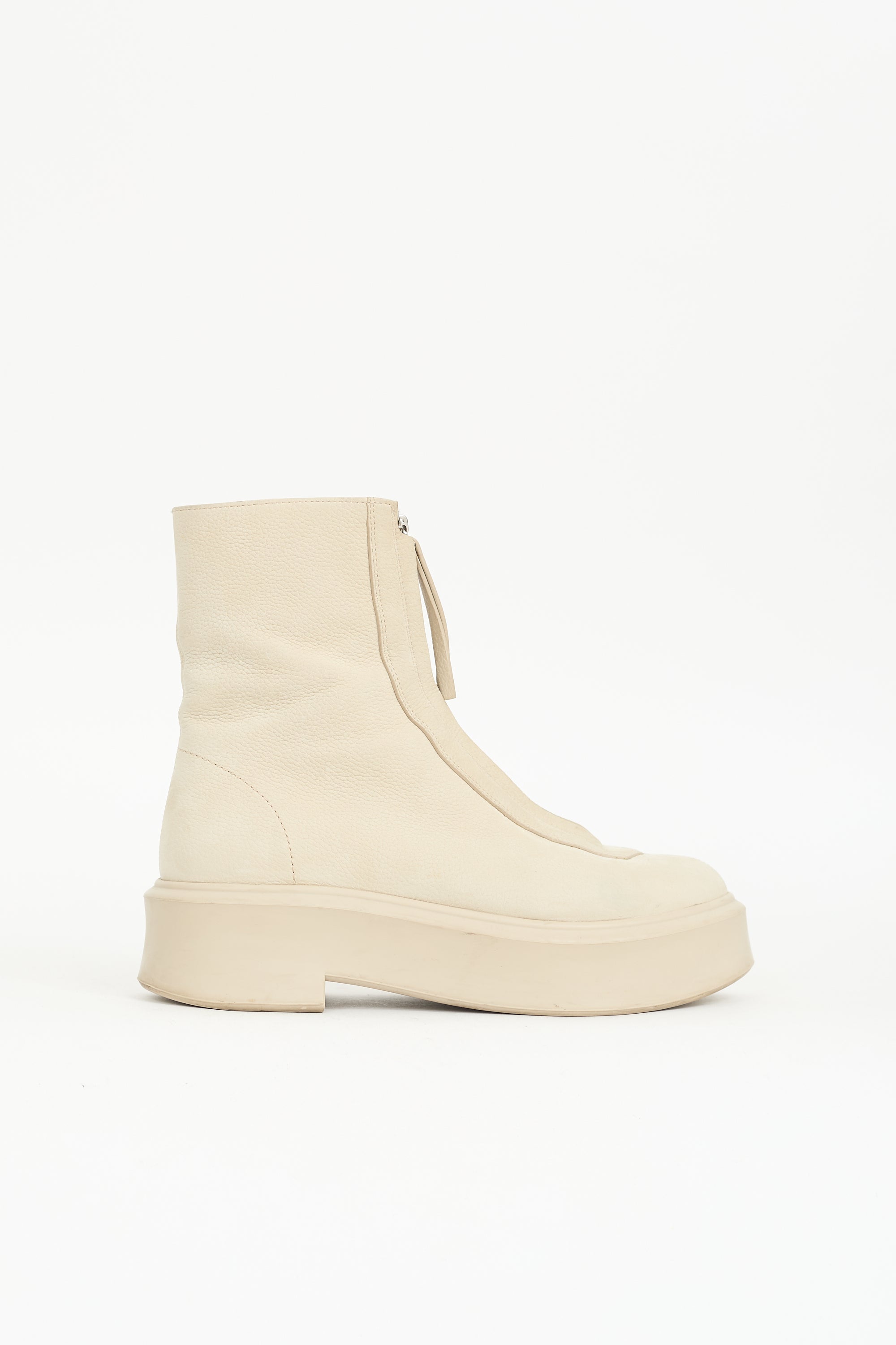 Pre-owned The Row beige leather Zipped 1 boots featuring rounded toe, zip up front, and tonal rubber platform sole with block heel.