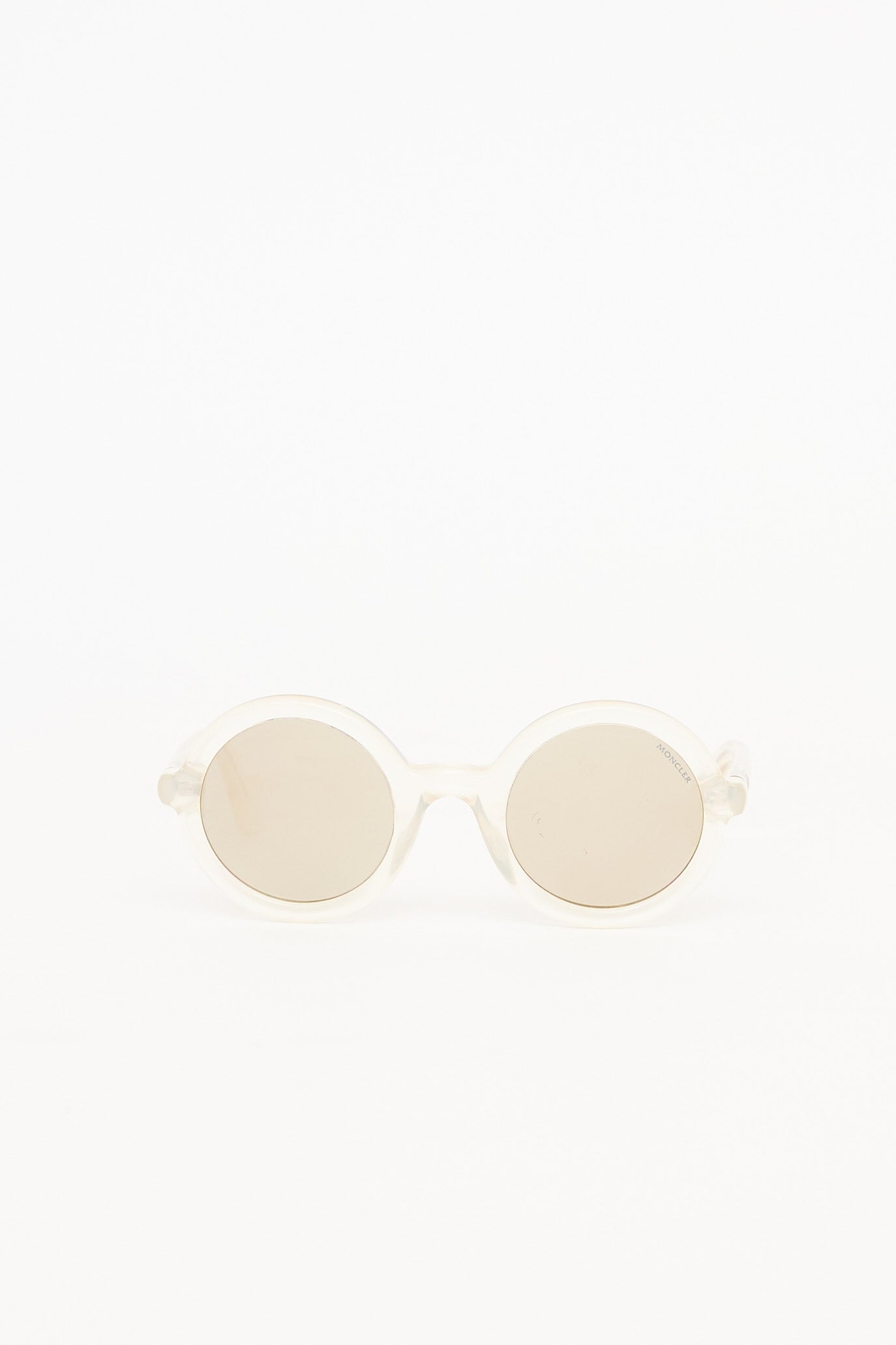 Pre-owned Moncler white Mrs Moncler white sunglasses featuring a round frame, tinted reflective lenses, nose pads, and logo hardware at temples.