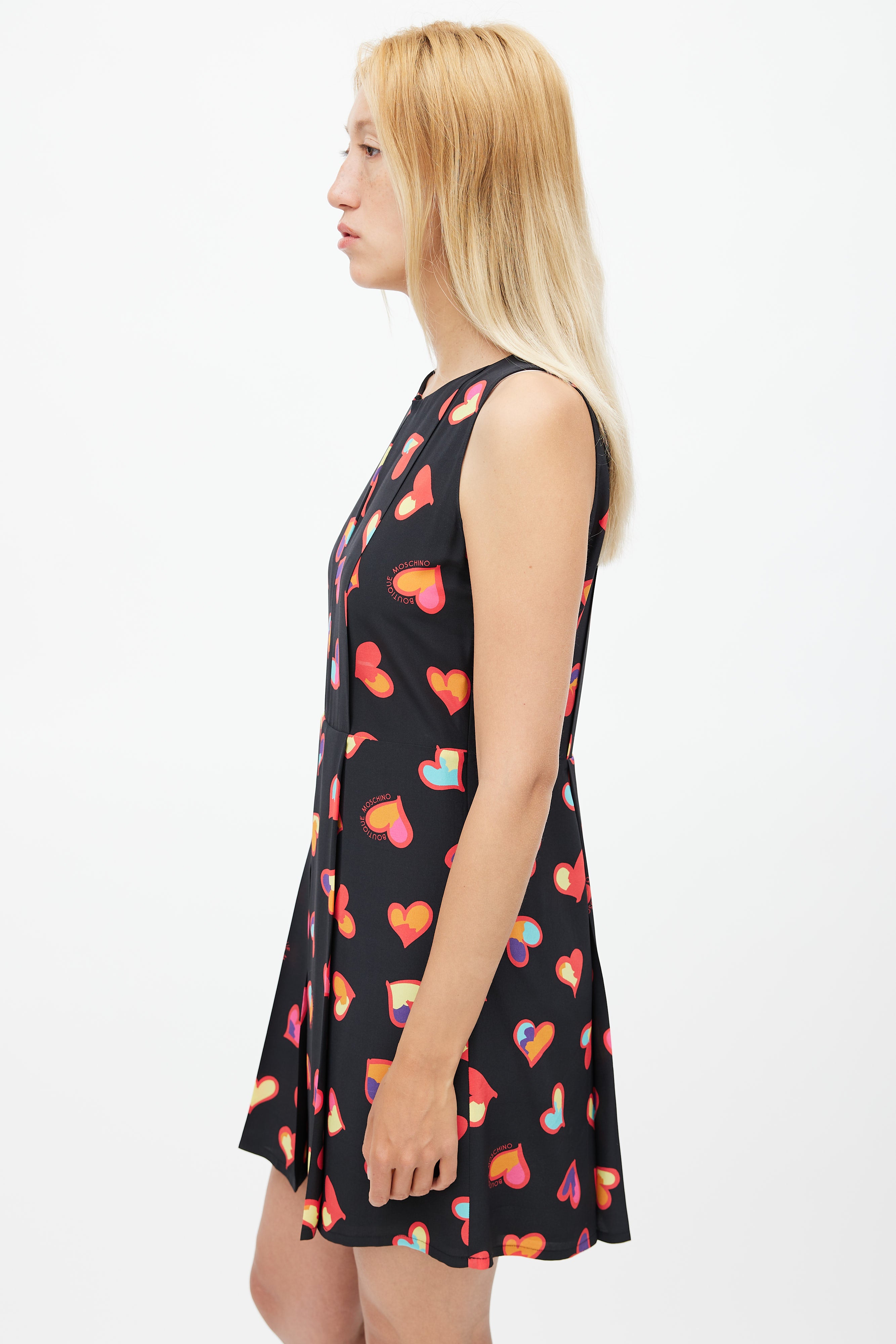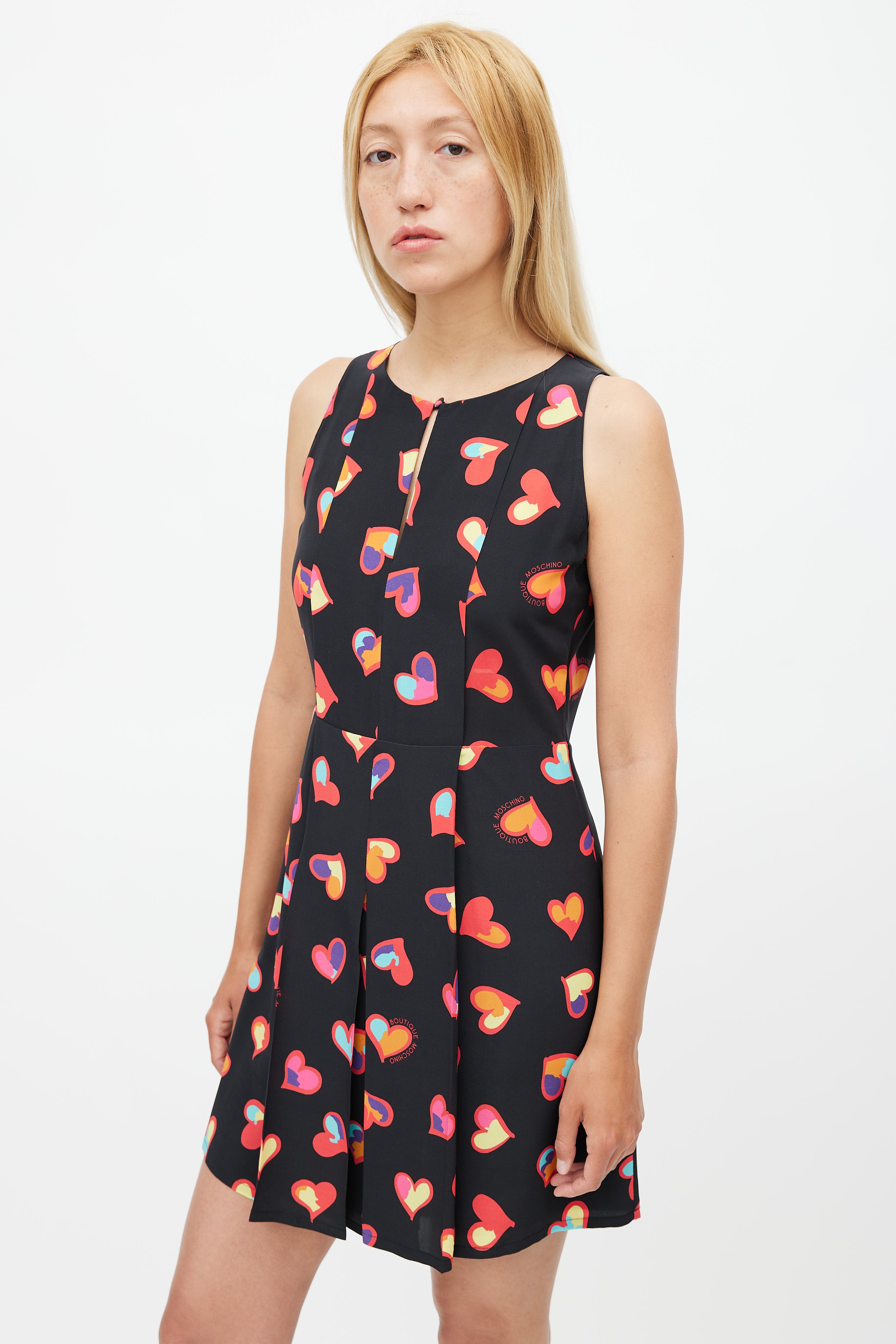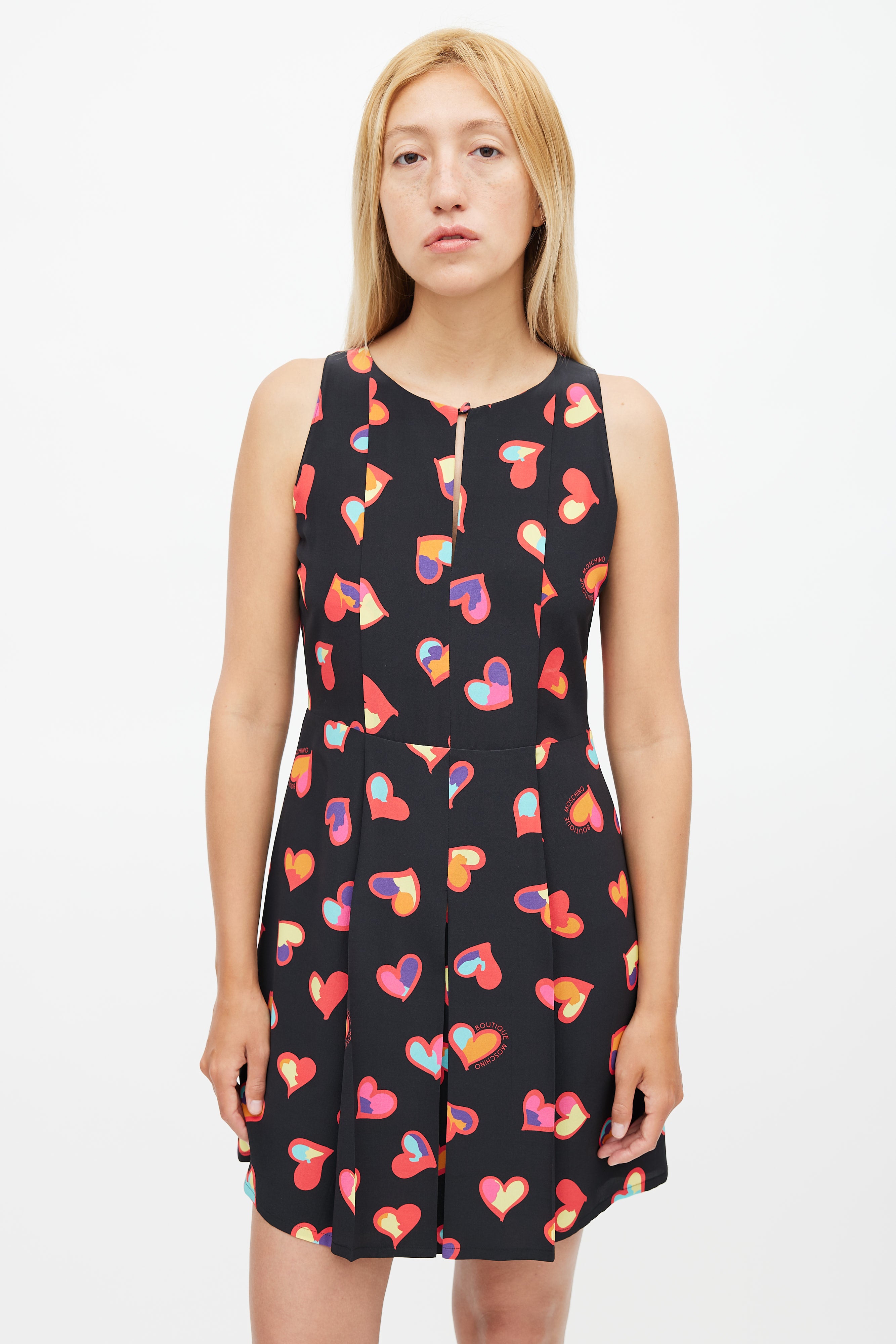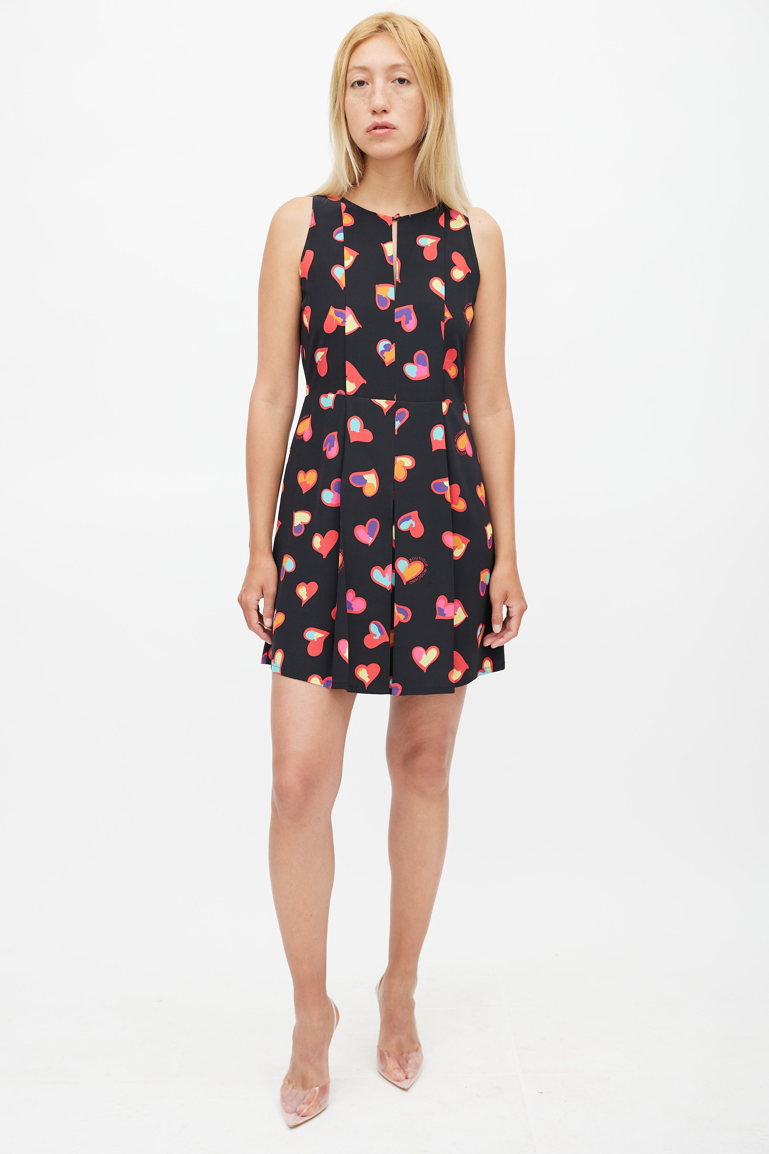 Pre-owned Moschino Boutique black dress featuring a multicolour heart print, keyhole neckline with covered button, pleated detailing throughout, and zip at left side with hook and eye closure. Lined.