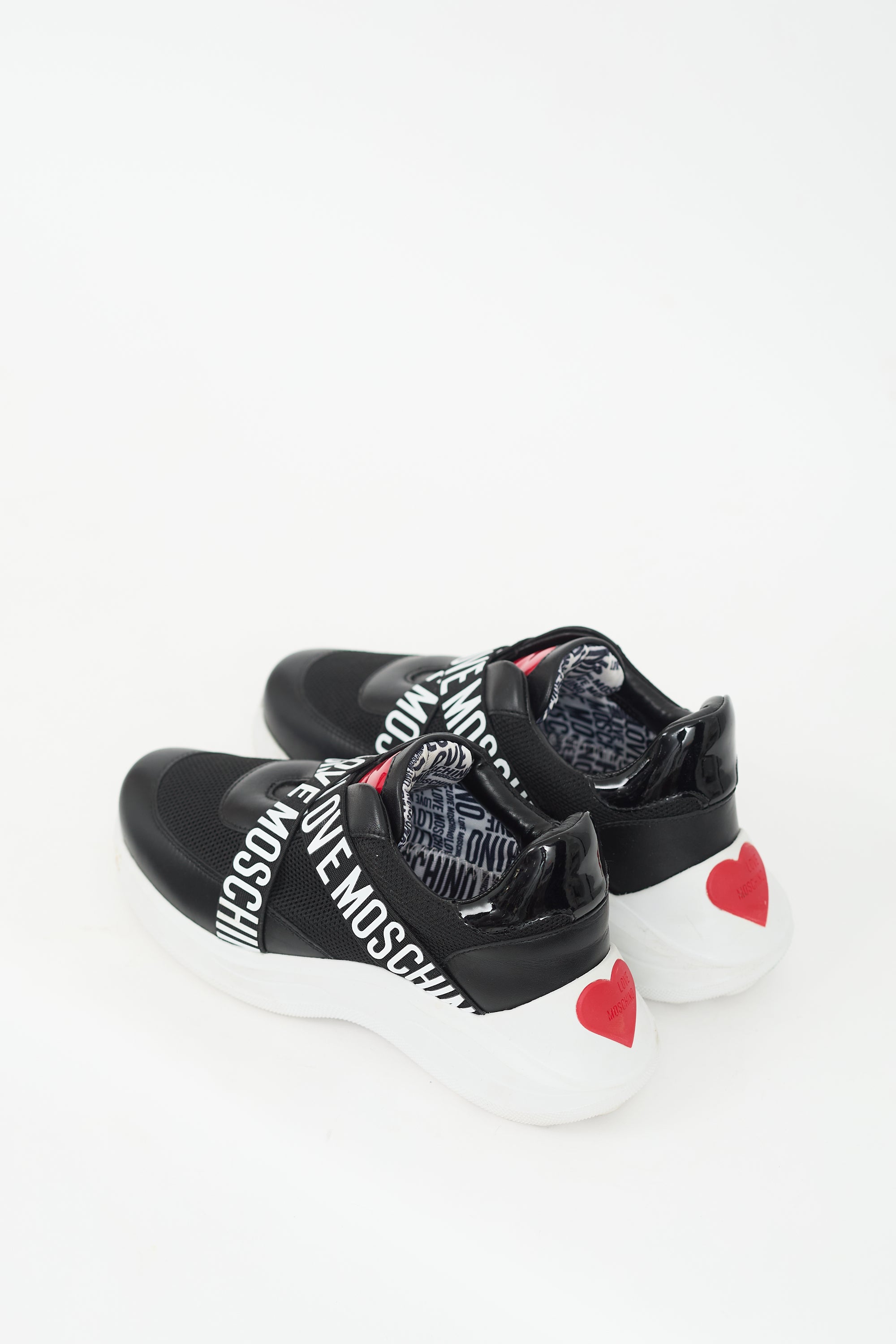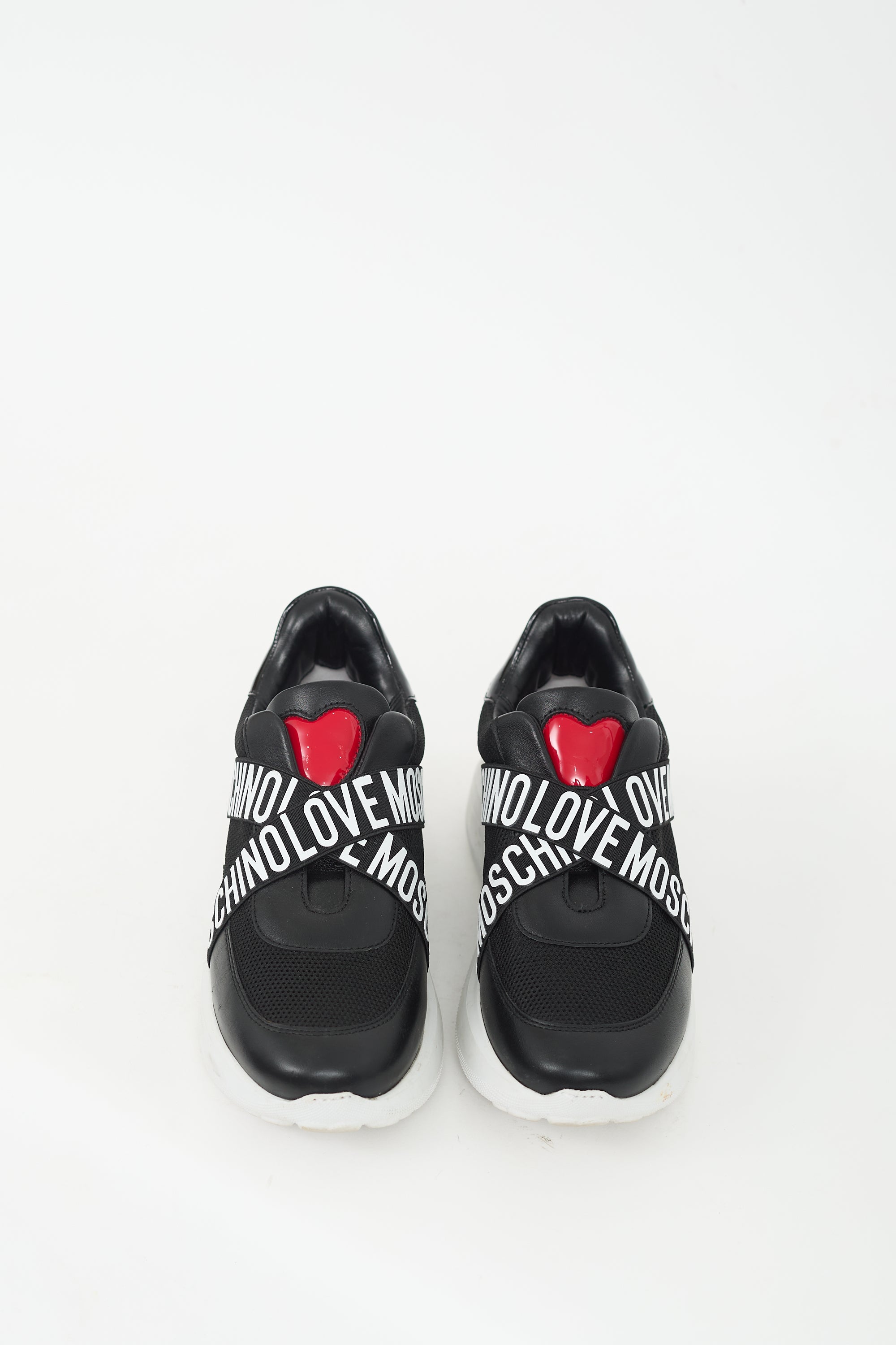 Pre-owned Moschino Love black and white sneakers featuring a rounded toe, mesh upper, leather panelling throughout, elastic criss cross straps across instep with rubberized logo throughout, red patent leather heart motif at tongue, slip on entry, and white rubber sole with red logo heart at counter.