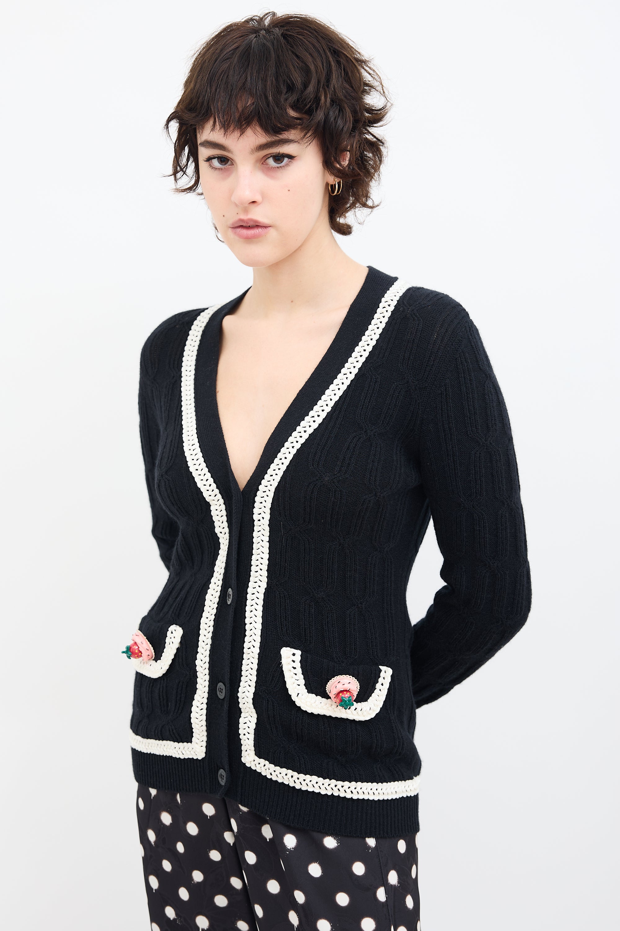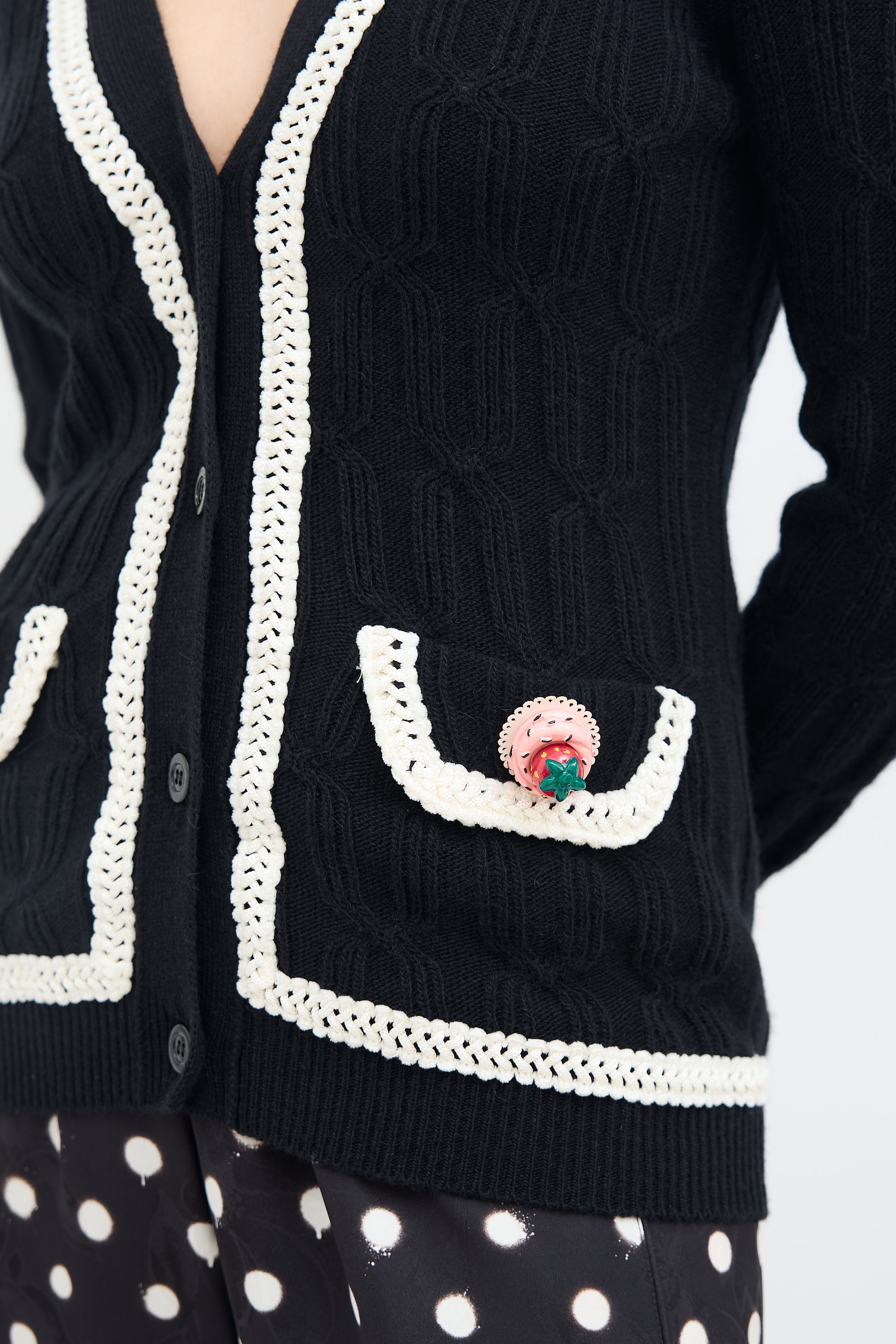 Pre-owned Moschino Couture black cardigan featuring a V-neckline, button up front closure, white lattice trim, and two front decorative flaps with strawberry and icing motif embellishments.