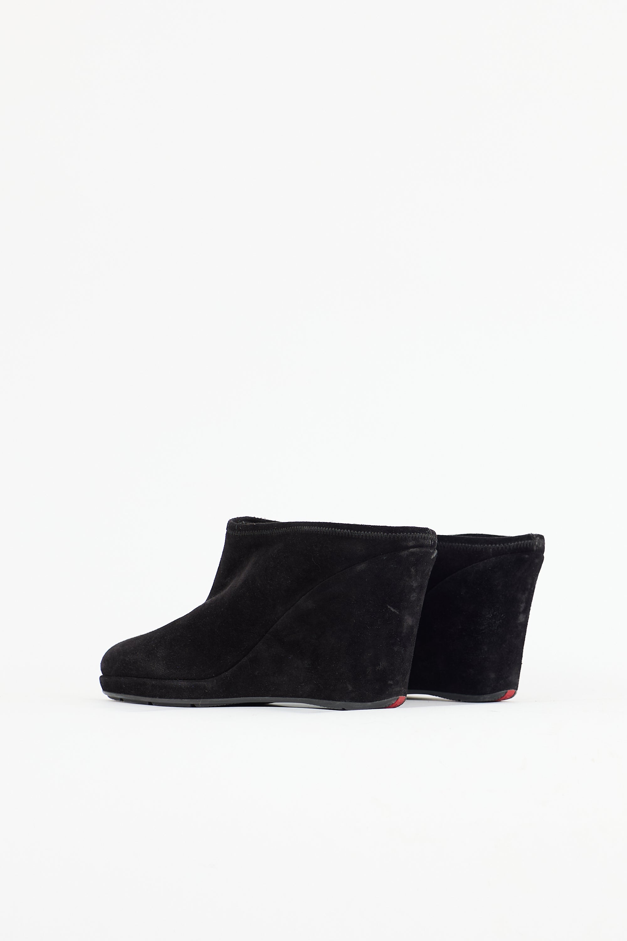 Pre-owned Prada black suede mules featuring square toe, covered wedge, and red linea rossan at insole and outsole.