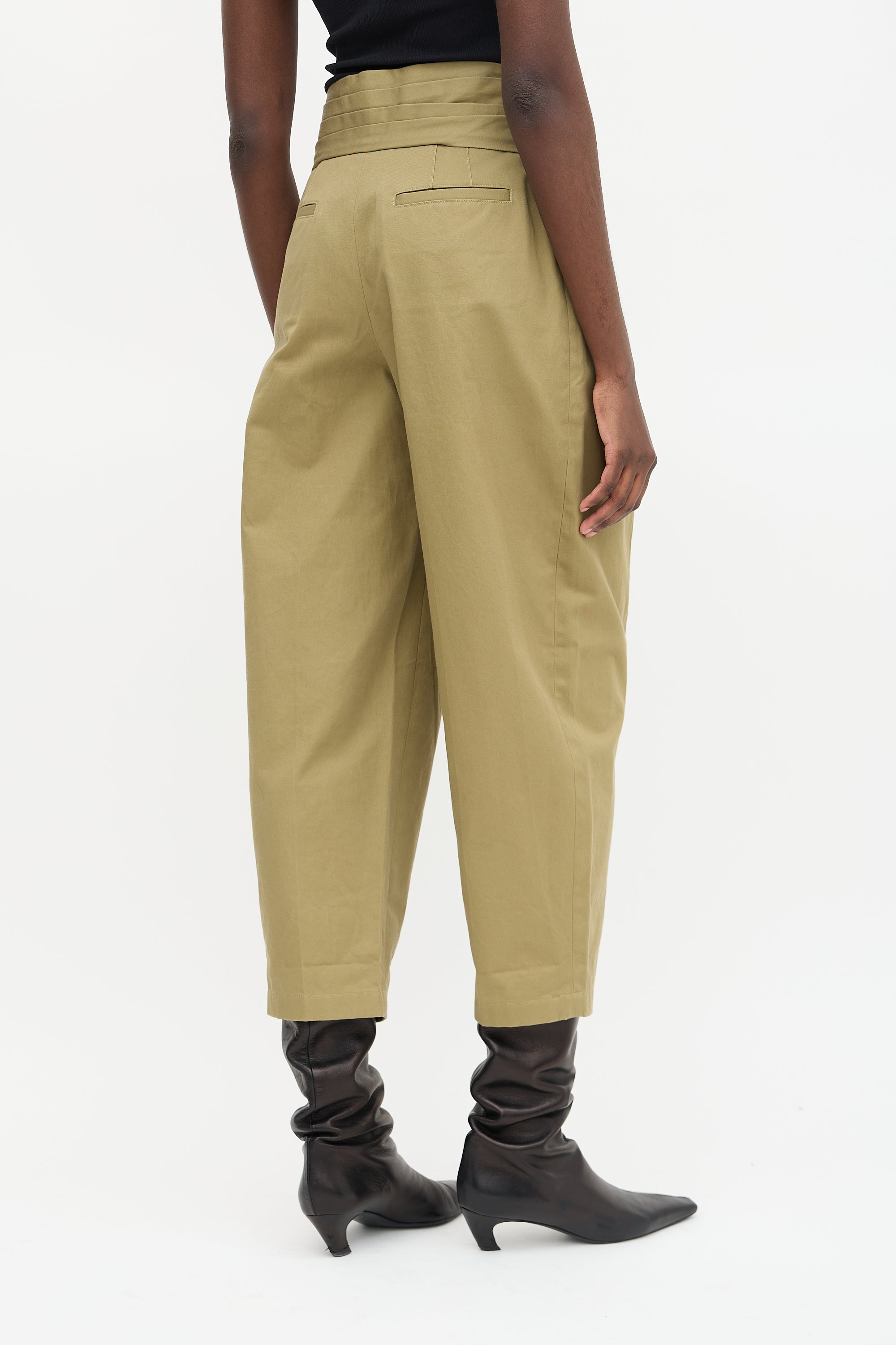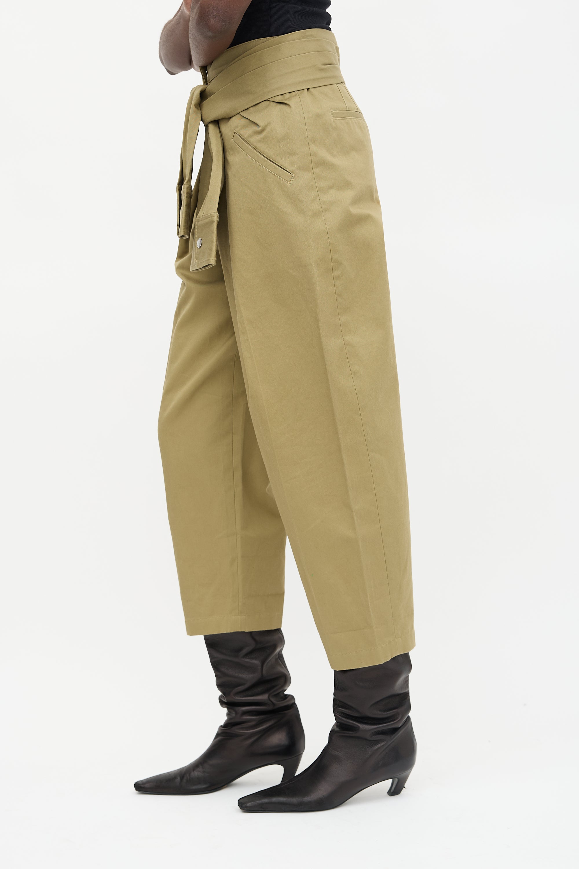 Pre-owned Alexander Wang green pant featuring a high rise, shirt sleeve tie belt, zip fly with hook and eye fastening, pleated front, four pocket styling, and cropped barrel leg.