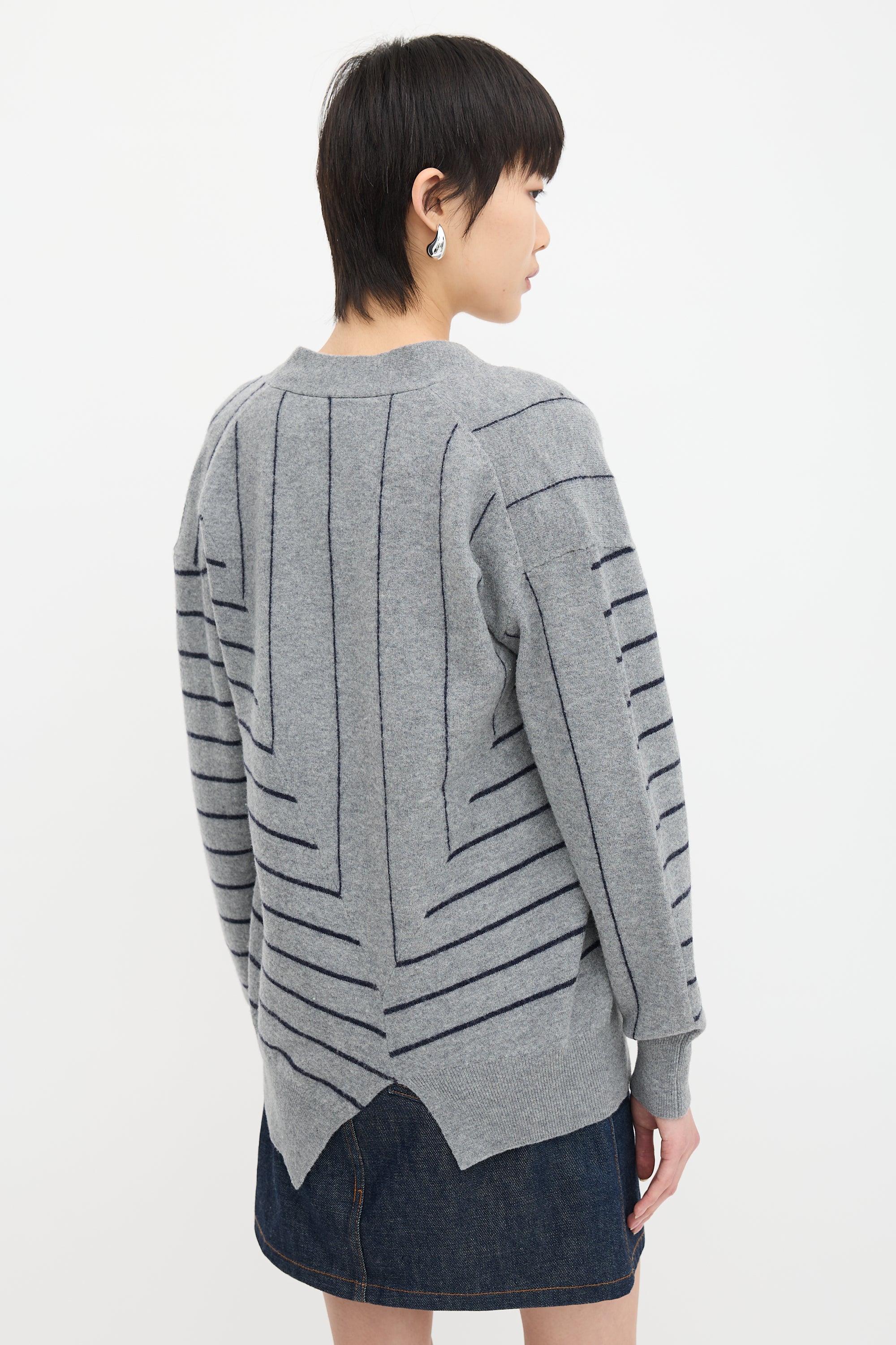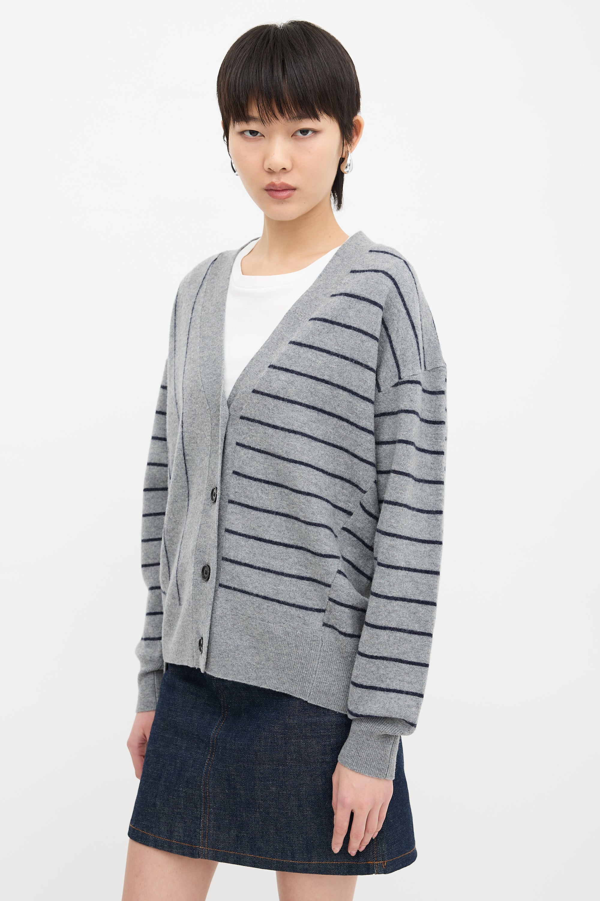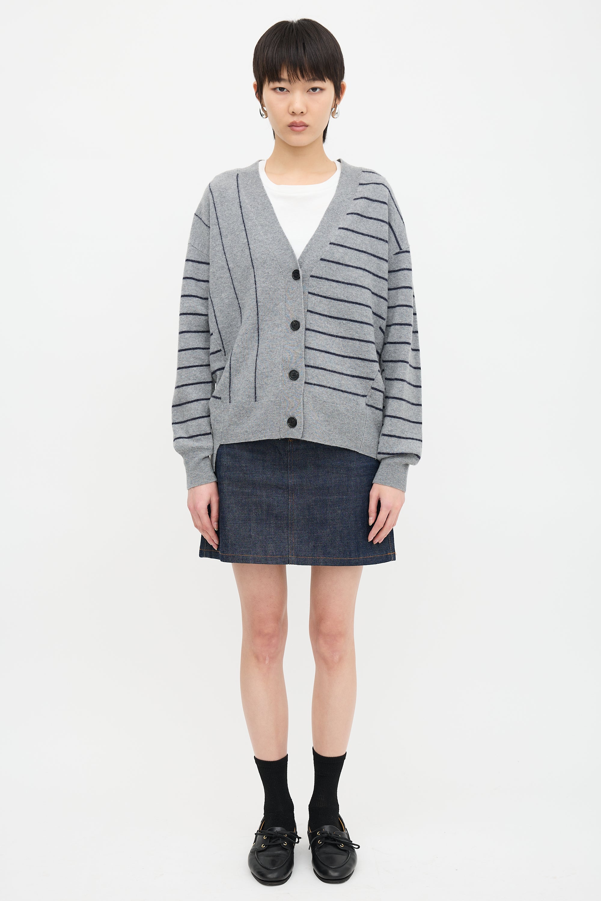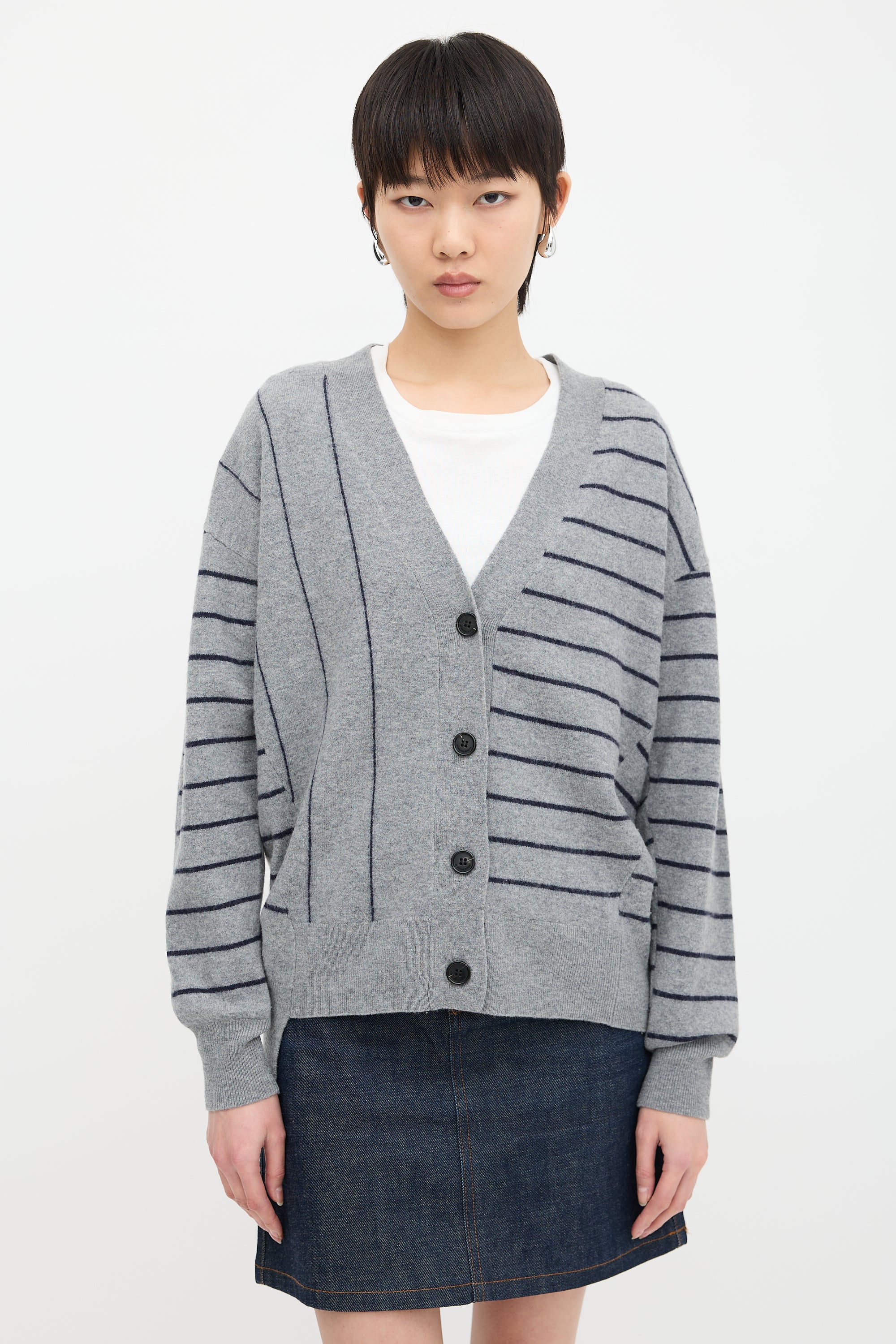 Pre-owned By Malene Birger grey and navy wool Genivee cardigan featuring asymmetric stripe design, Y-neckline, button up front, and rubbed placket, hem, and cuffs.