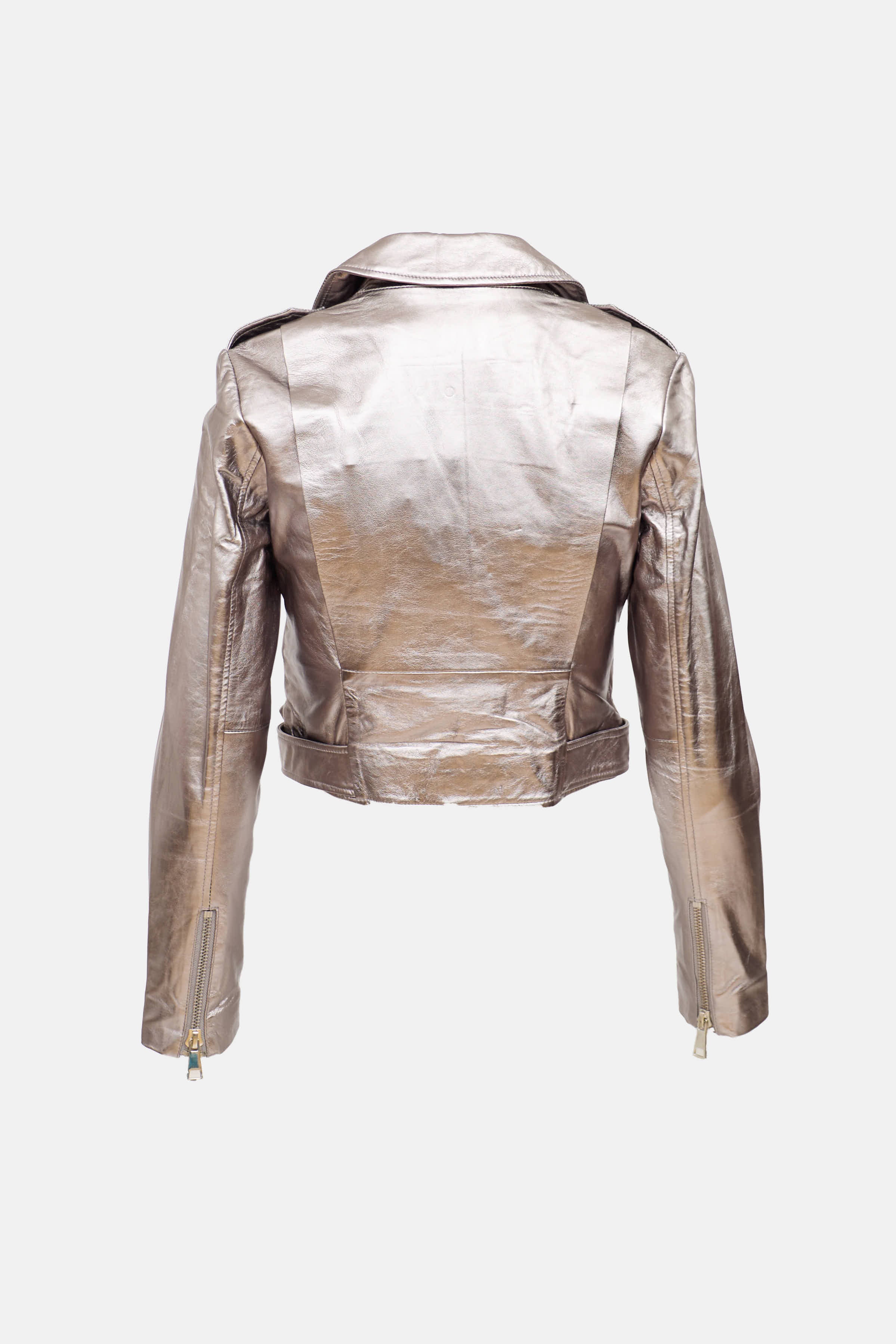 Pre-owned Cami NYC silver Kali leather jacket featuring cropped styling, notched lapel collar, asymmetrical zip front closure, two front zip pockets, two belt loops on waist, epaulettes, and zipped cuffs. Lined.