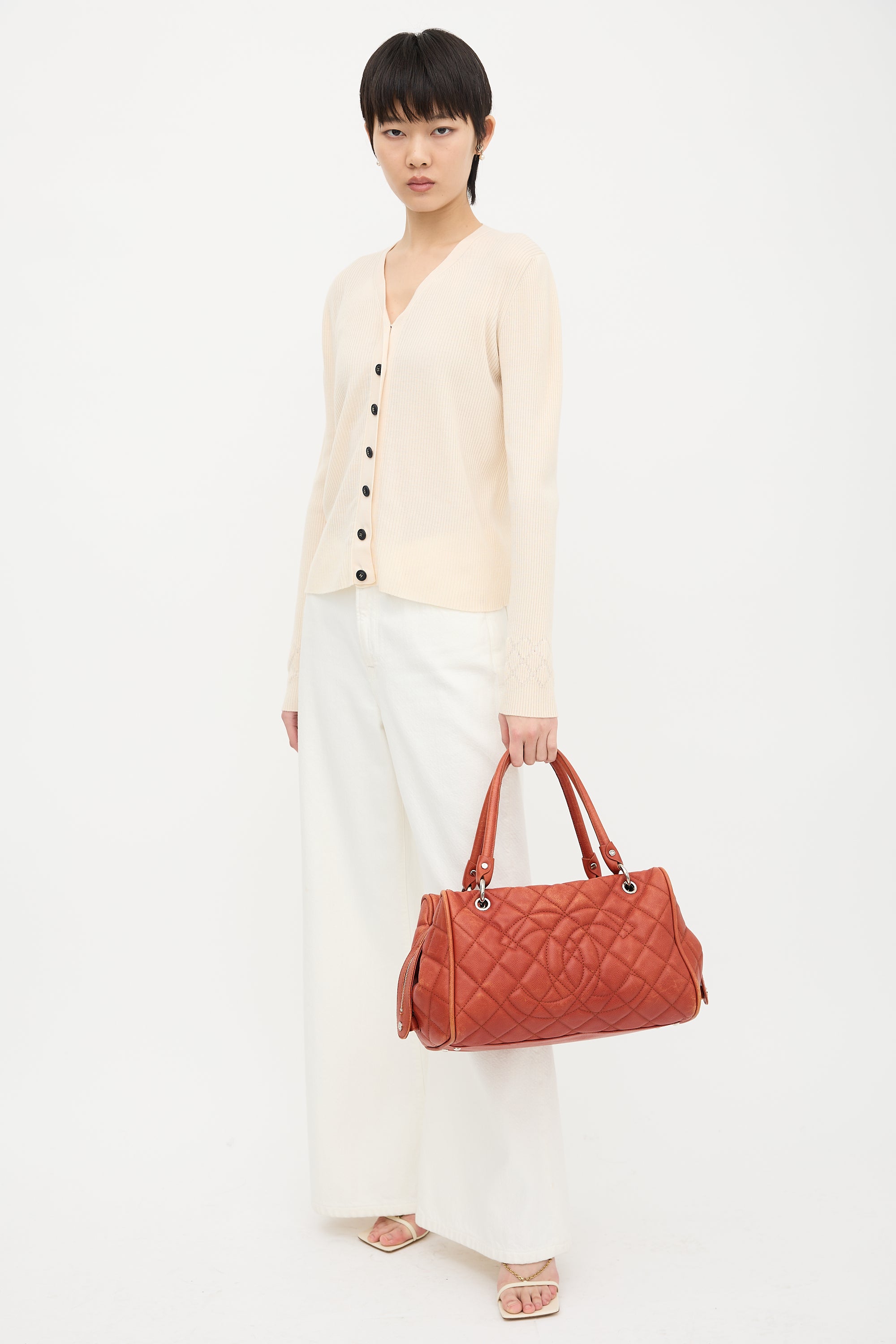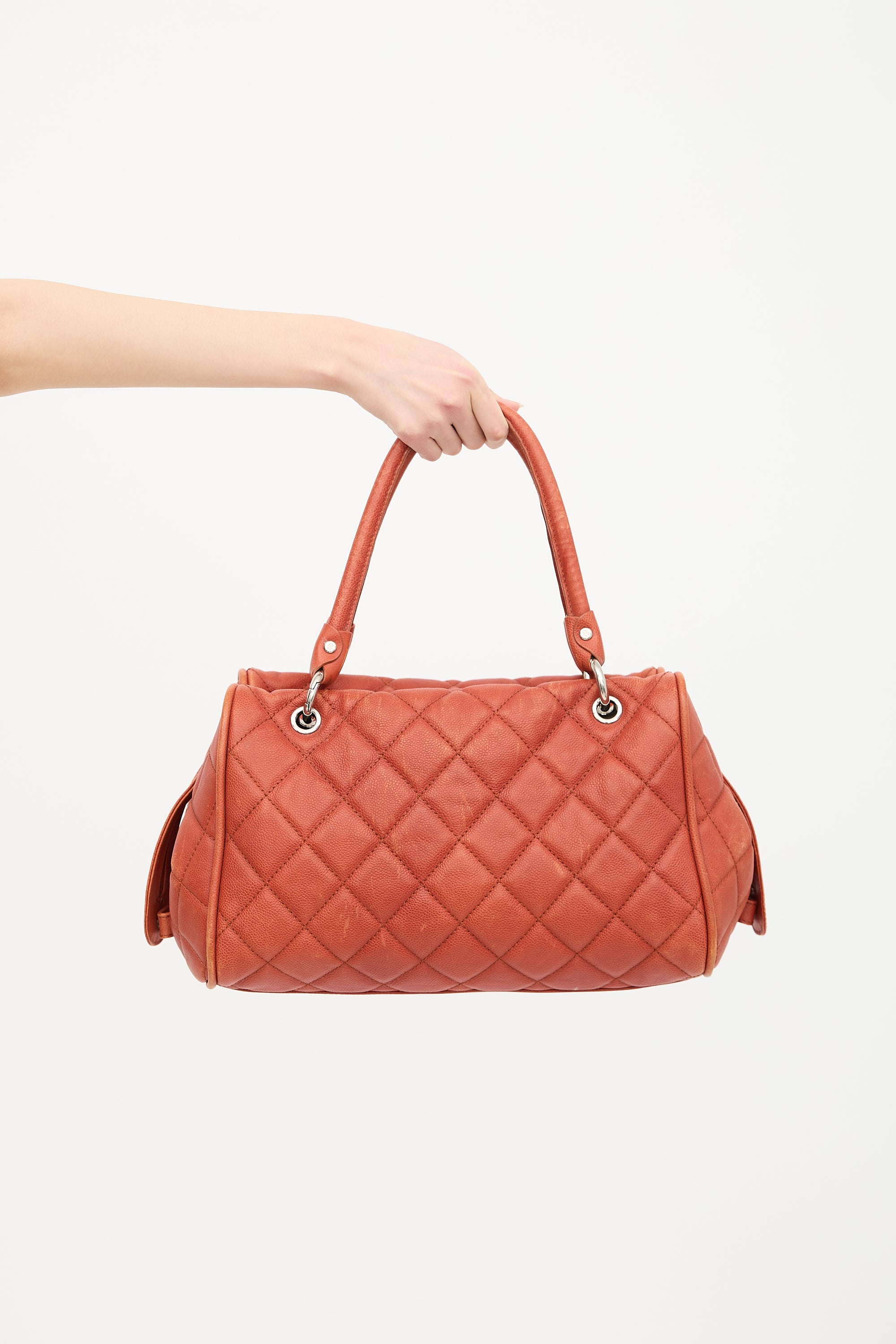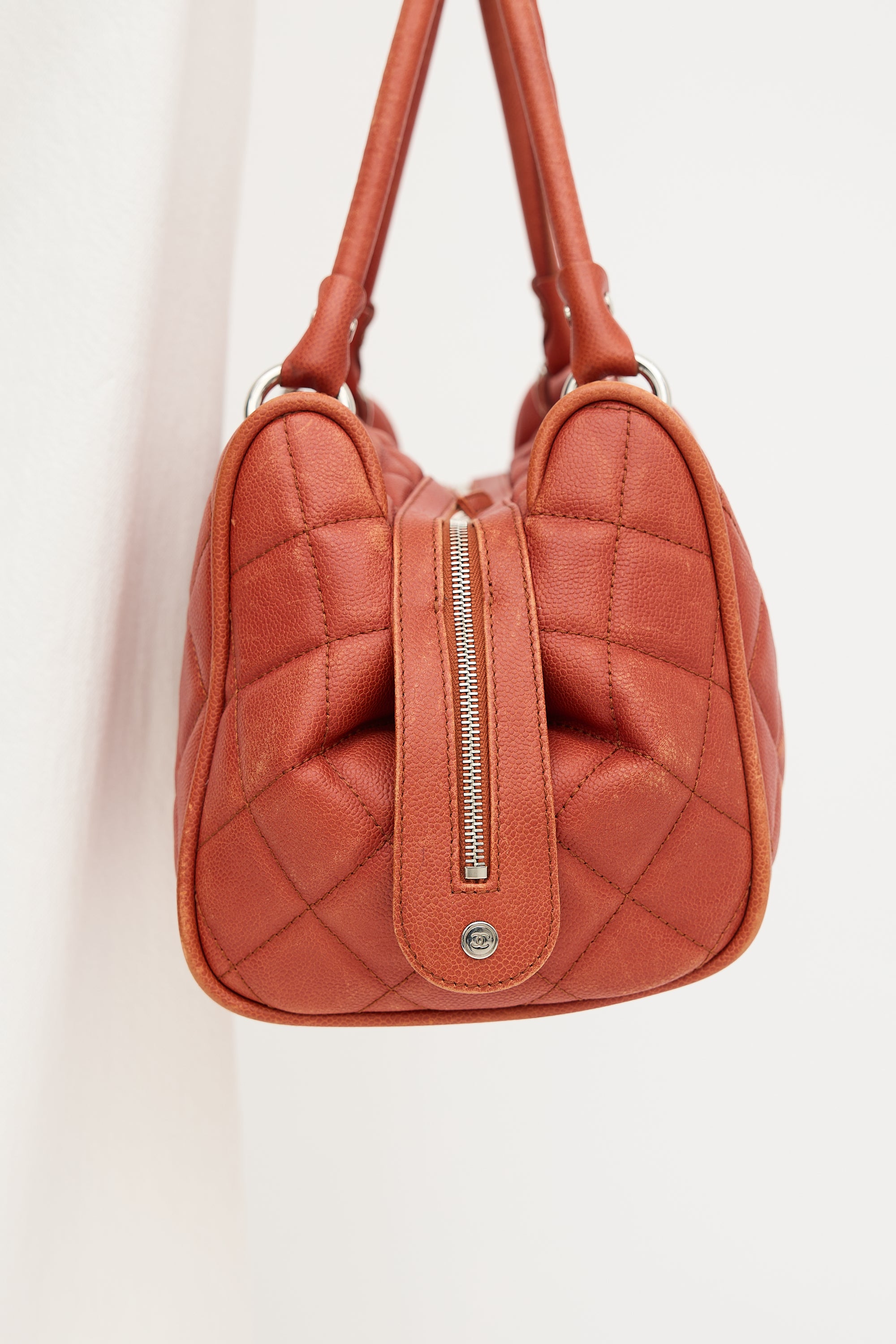 Pre-owned Chanel 2008-2009 orange caviar leather Timeless Bowler bag featuring diamond quilt stitching, silver tone hardware, four feet, stitched interlocking CC motif at front, dual rolled top handles, two way top zip closure, and one lined main compartment with two zip pockets and one slip pocket.