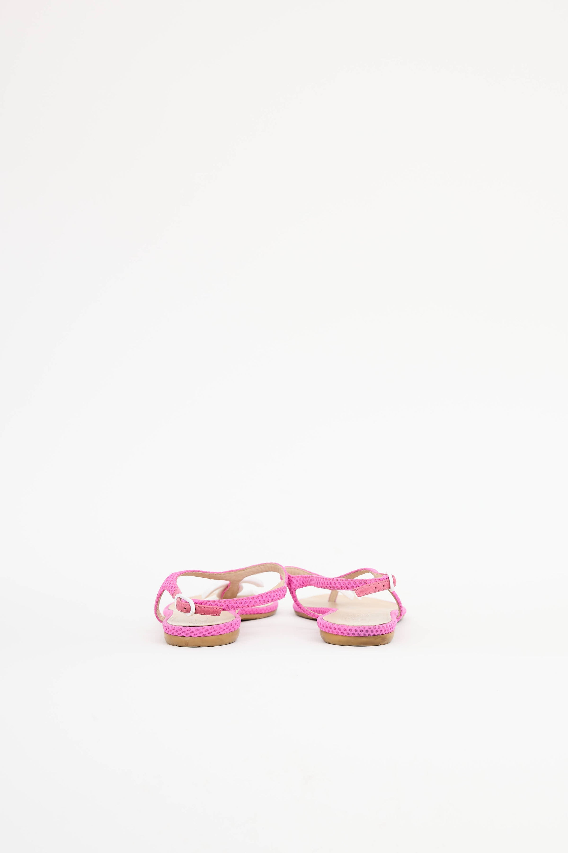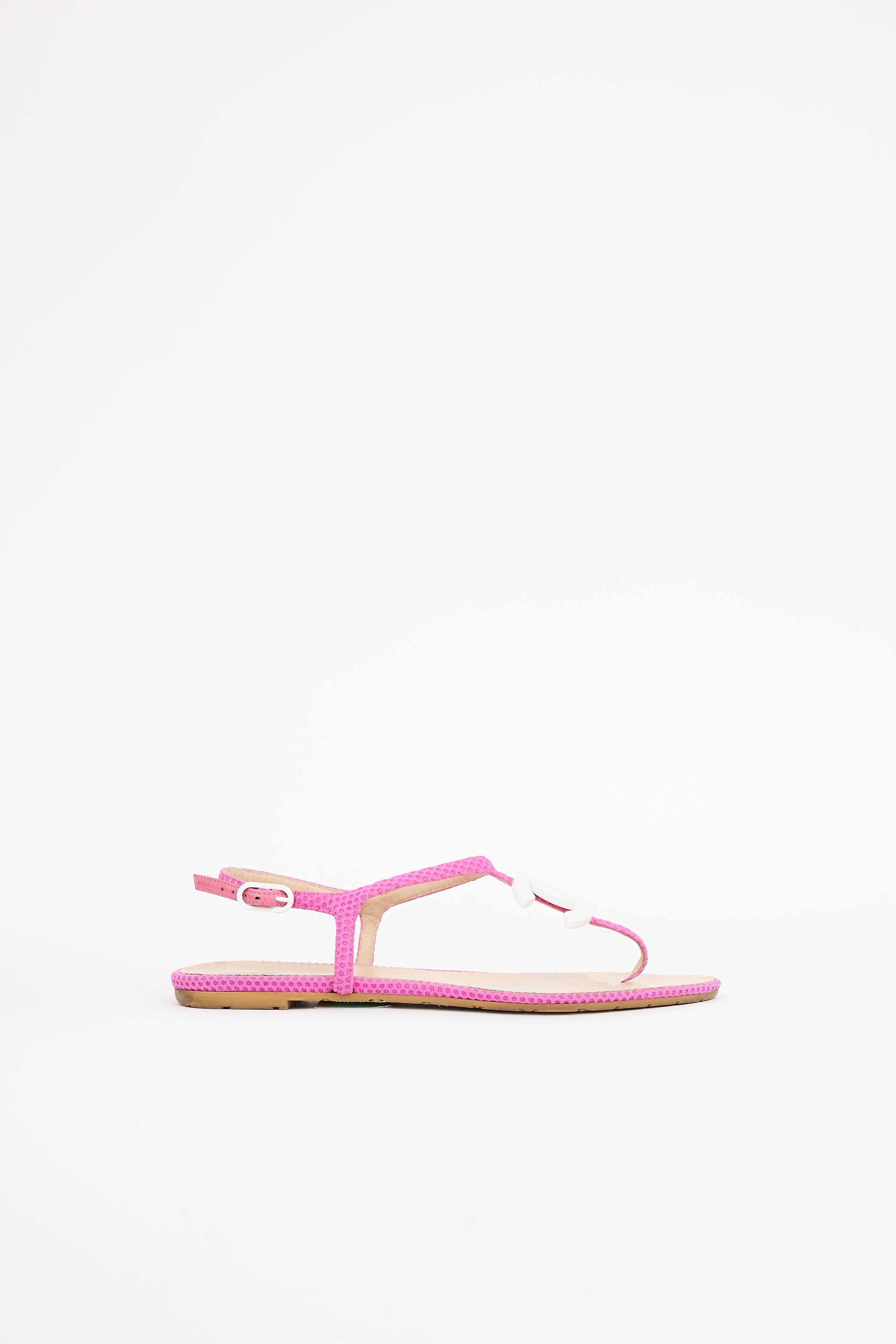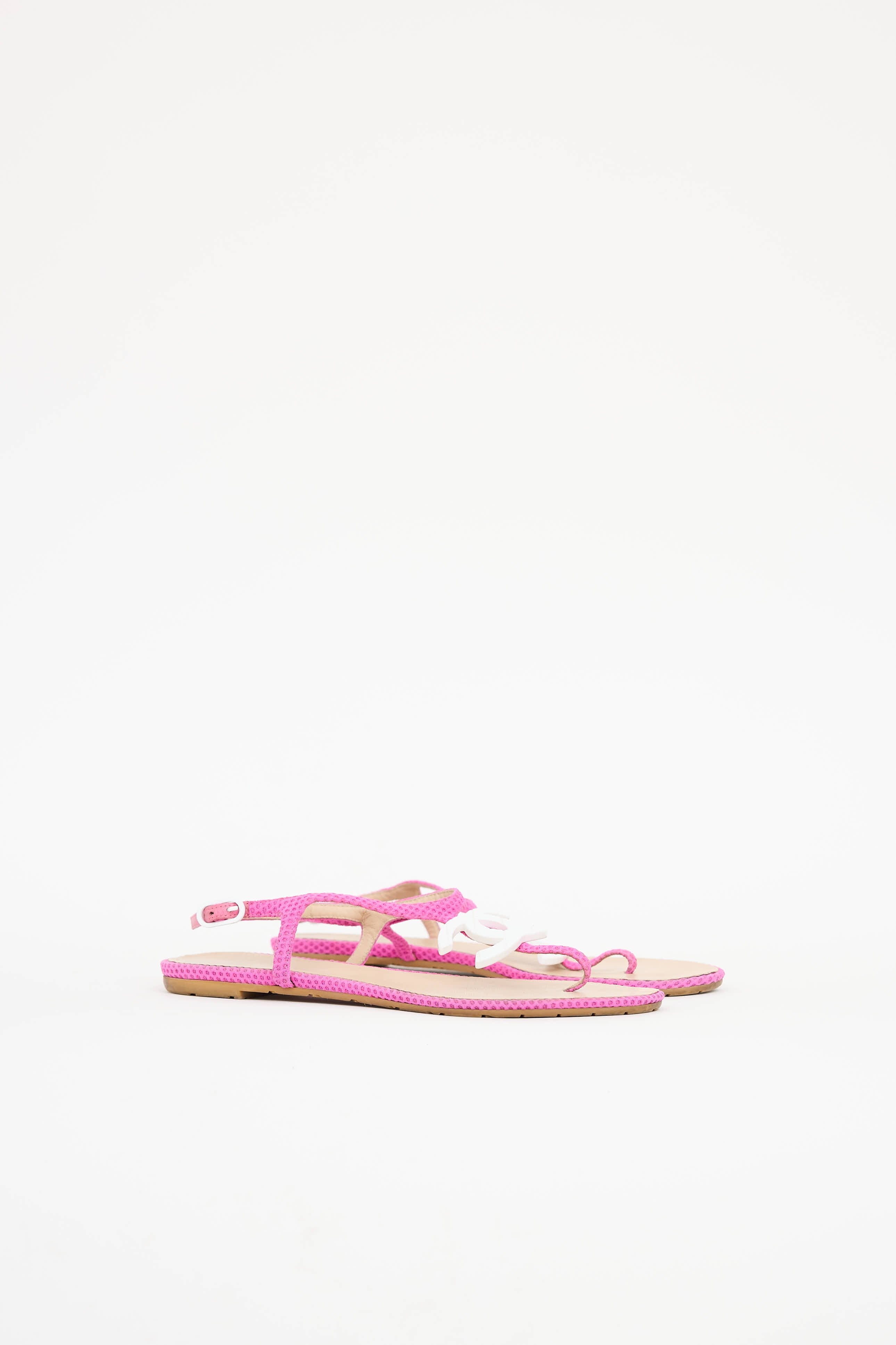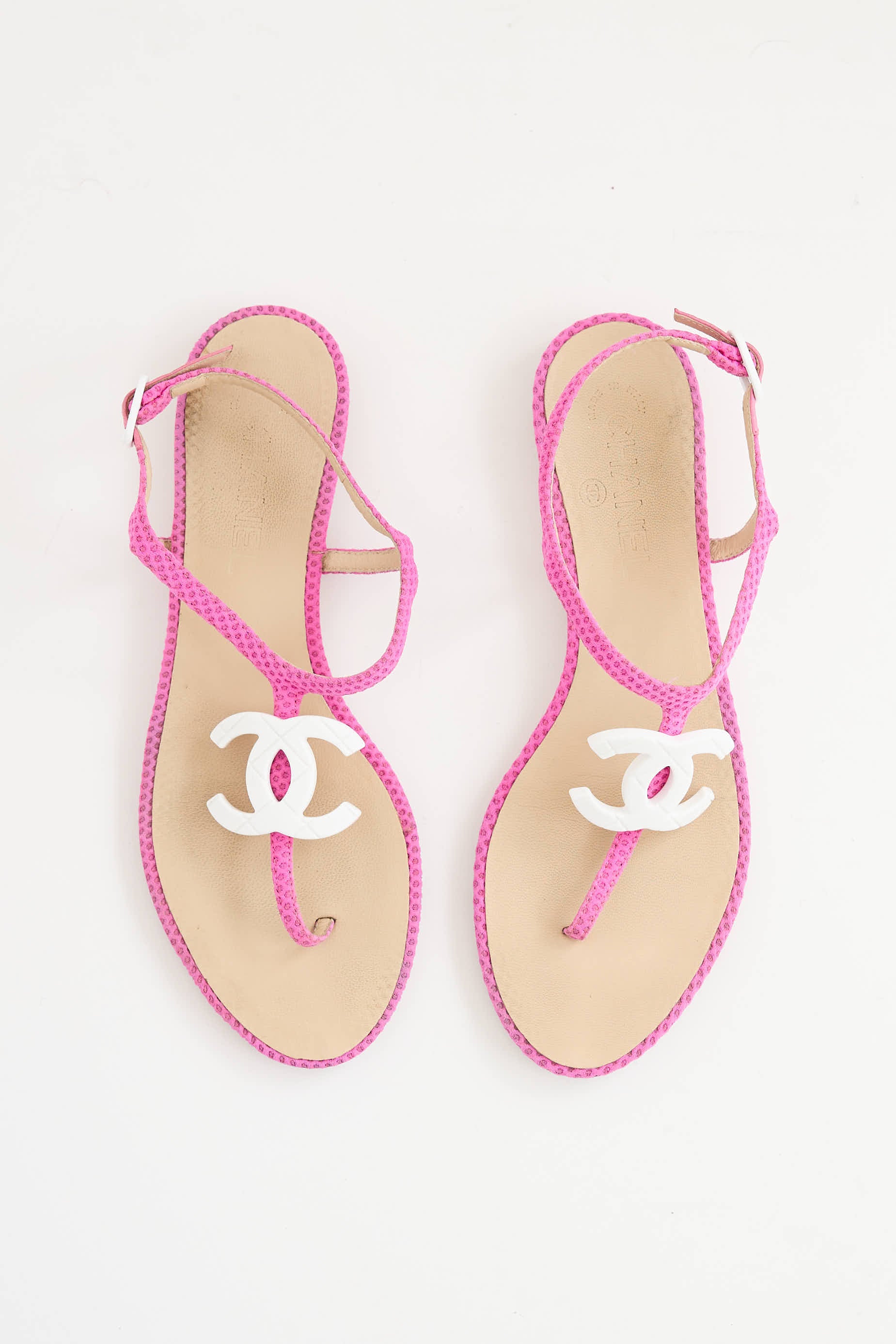 Pre-owned Chanel pink CC T-Strap sandals featuring open rounded toe, white enamel hardware, adjustable buckle ankle strap, caged strap at heel, and CC logo enamel at vamp.