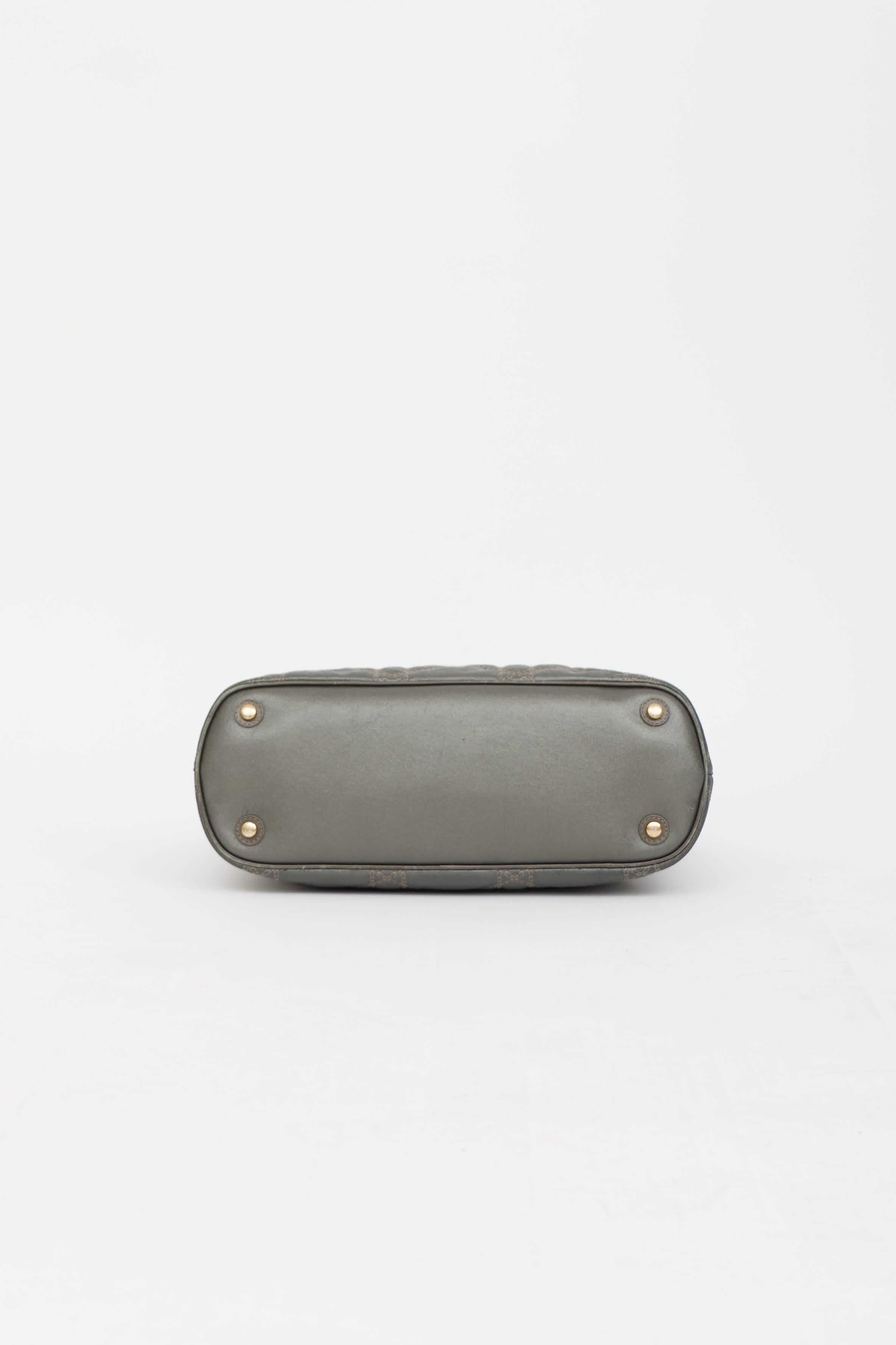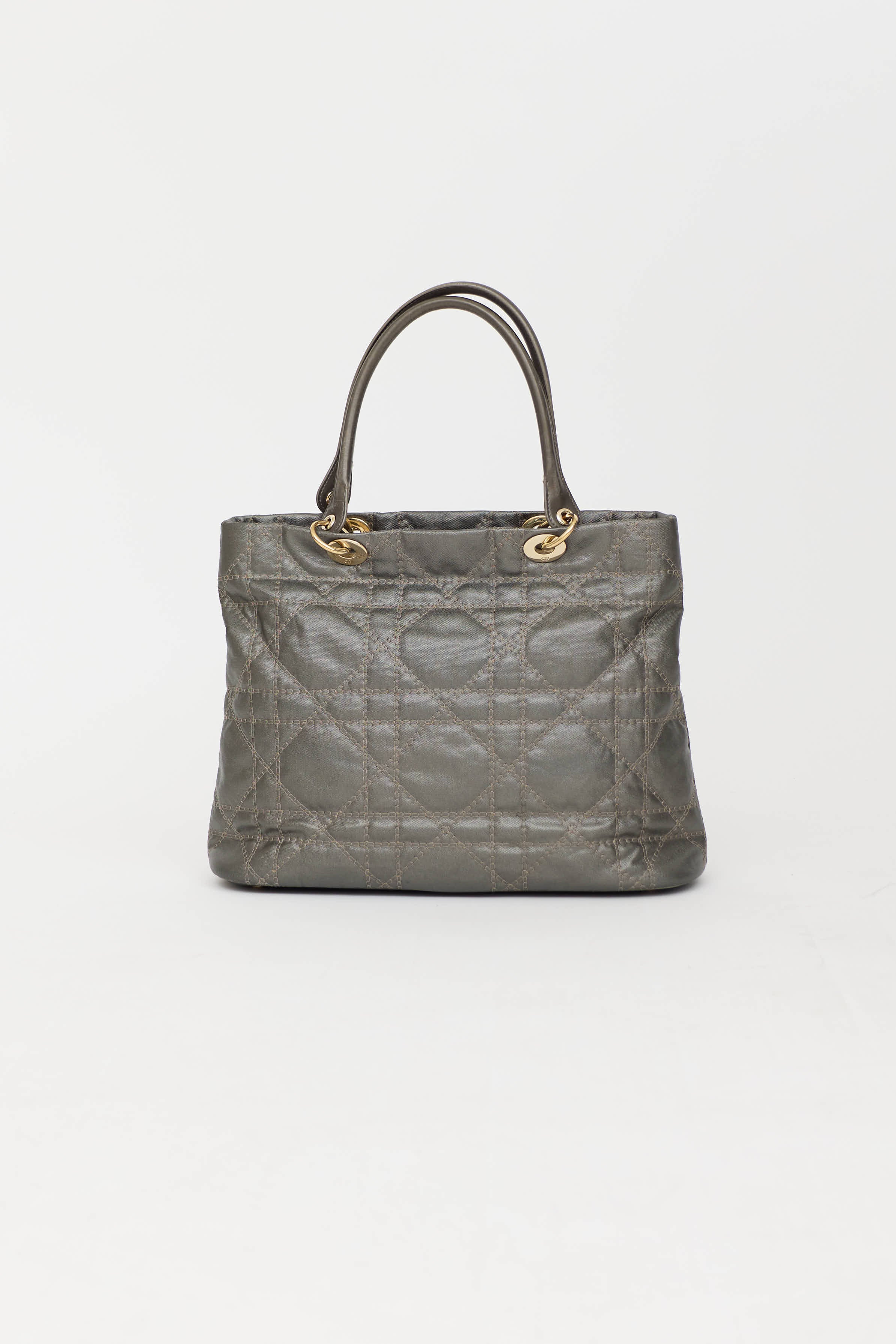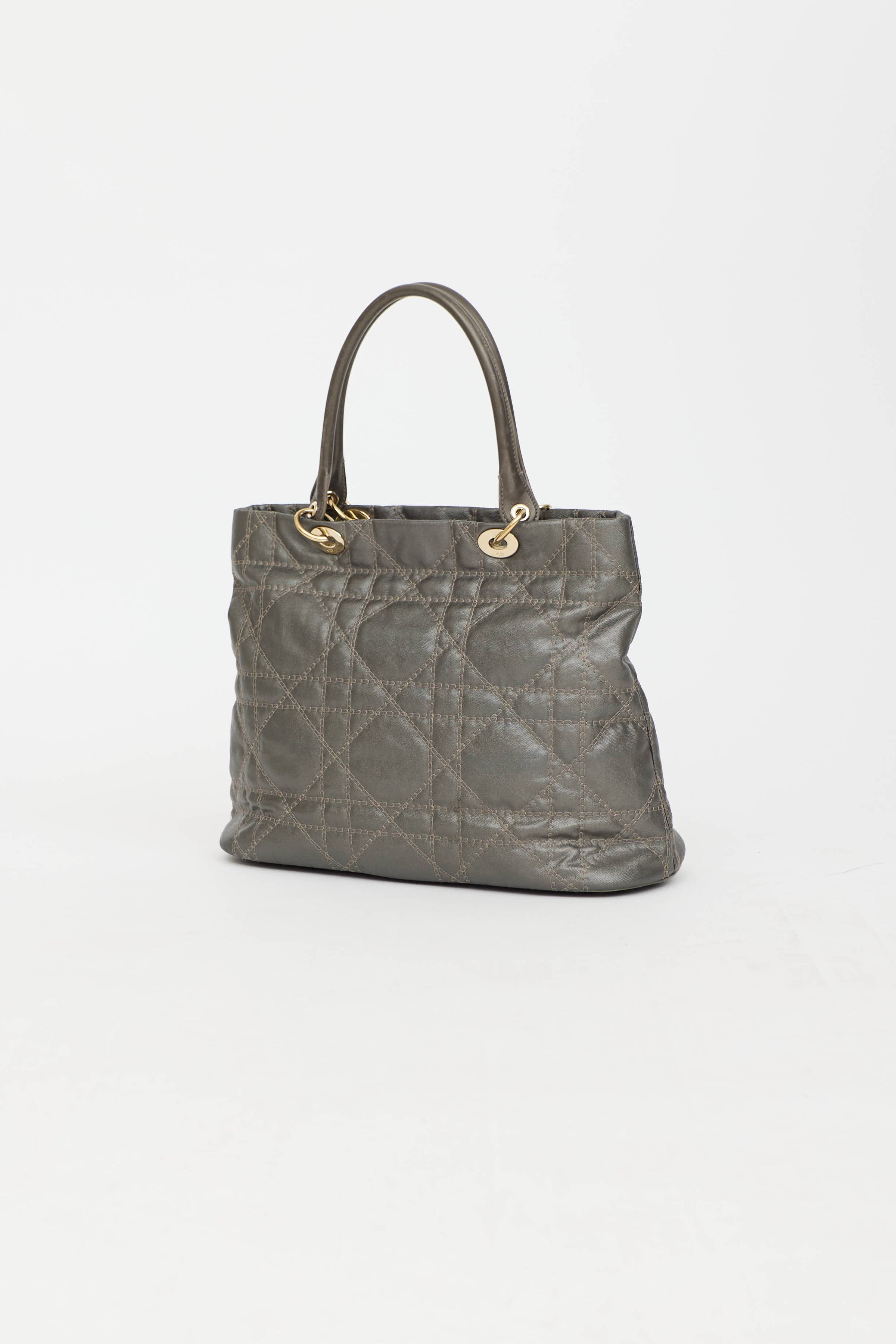 Pre-owned Dior 2009 grey metallic soft cannage tote bag featuring quilted coated canvas, dual rolled top handles, gold tone hardware, "D.I.O.R." charms at handle, top zip closure, one main compartment with one zip pocket, and two slip pockets. 2009 Collection by John Galliano.