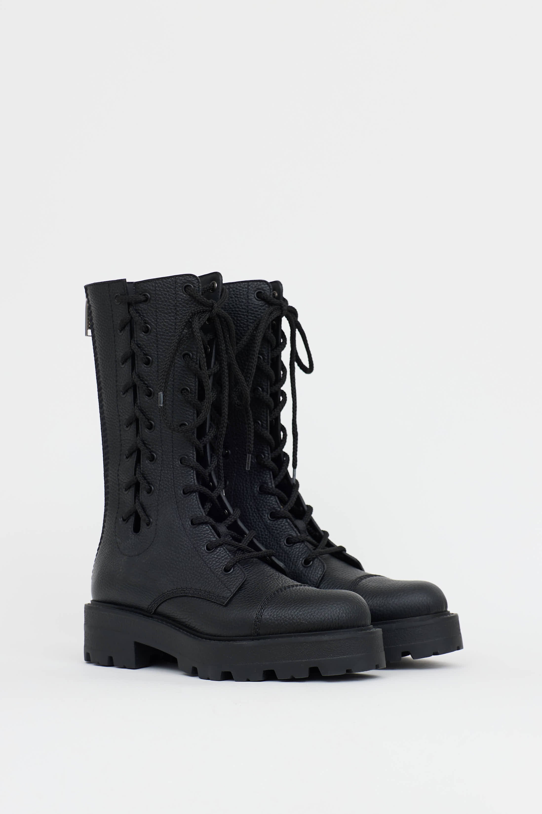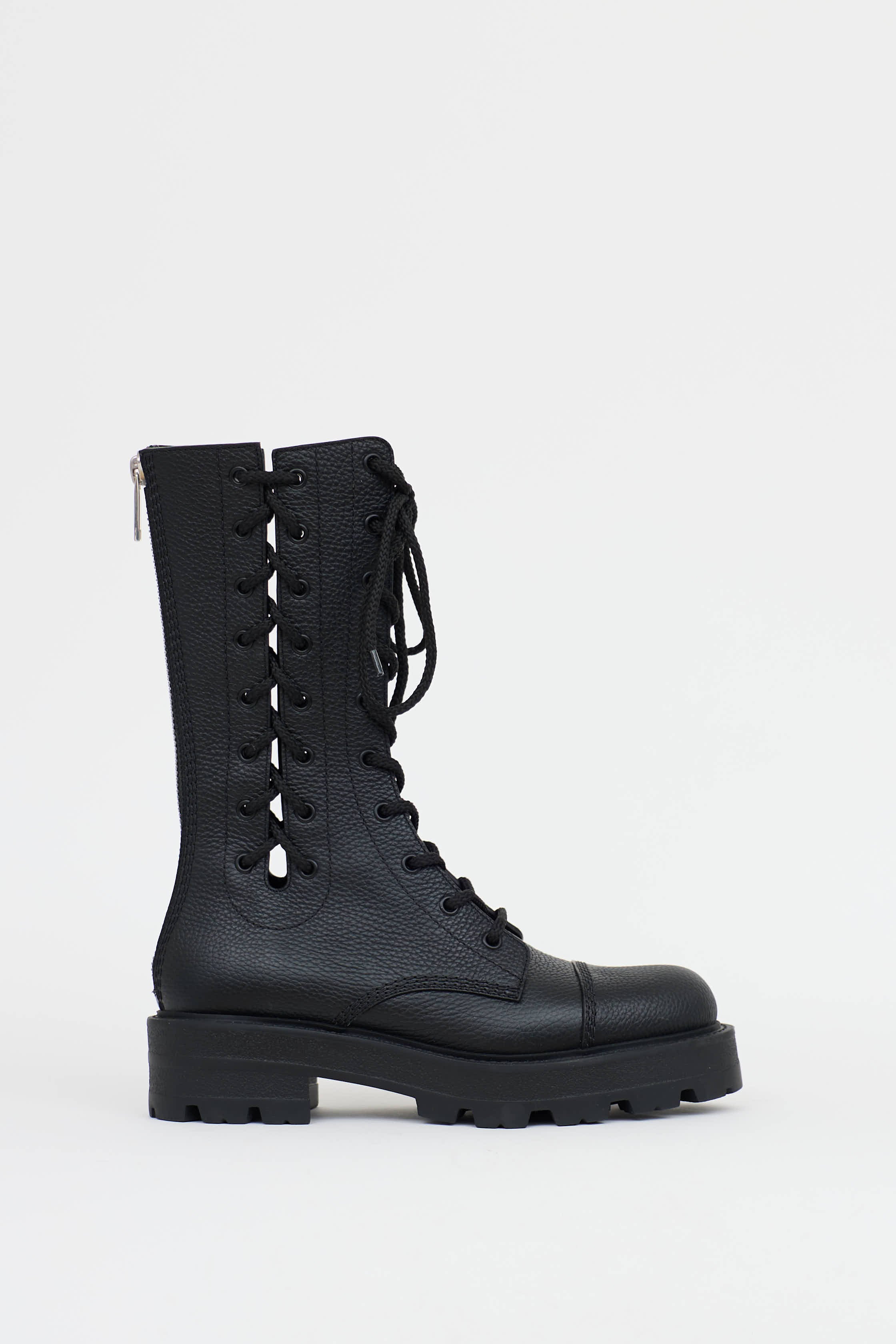 Pre-owned Dior black D Road Lace-Up boot featuring a rounded toe, leather uppers, cut out lace-up panels at shaft, embossed logo label at tounge, rubber lug sole, and silver toned zip at back.