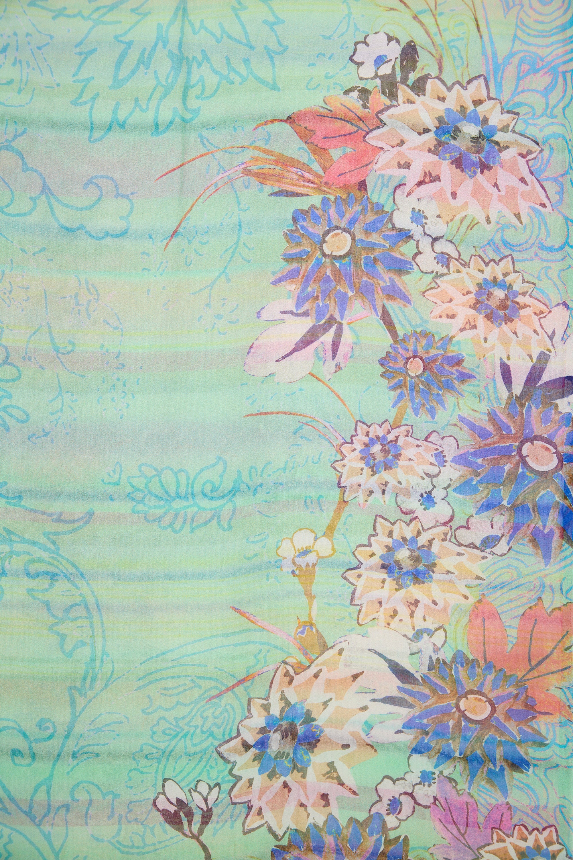 Pre-owned Etro multicolour silk scarf featuring double layer construction, floral printed side, one striped side, and raw edges.