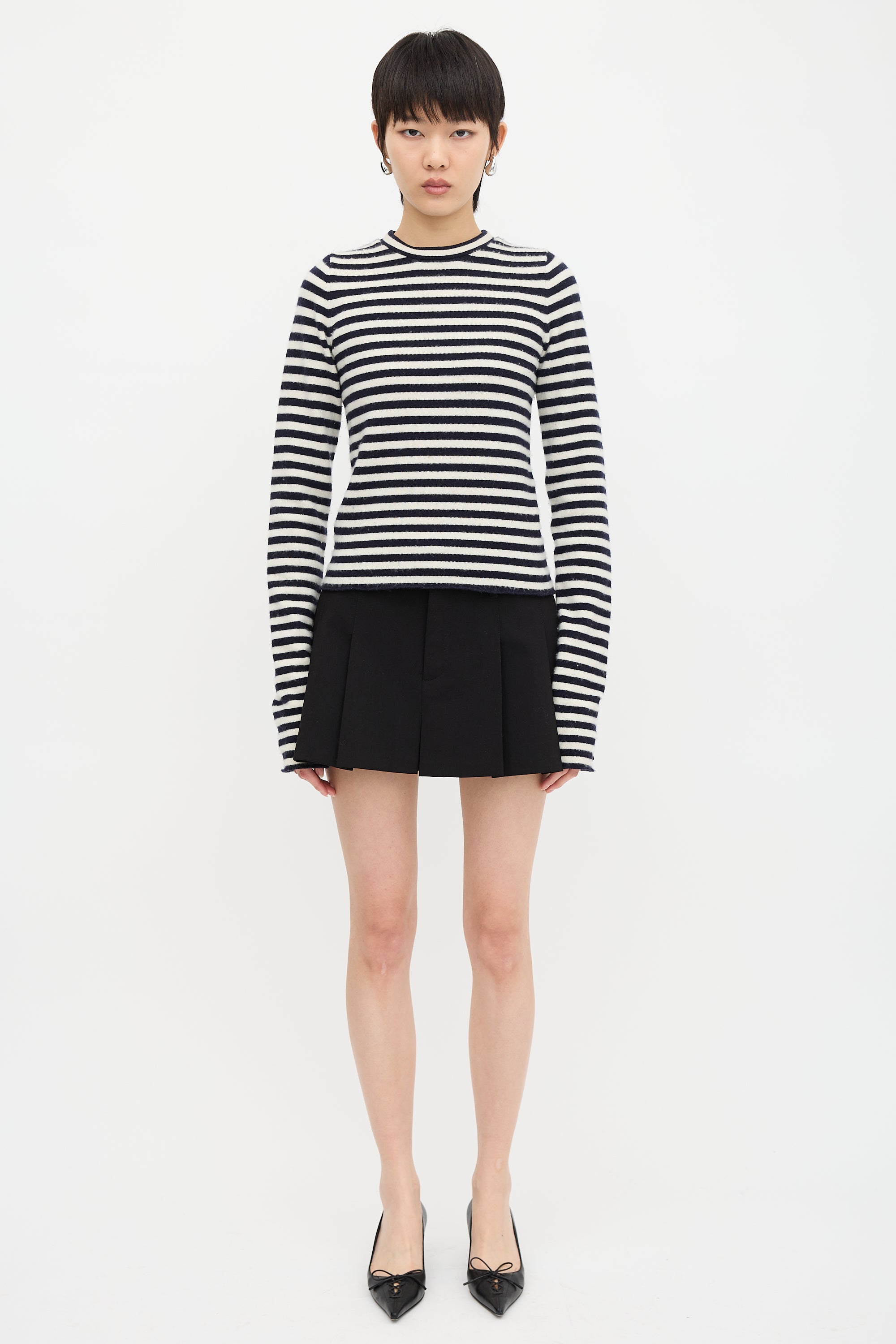 Pre-owned Extreme Cashmere navy and white cashmere blend sweater featuring crew neckline, multicolour embroidery at back neck, and horizontal stripes.