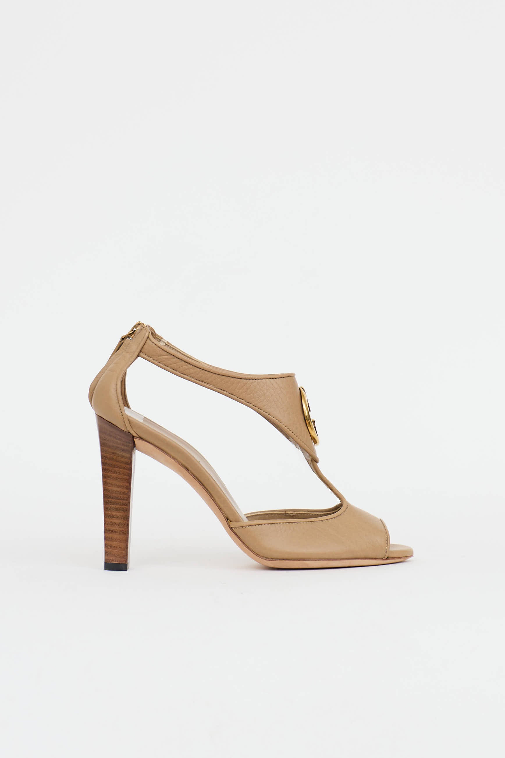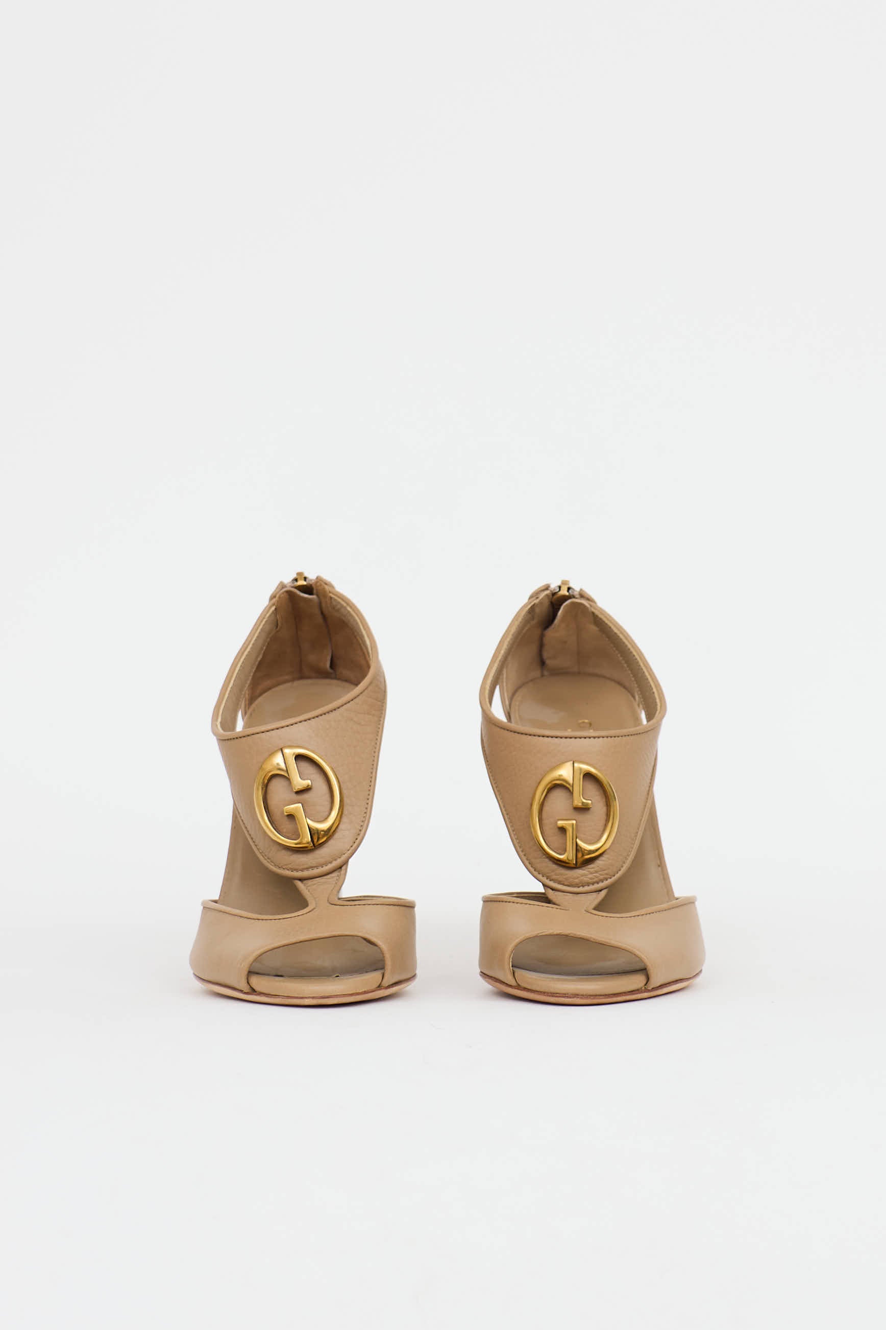 Pre-owned Gucci beige 1973 heels featuring a rounded open toe, T-strap with gold tone abstract GG logo, zip closure at counter, and a stacked wood block heel.