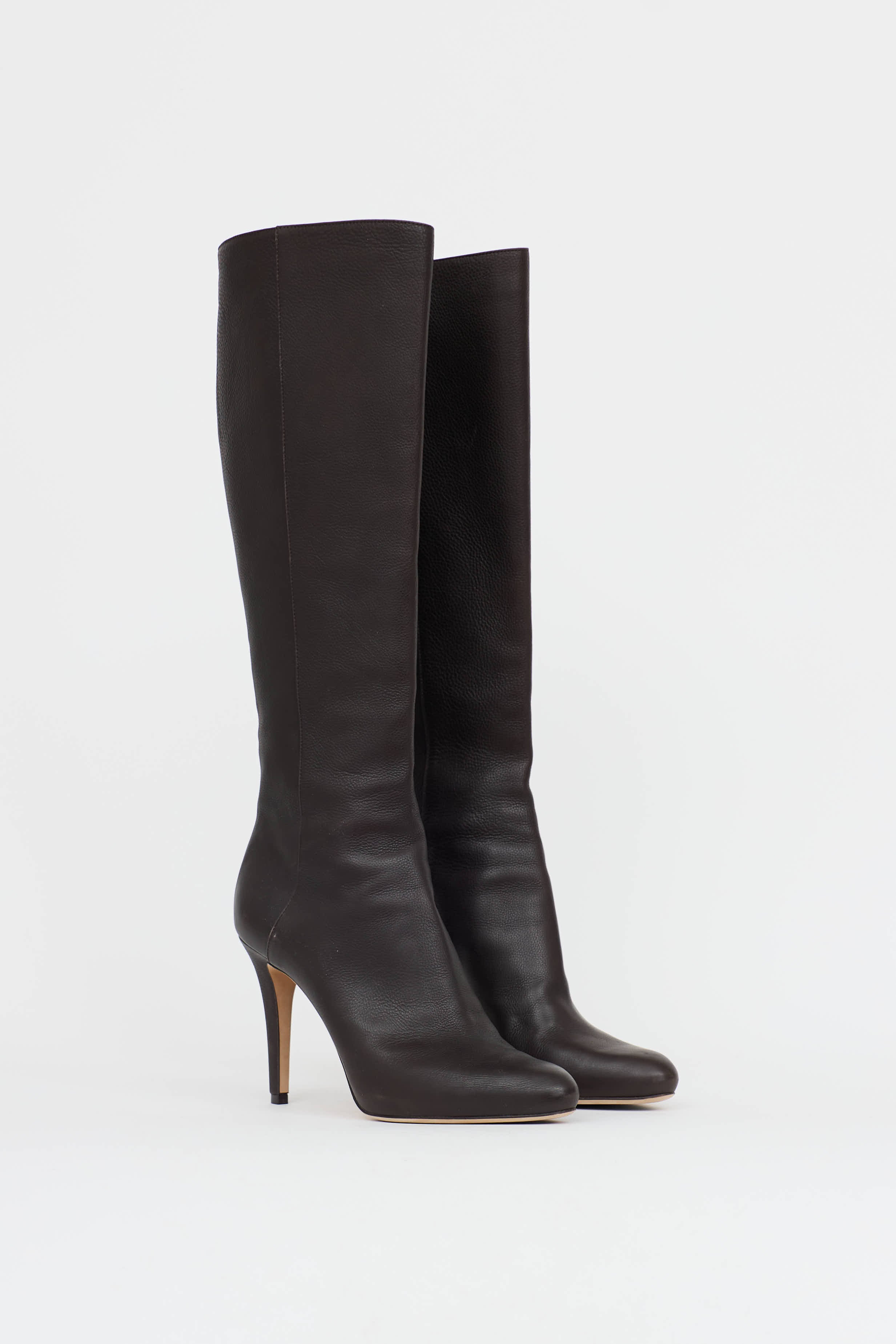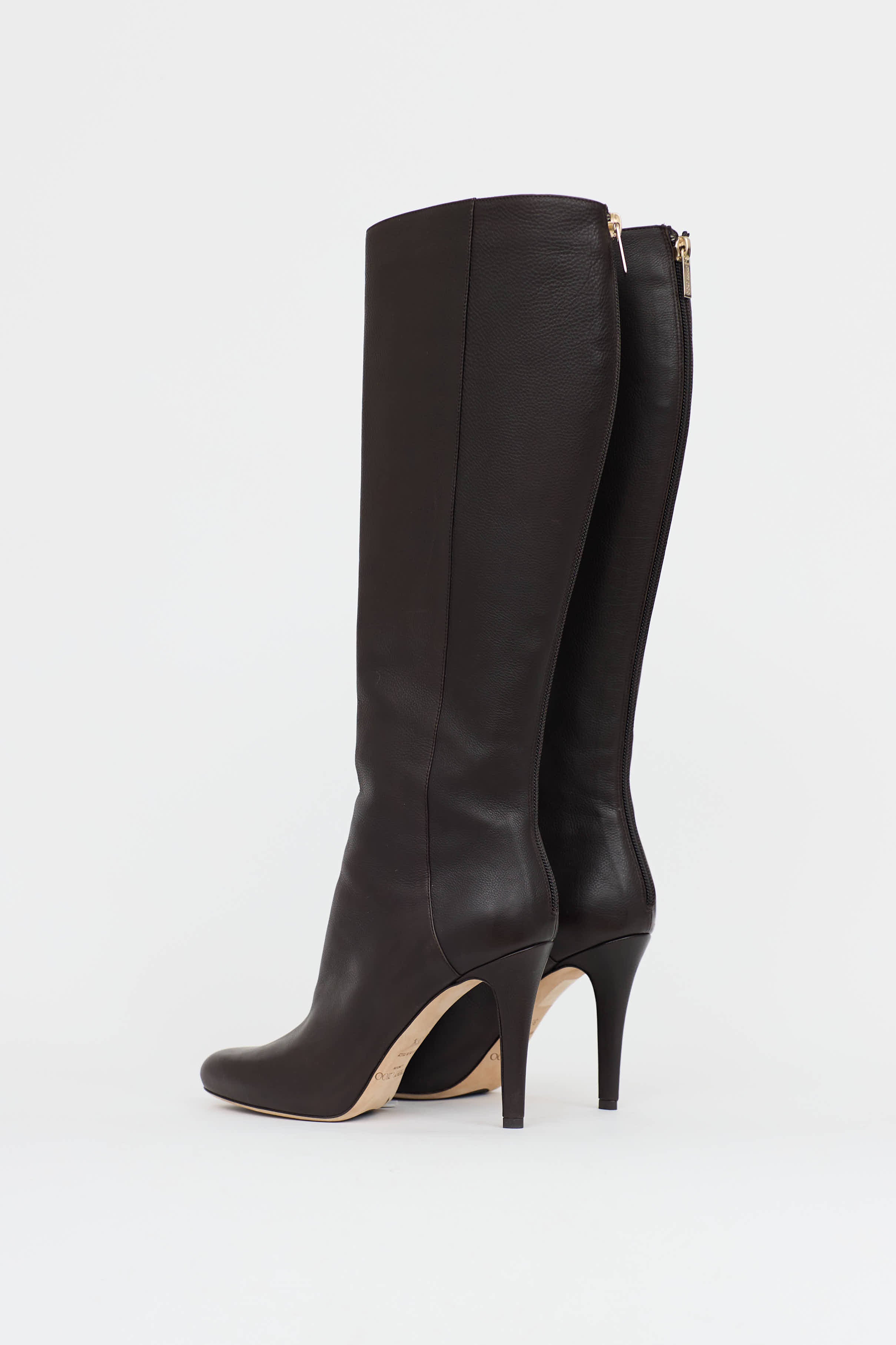 Pre-owned Jimmy Choo brown leather boot featuring a rounded toe, panelled leather upper, knee high shaft, gold toned zipper at back and a wrapped stiletto heel.