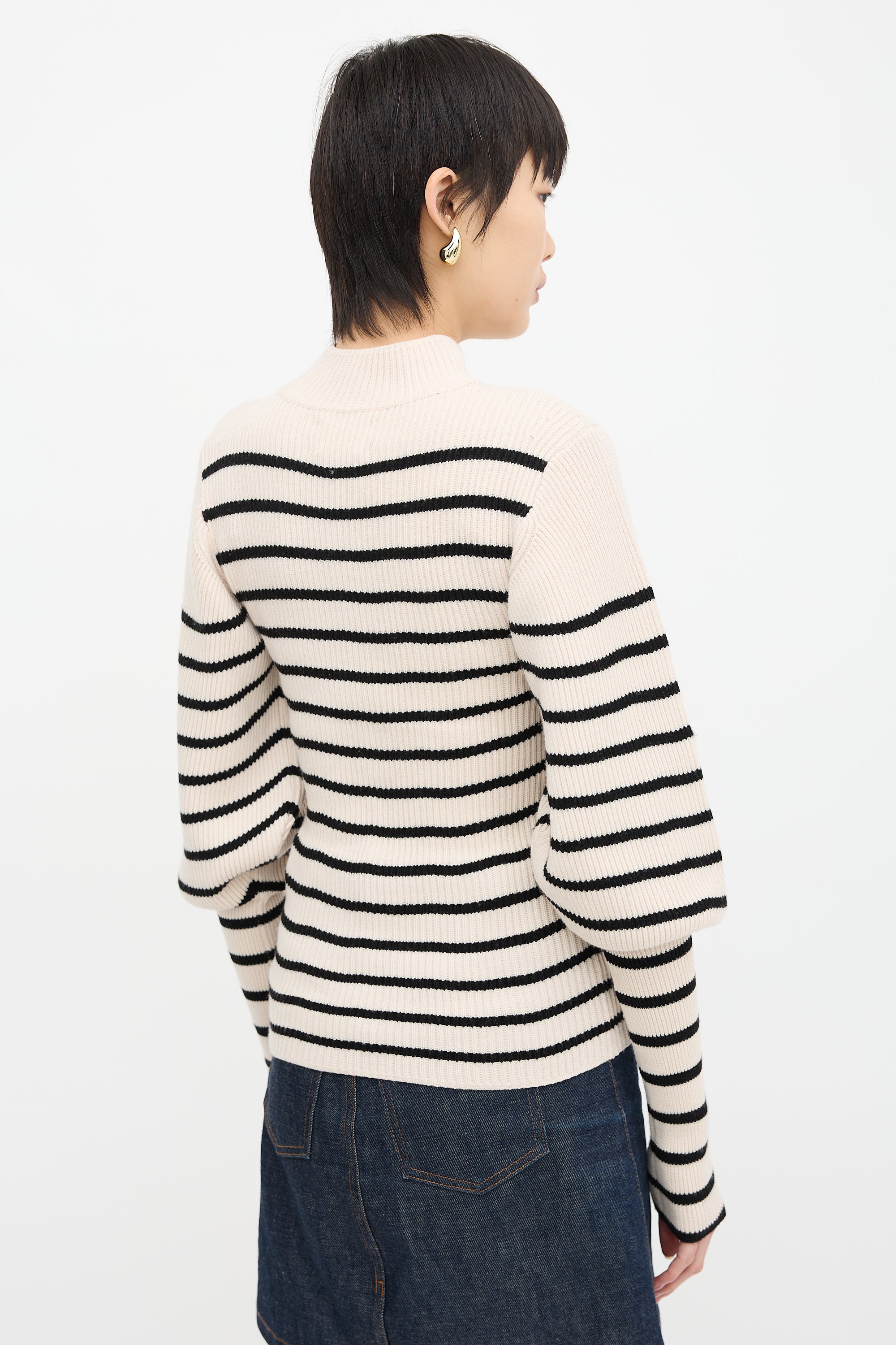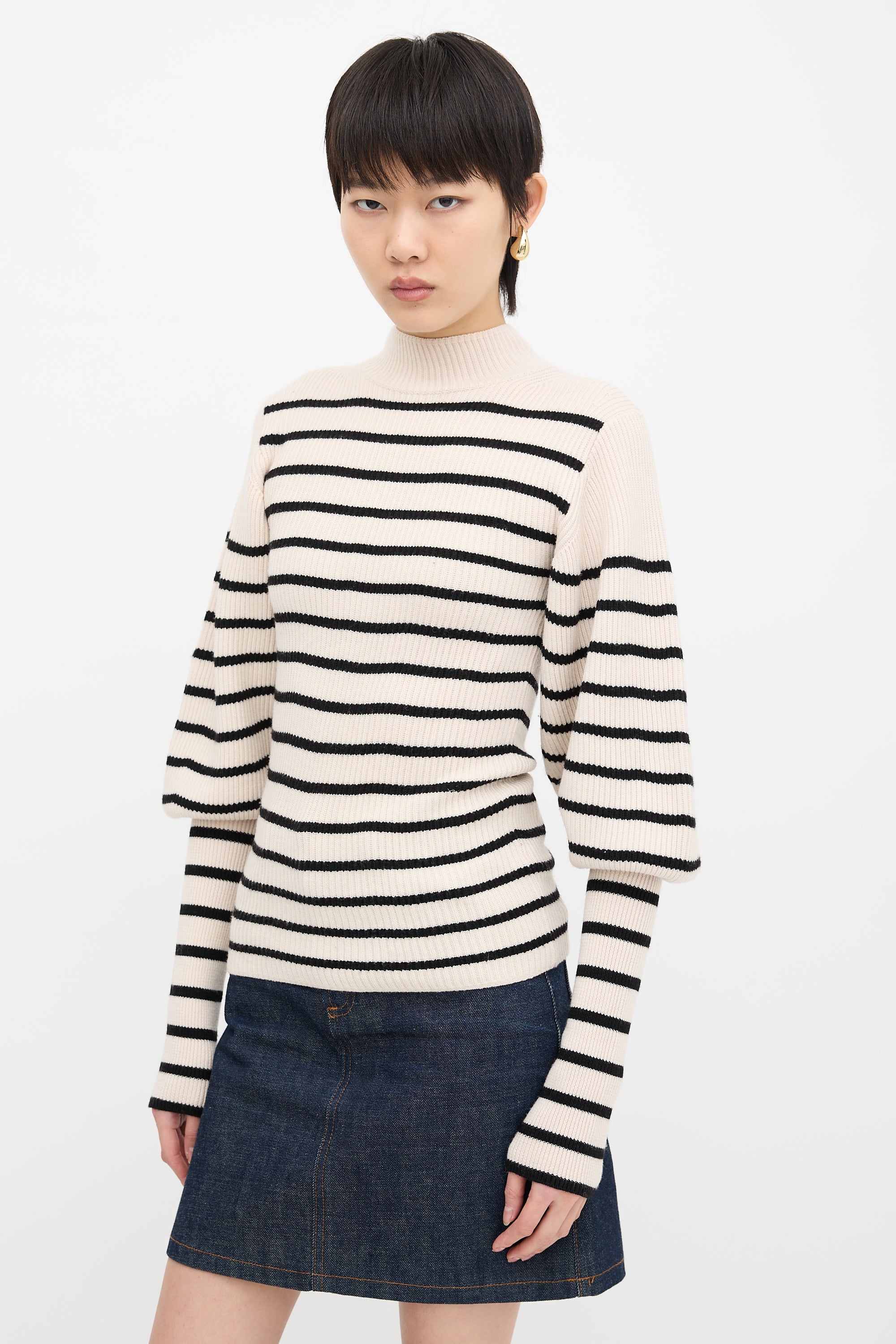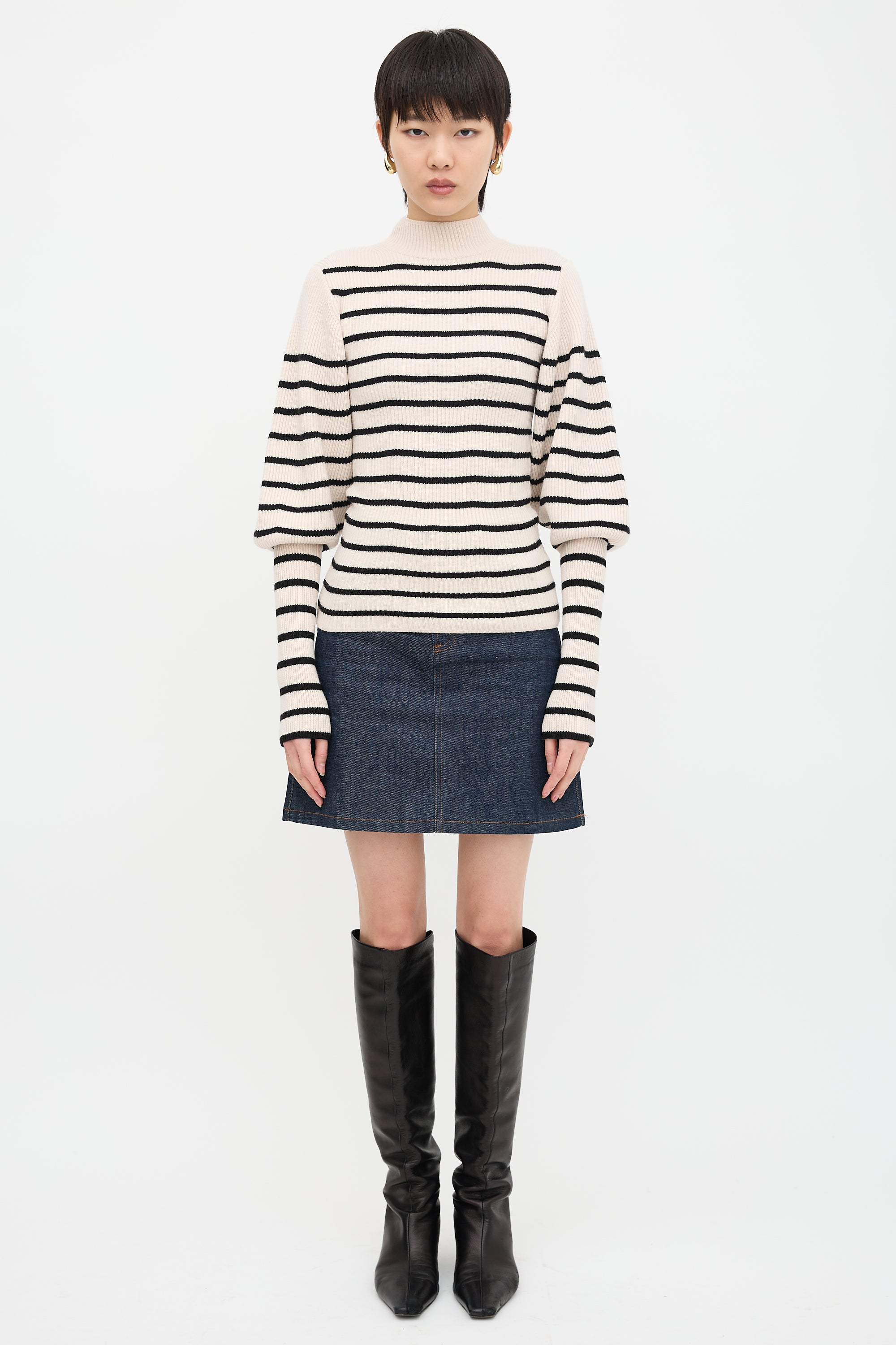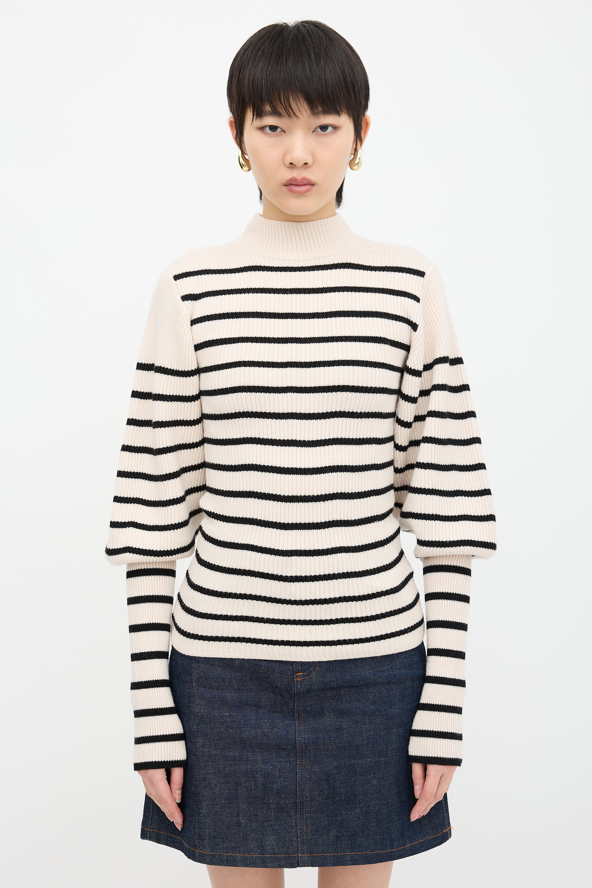 Pre-owned Khaite cream and black wool Joanne sweater featuring mock neck, horizontal stripes, and ribbed collar and sleeves.