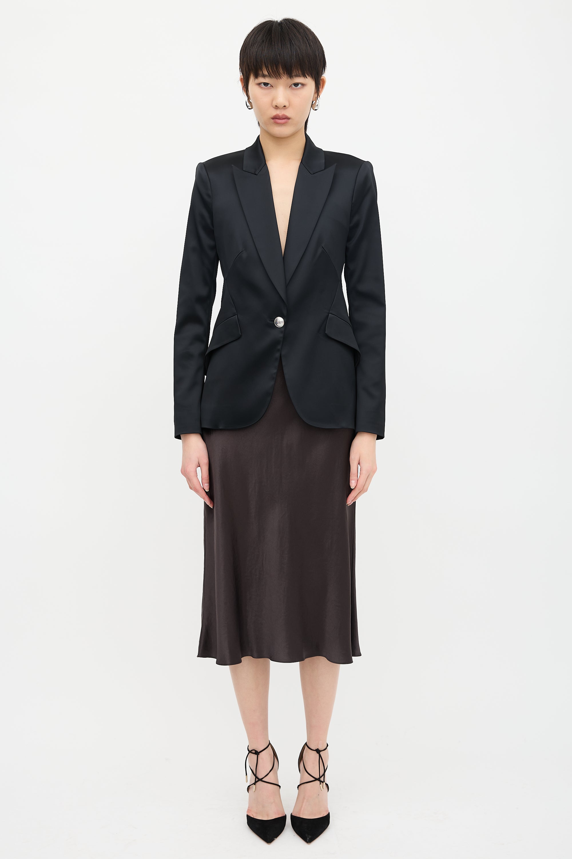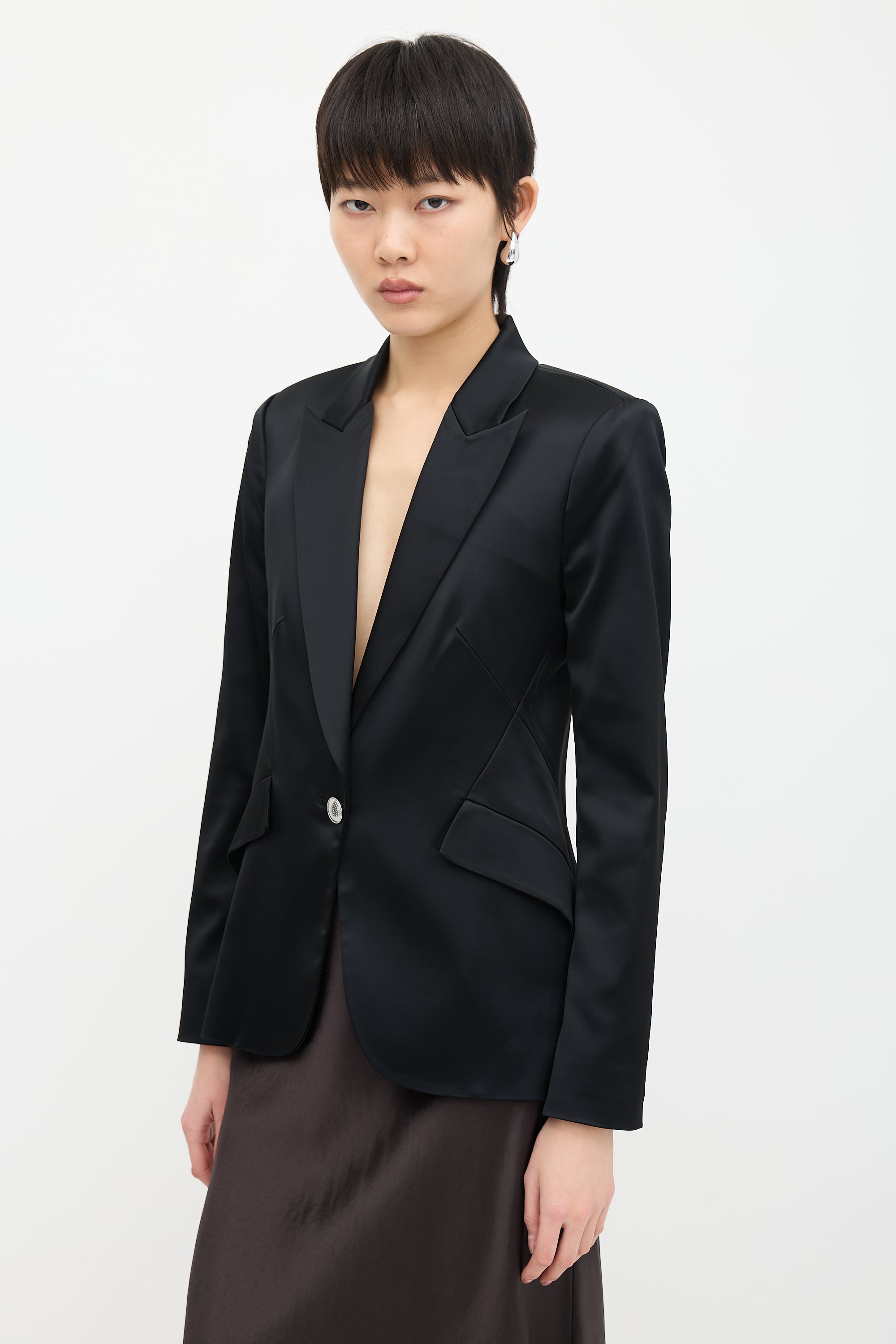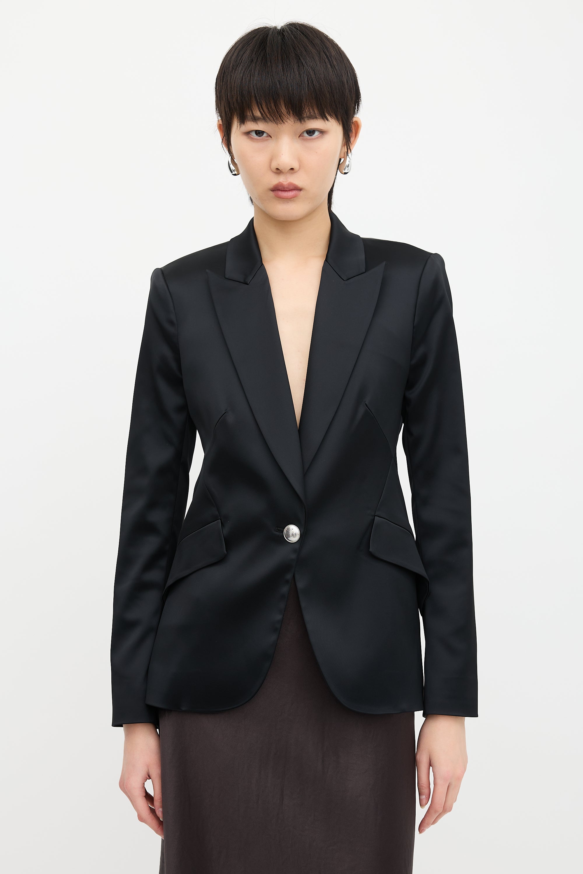 Pre-owned L'Agence black satin blazer featuring peak lapel, single button front closure, two front flap pockets, back double vent, padded shoulders, and buttoned cuffs. Lined.