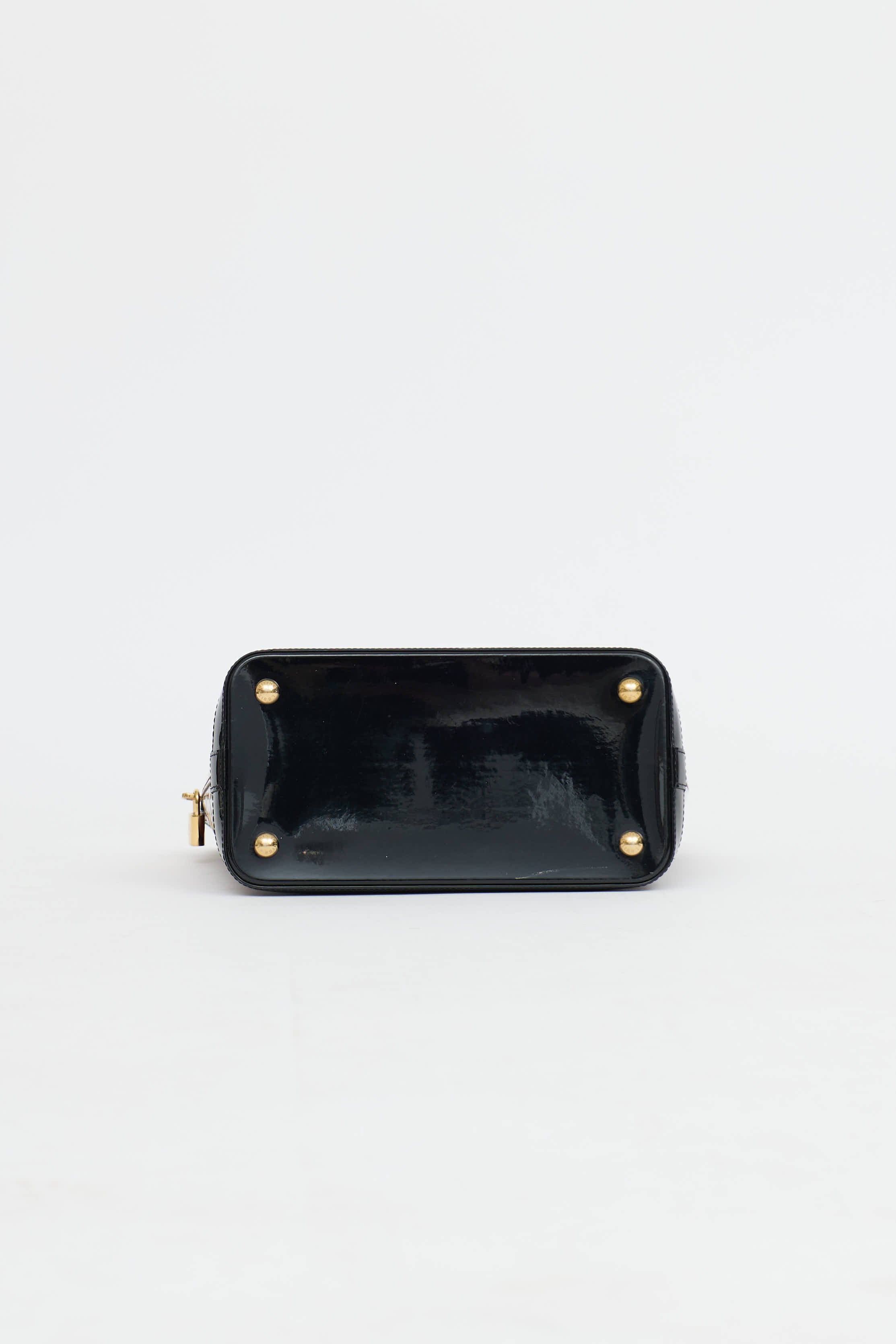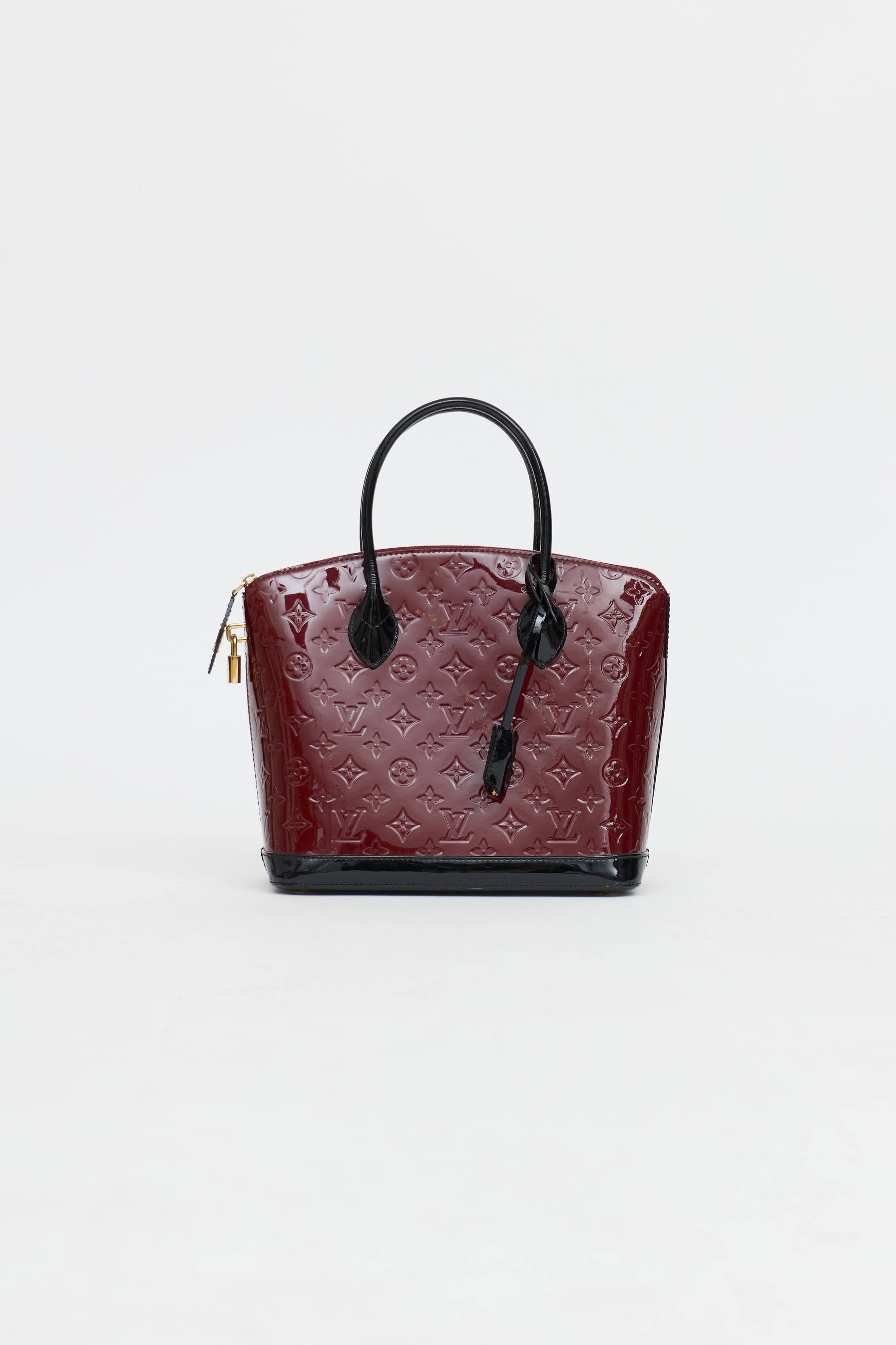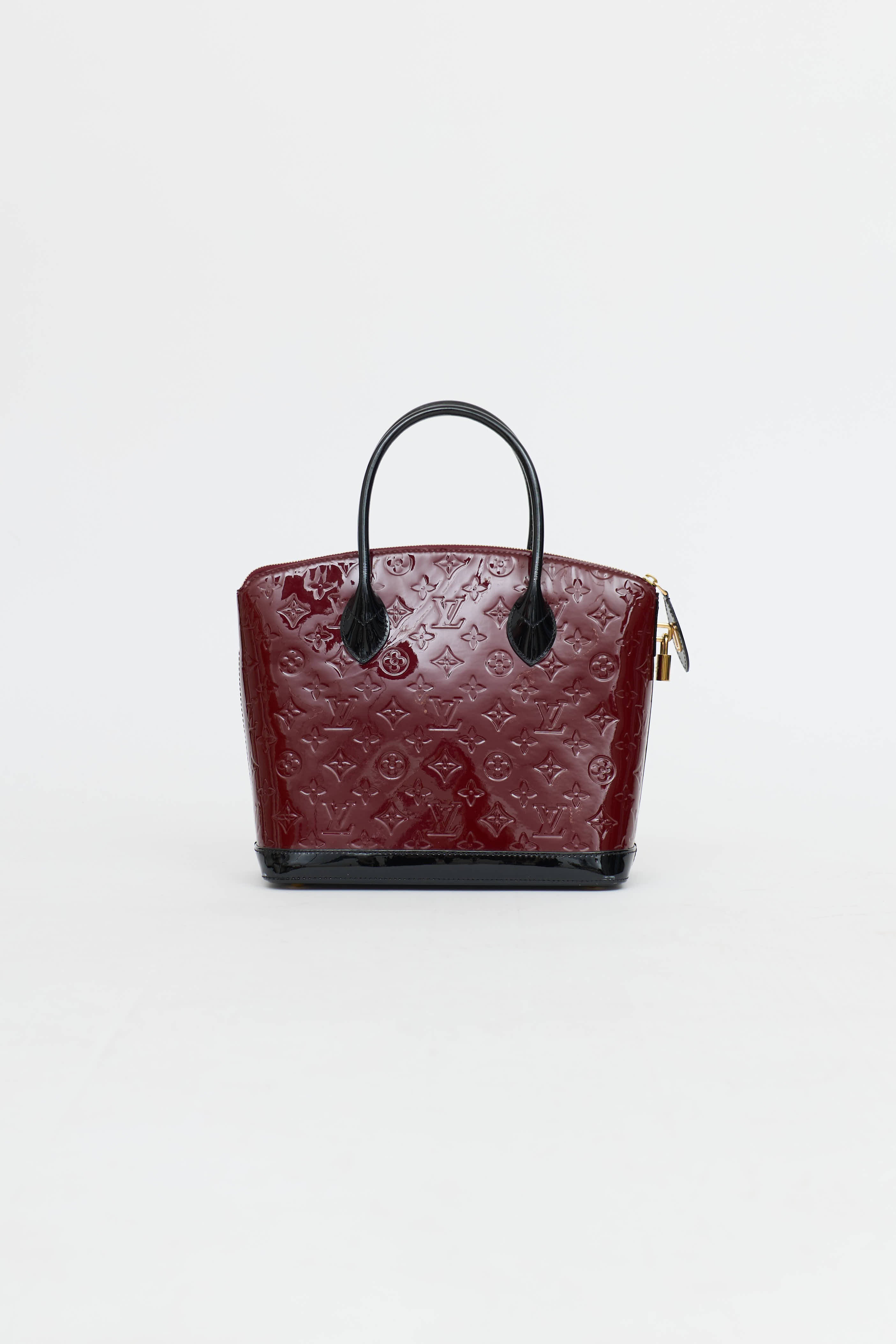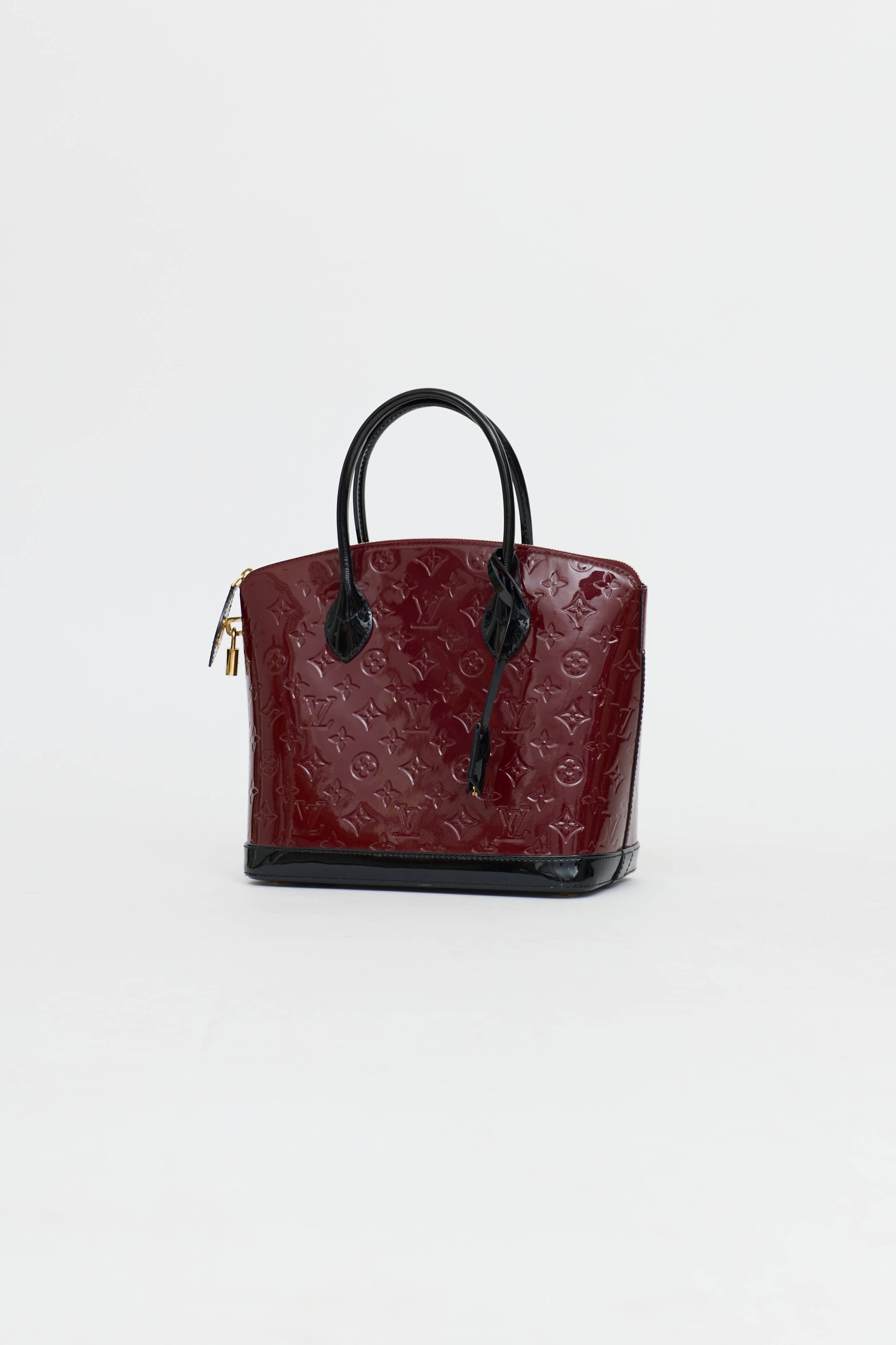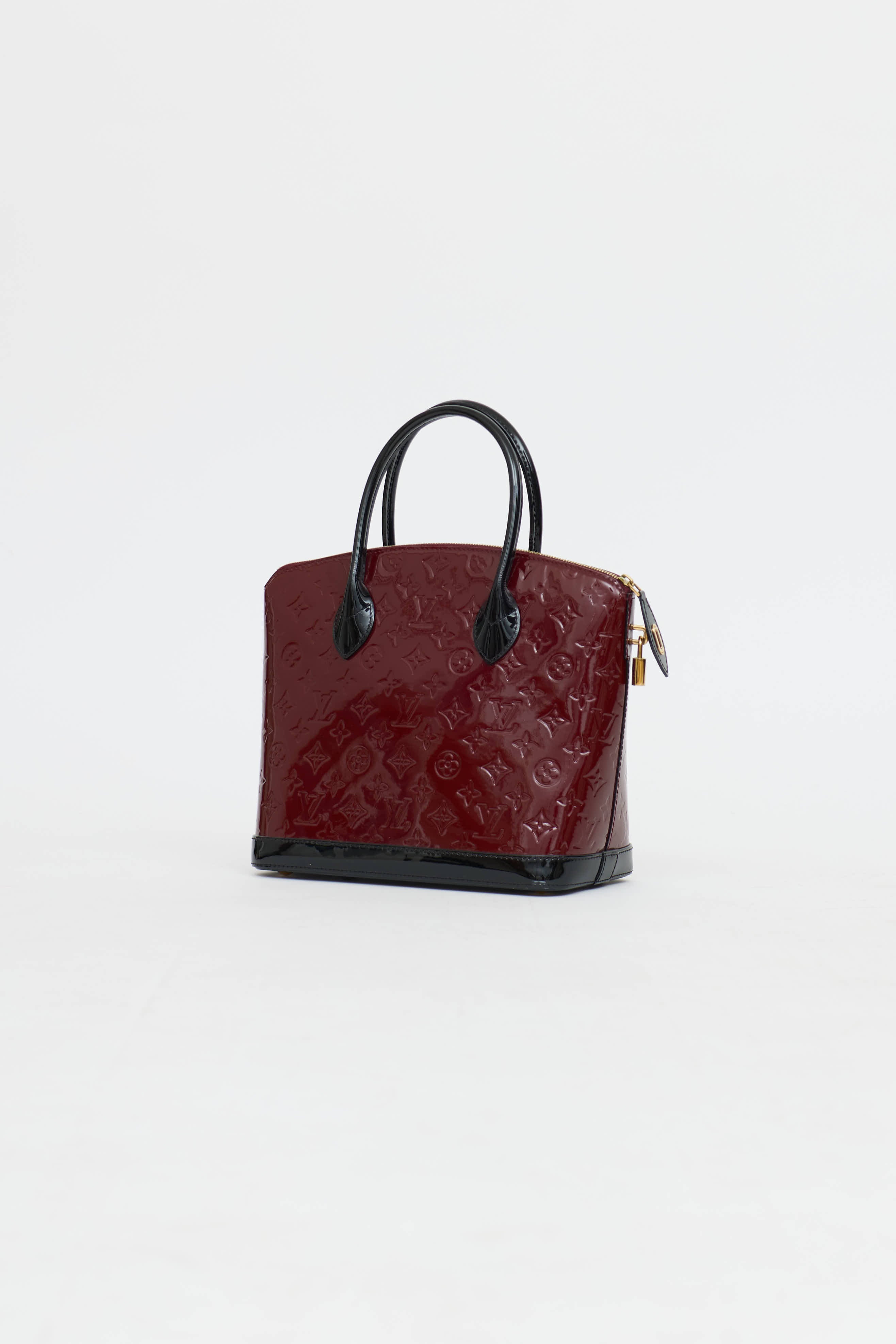Pre-owned Louis Vuitton red and black Vernis Lockit bag featuring patent leather upper, embossed monogram, dual rolled top handle, structured base with metal feet, lock and keys, gold tone hardware, top zip, one main compartment with two slip pockets, and one zip pocket.