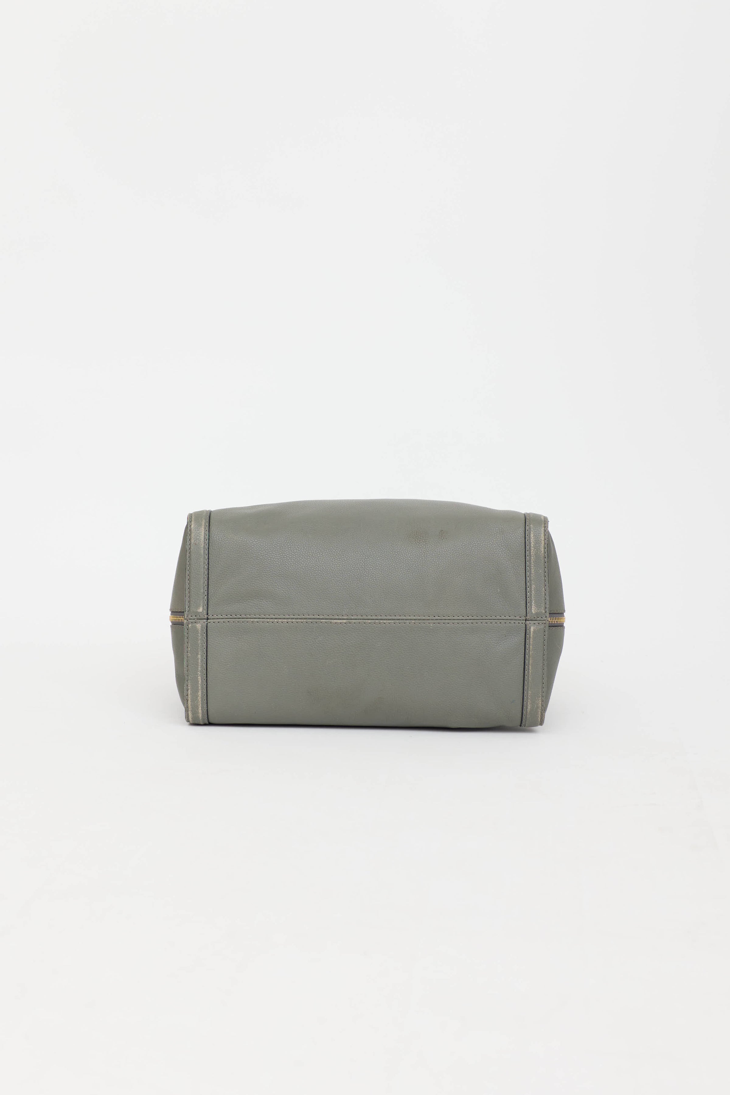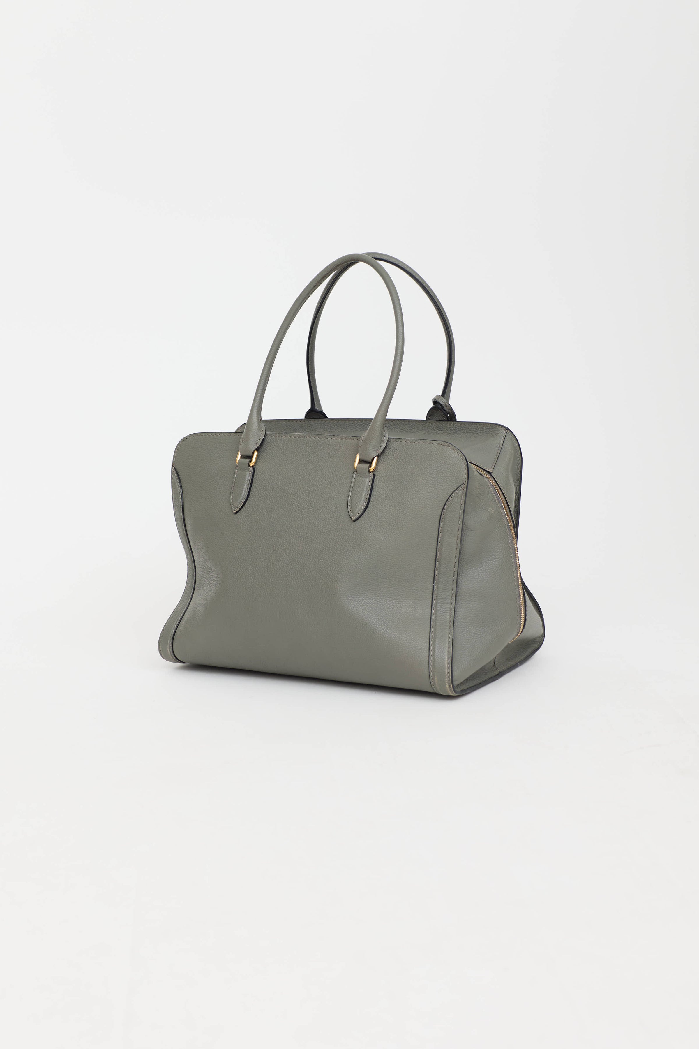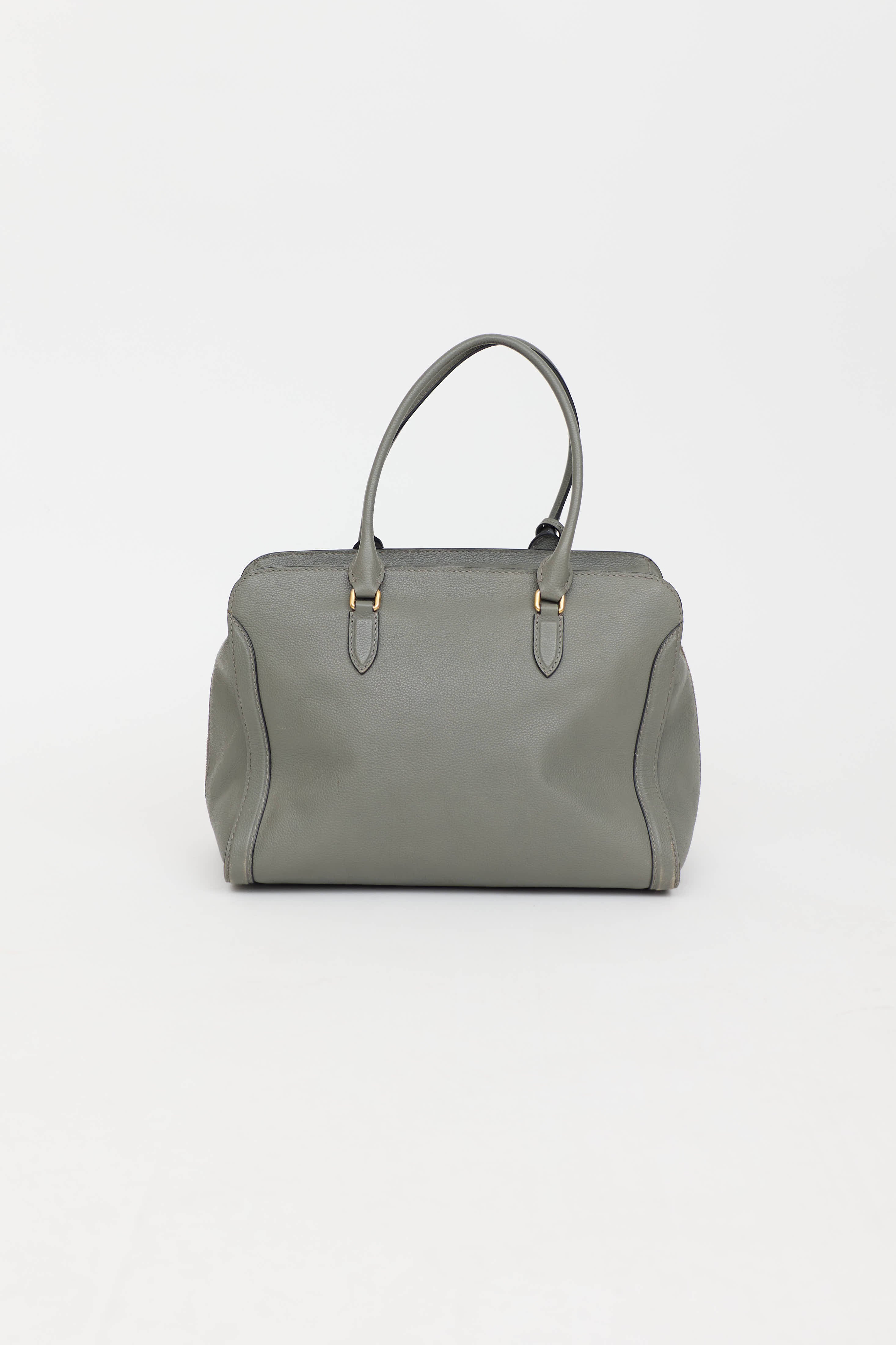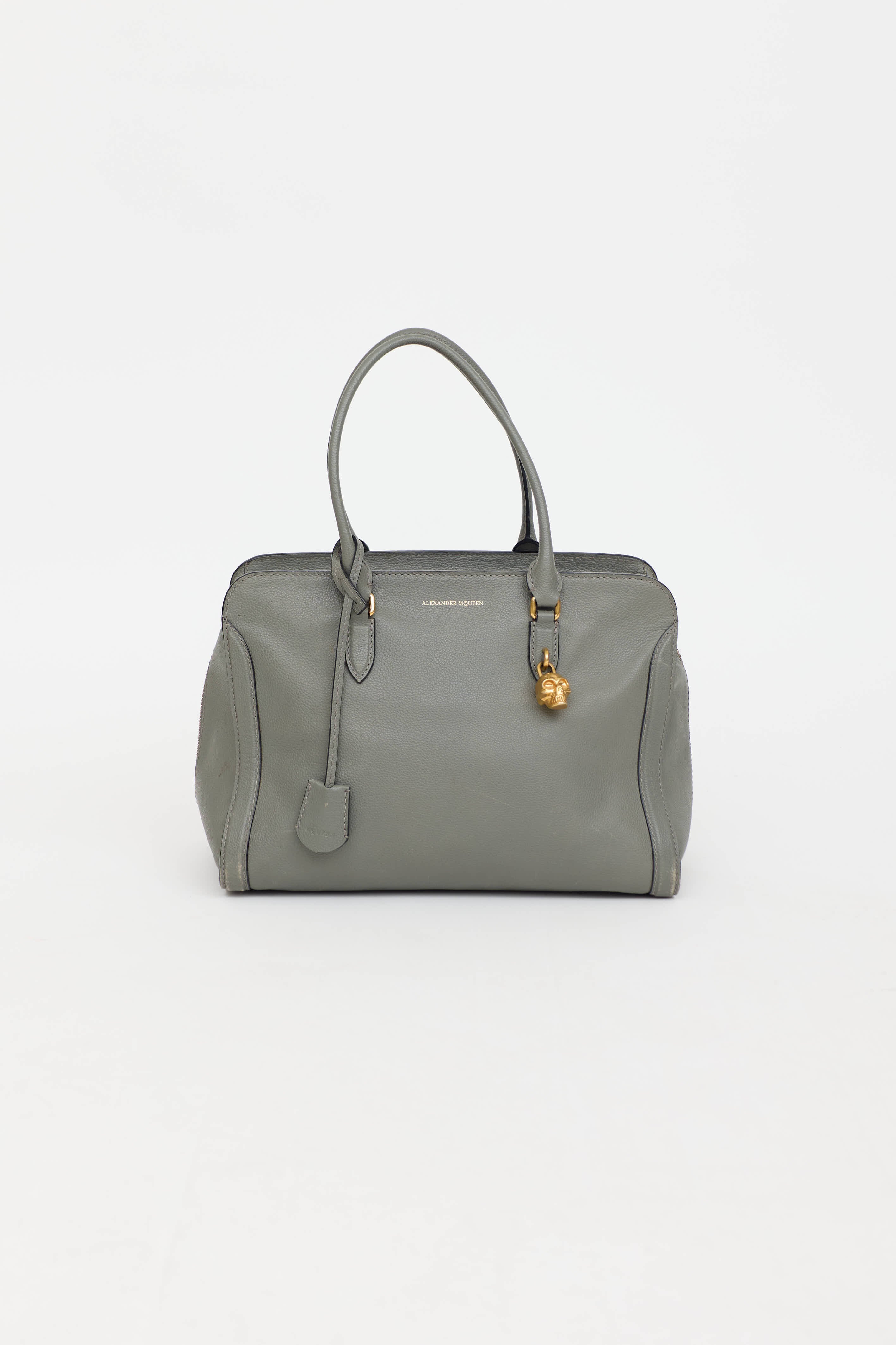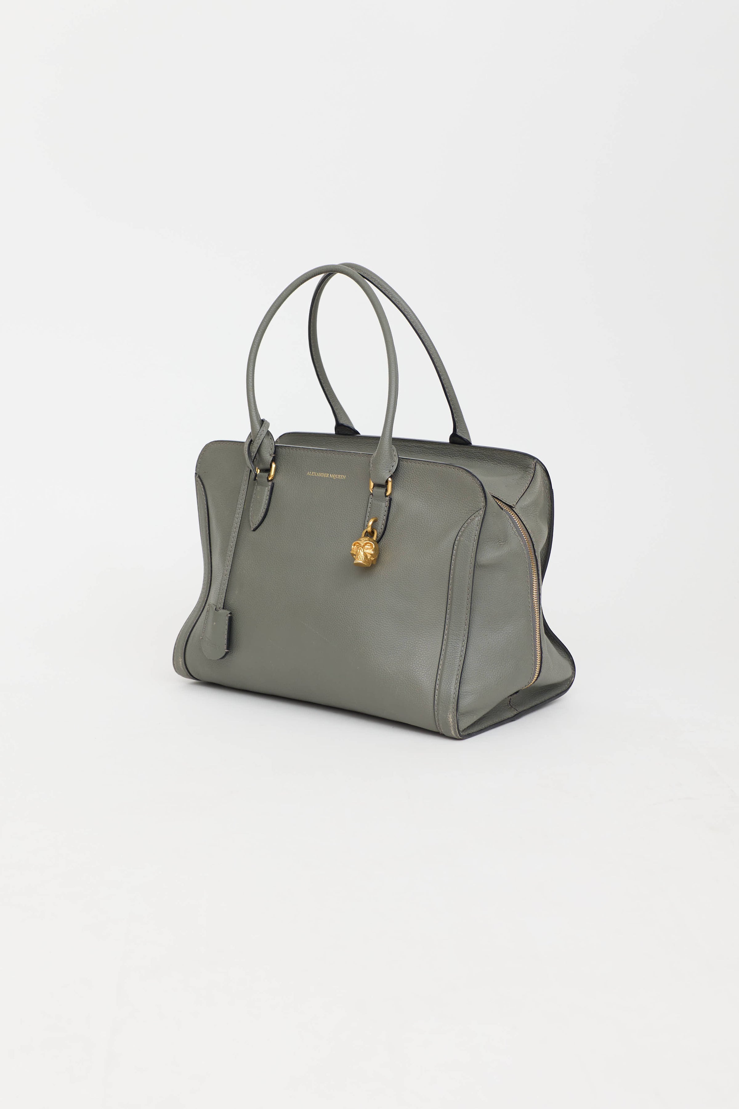 Pre-owned Alexander McQueen grey large bag featuring dual rolled top handles, gold tone hardware, skull padlock with key clochette, double top zip closure with one main compartment, one zip pocket, and two slip pockets.