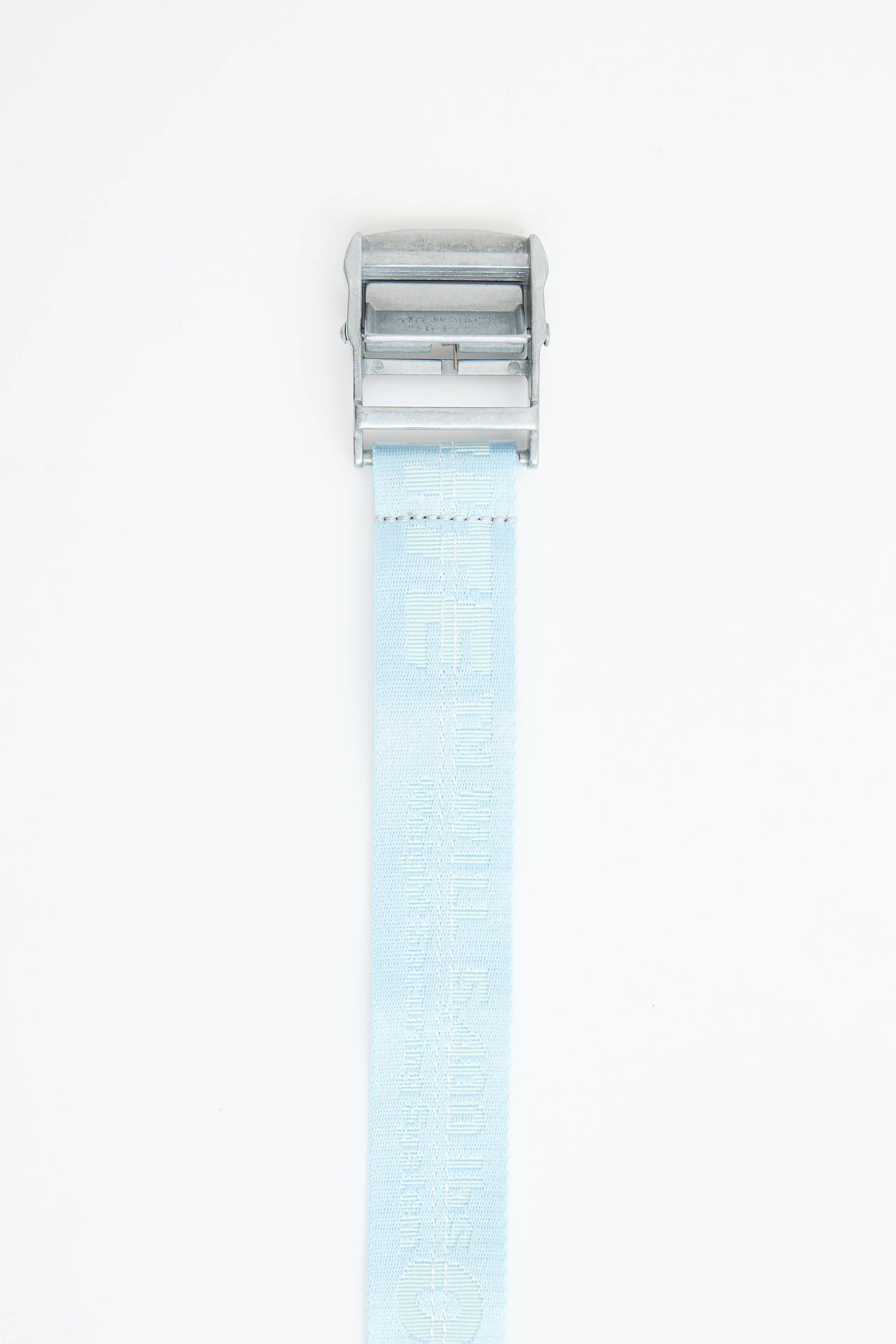 Pre-owned Off-White blue Industrial belt featuring tonal repeating logo web strap, brushed silver tone hardware with Off-White logo, and bar loop buckle.
