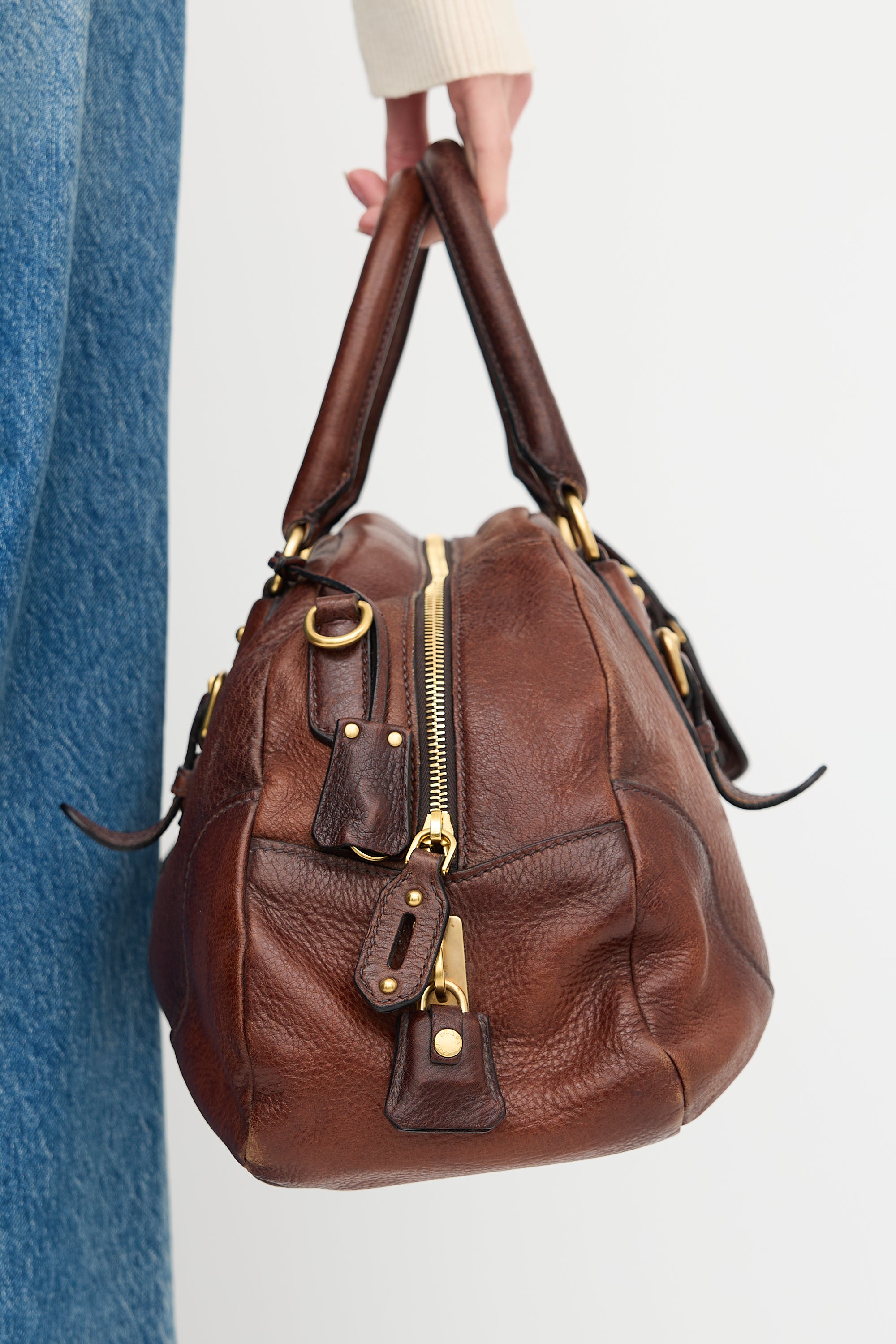 Pre-owned Prada brown patina leather bowling bag featuring gold tone hardware, four feet, logo embellishment at top front, dual rolled top handles, removable luggage tag, removable and adjustable shoulder strap, top zip closure, and one lined main compartment with one zip pocket and one slip pocket.