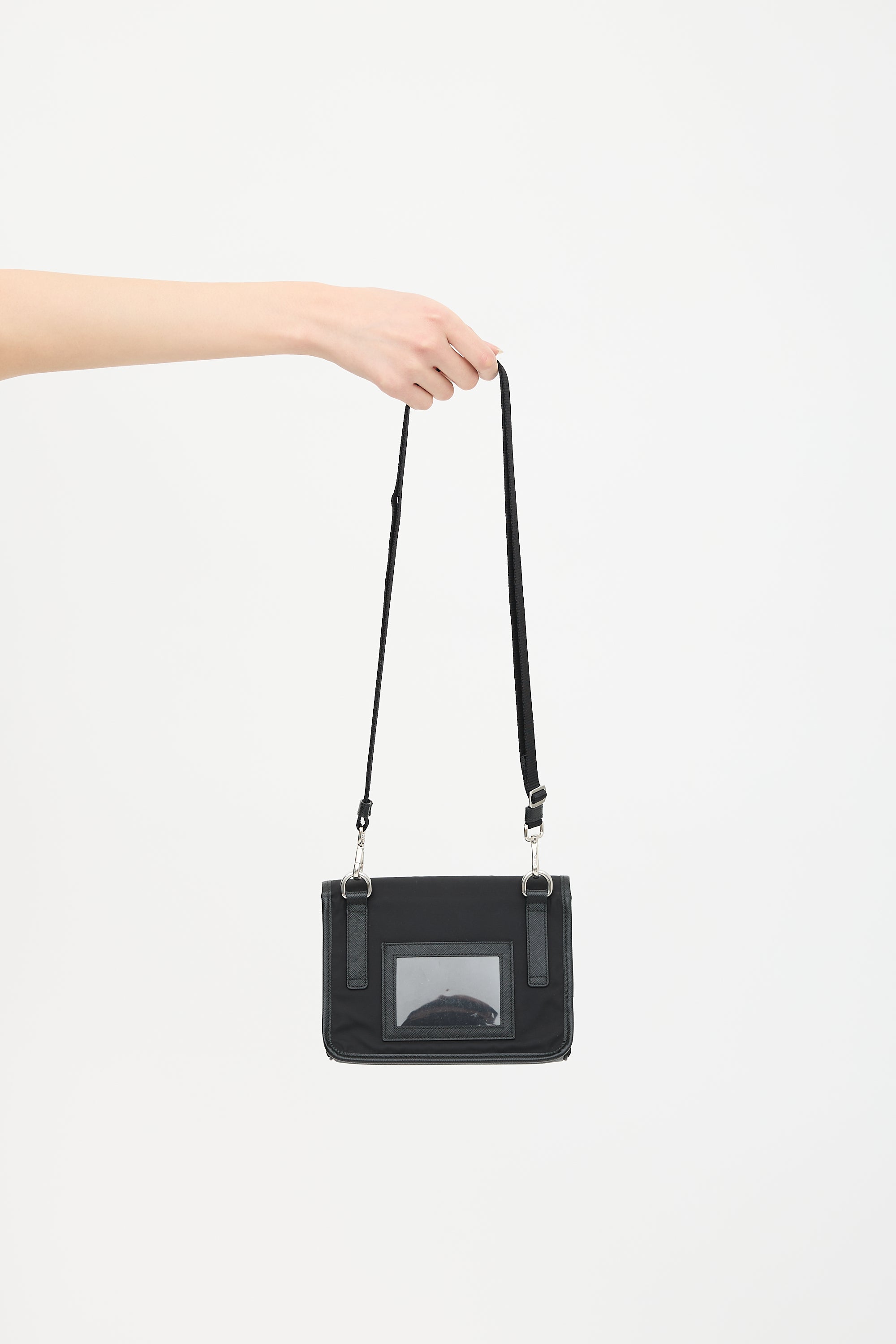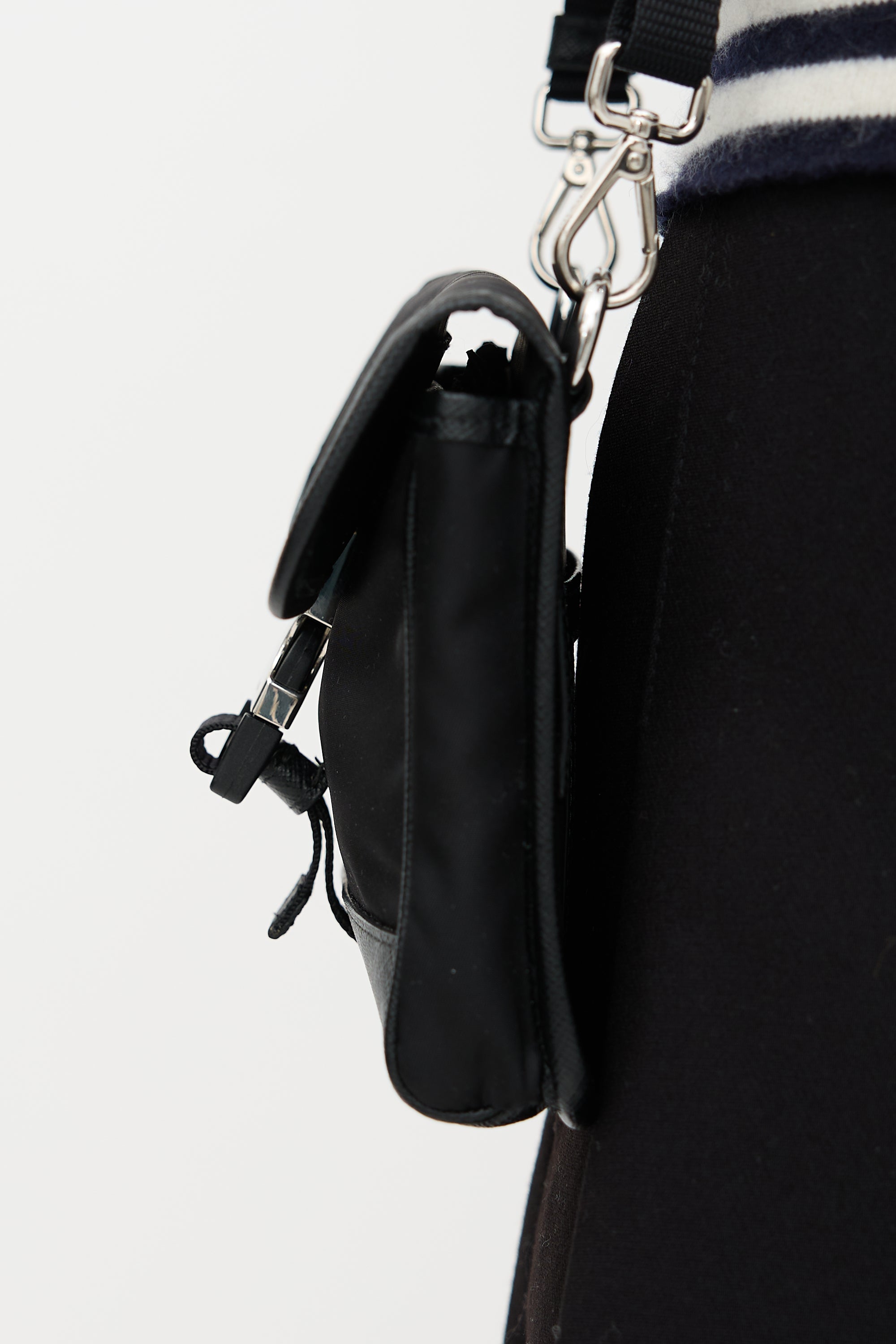 Pre-owned Prada black Re-Nylon and Saffiano leather phone case crossbody bag featuring front flap with triangle logo plaque, black window slip pocket, removable and adjustable shoulder strap, quick release buckle closure, and one lined main compartment with one slip pocket.