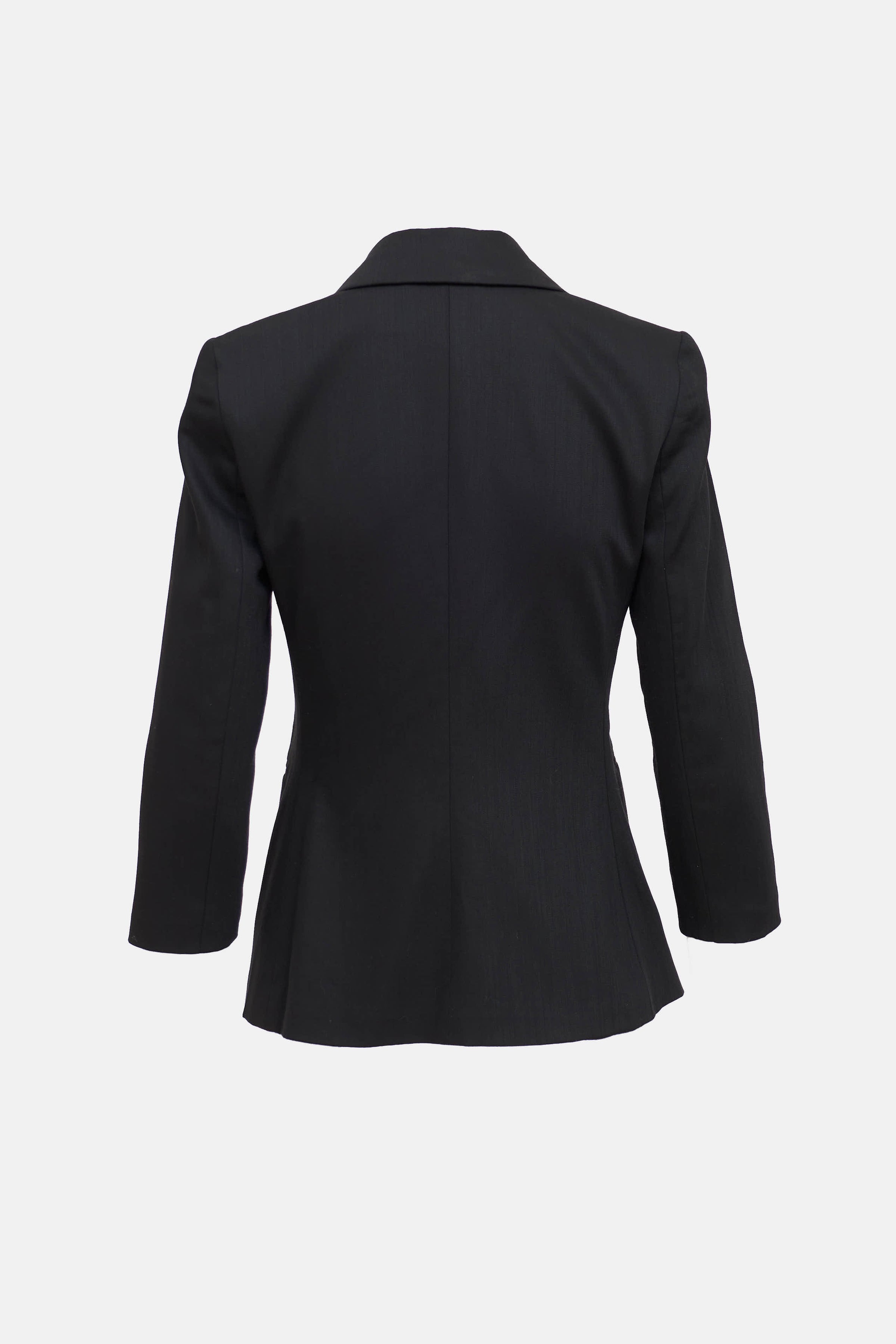 Pre-owned The Row black blazer featuring notched lapel, one welt pocket at chest, two double welt pockets at hip, and button up closure. Lined.