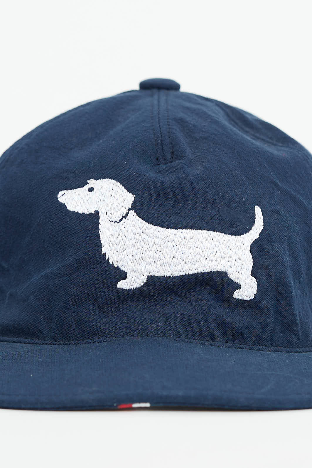 Pre-owned Thom Browne navy Hector baseball cap featuring white embroidered dog at front and adjustable webbed signature stripe strap with gold tone buckle.