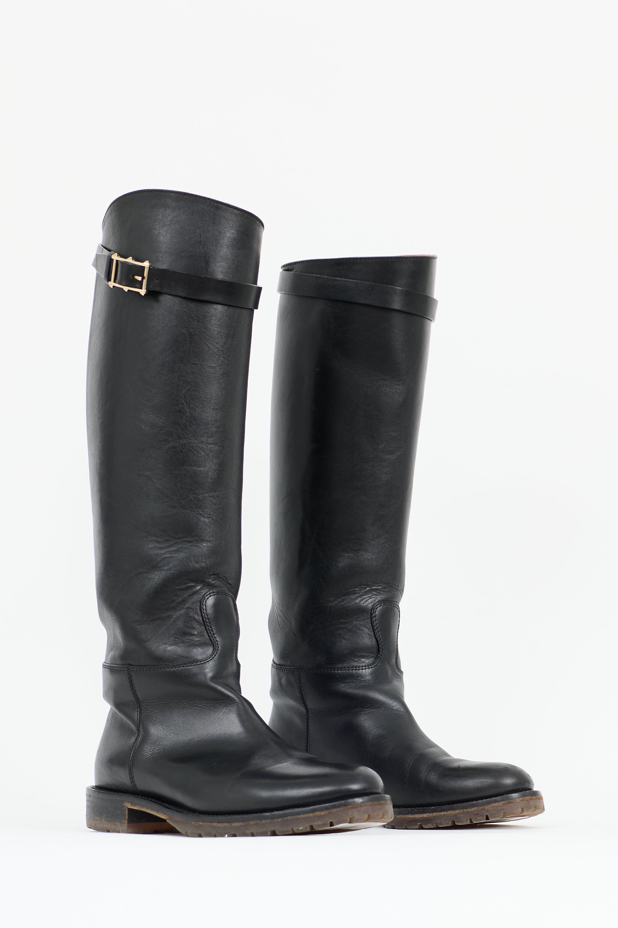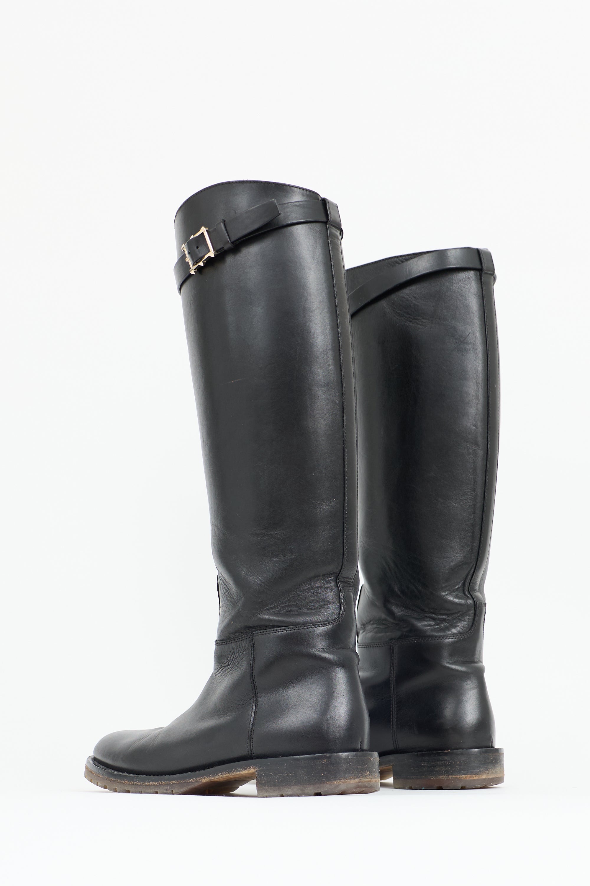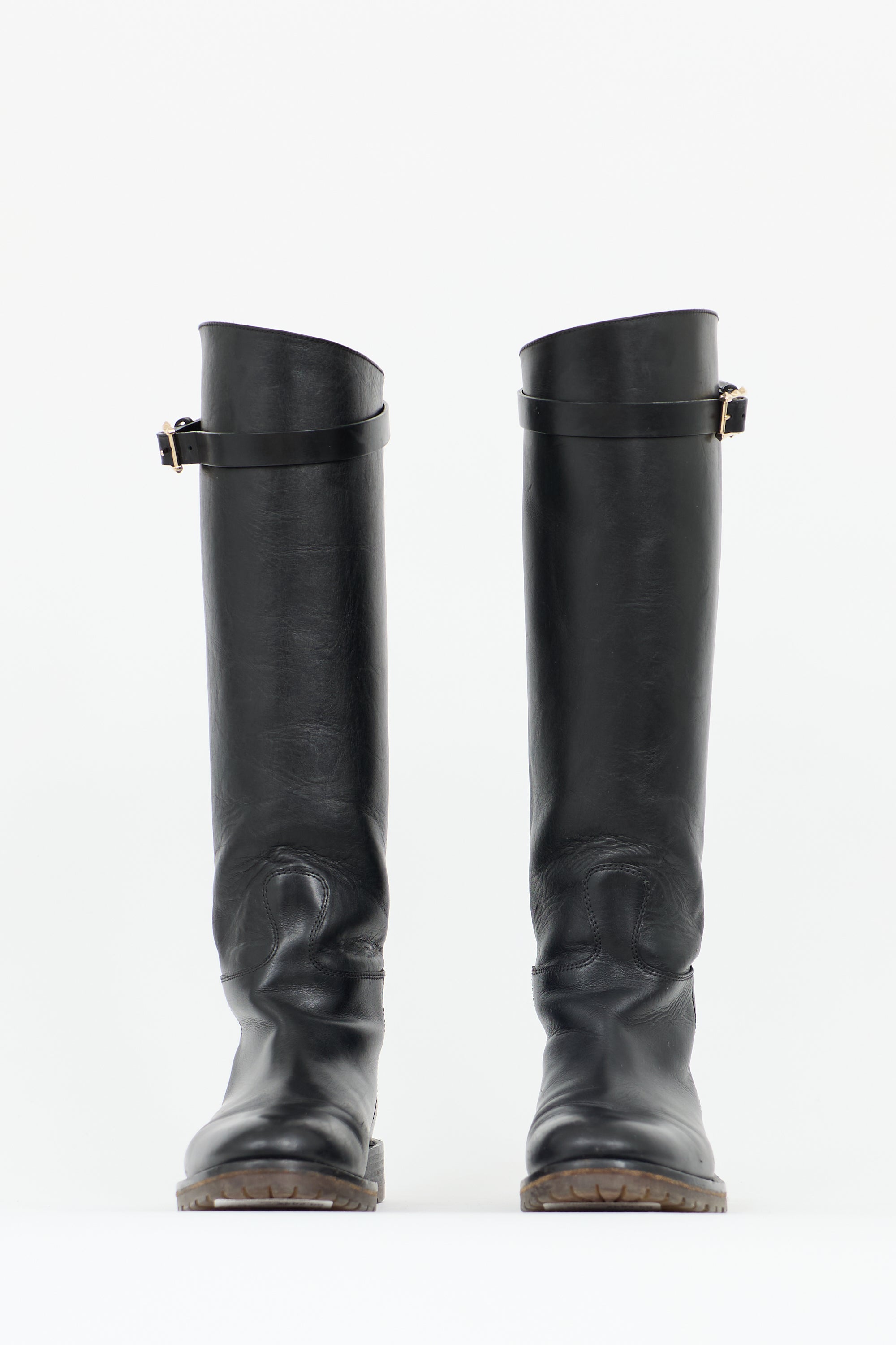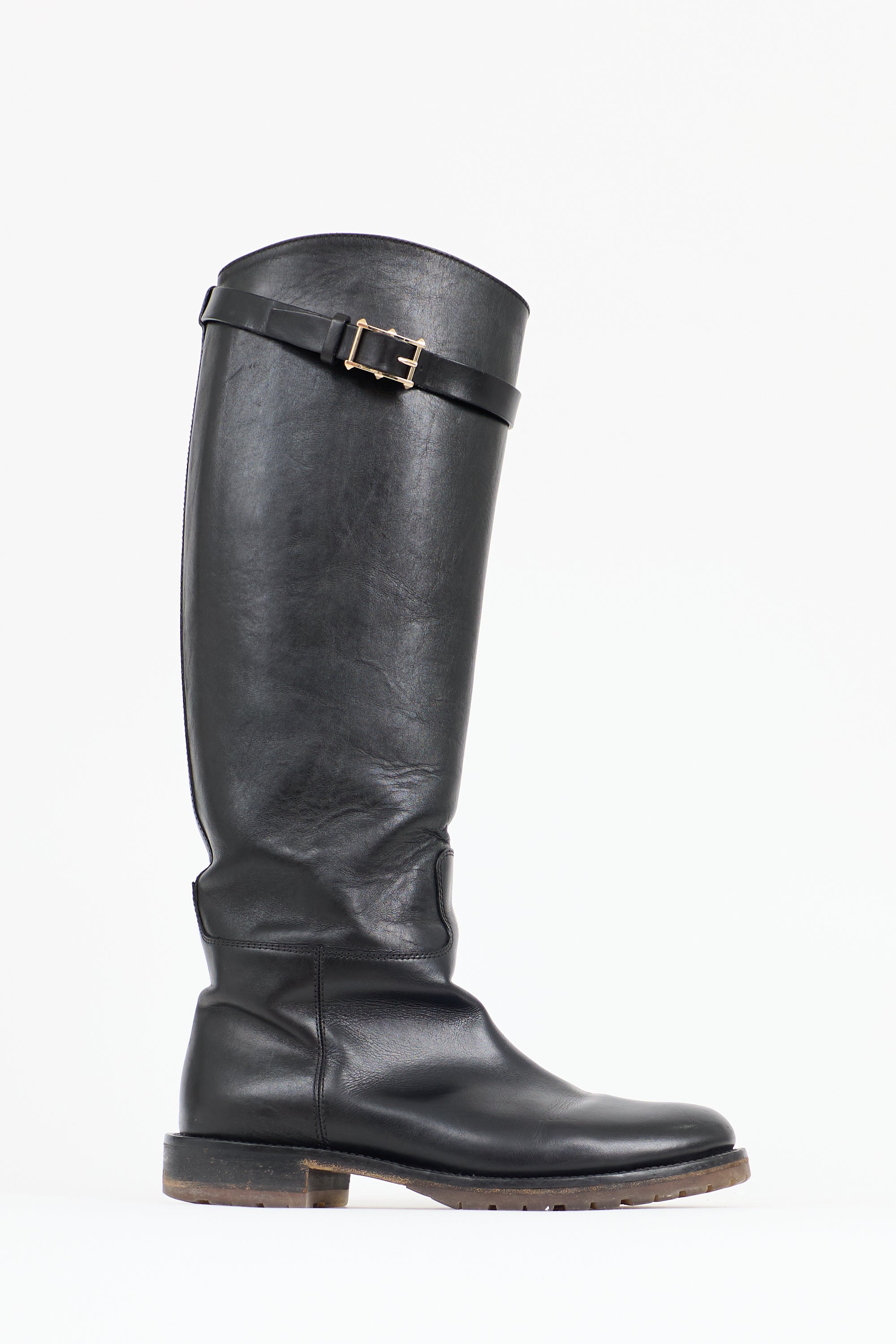 Pre-owned Valentino black leather knee high boots featuring rounded toe, adjustable topline strap with Rockstud detail at buckle, and rubber outsole.