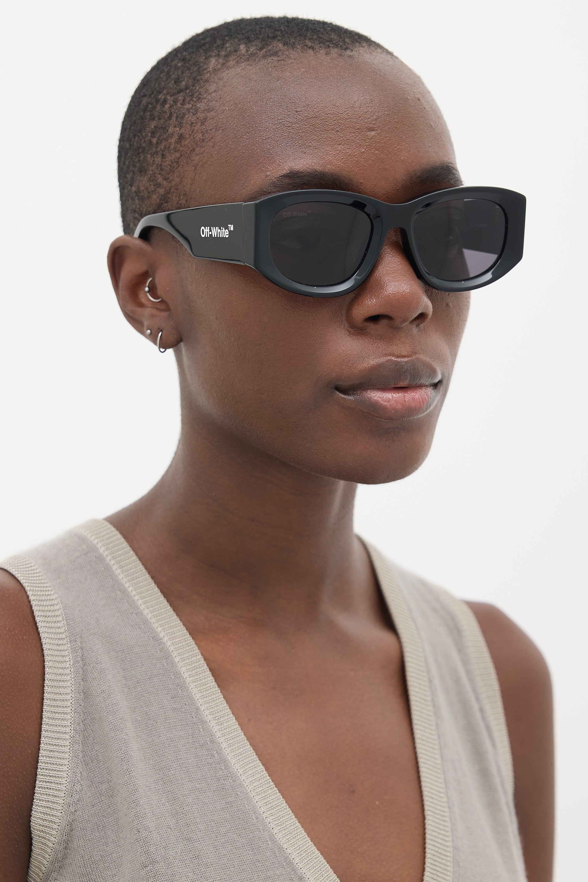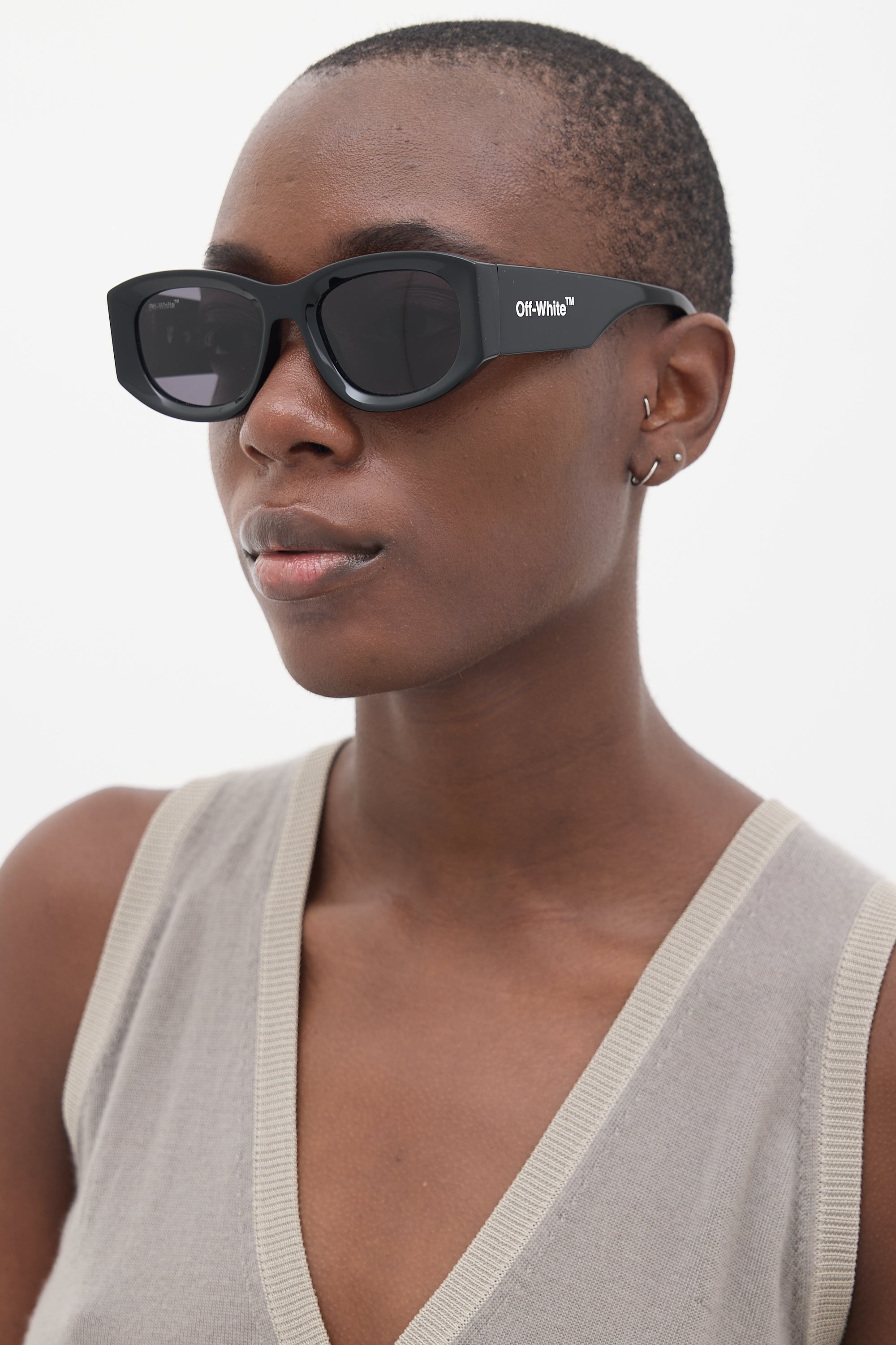 Pre-owned Off-White Joan OERI041 sunglasses featuring grey tinted lenses, black oval frame with squared sides, and white etched logo at temples. Comes with original pouch.