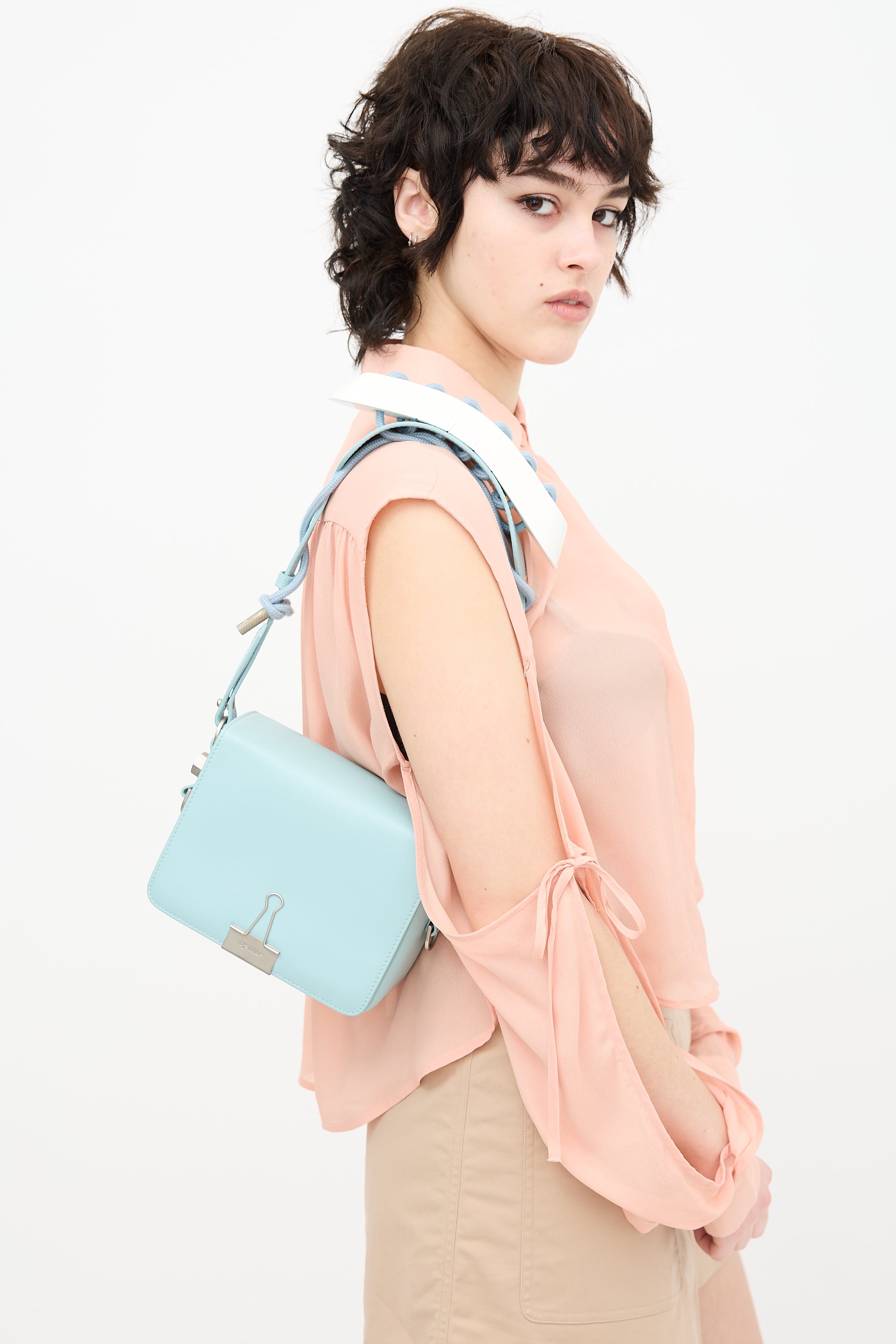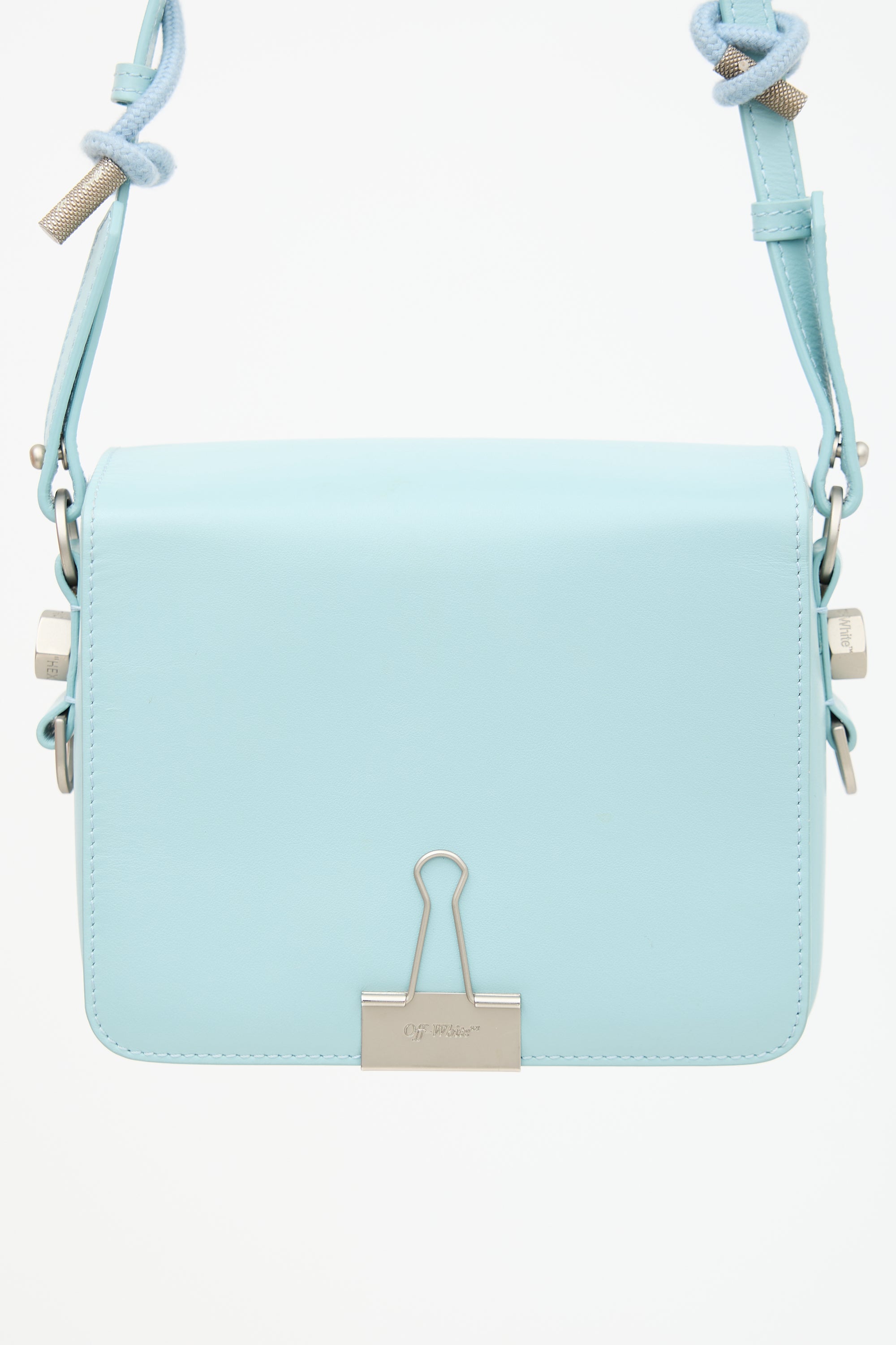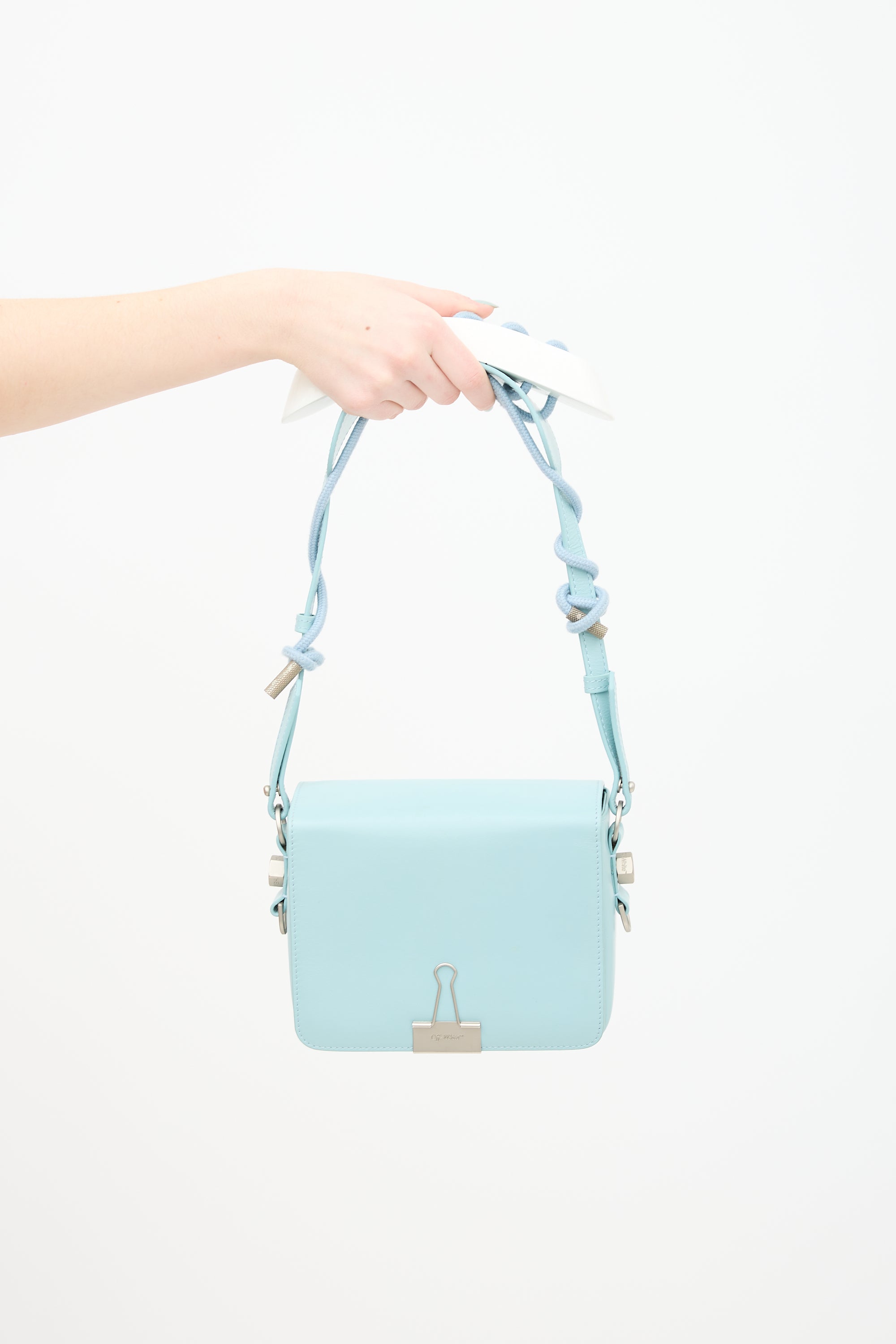 Pre-owned Off-White blue leather Binder Clip bag featuring brushed silver tone hardware, top flap with magnetic clip closure and debossed logo, embossed logo hardware at back, one main compartment with one zip pocket and one slip pocket, and a shoulder strap with padded detail and cord attachment.