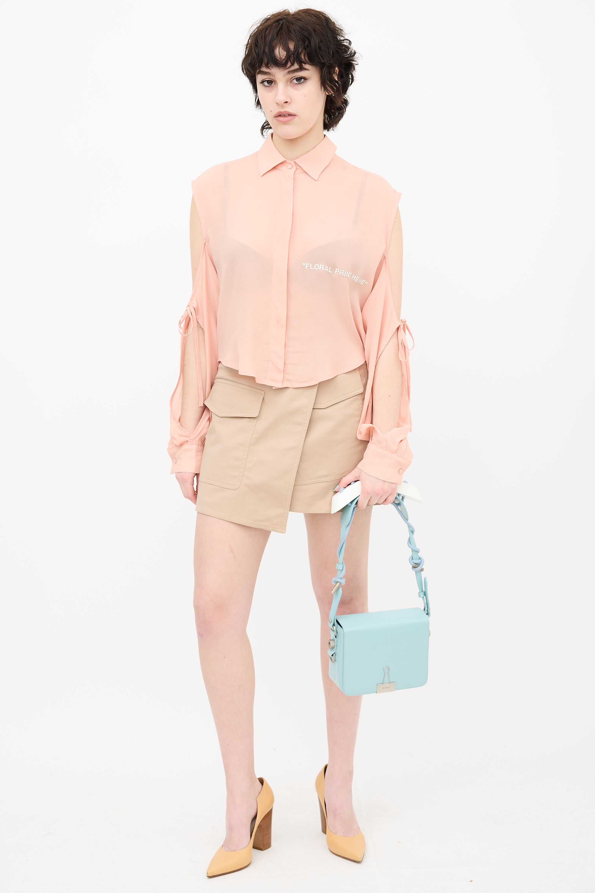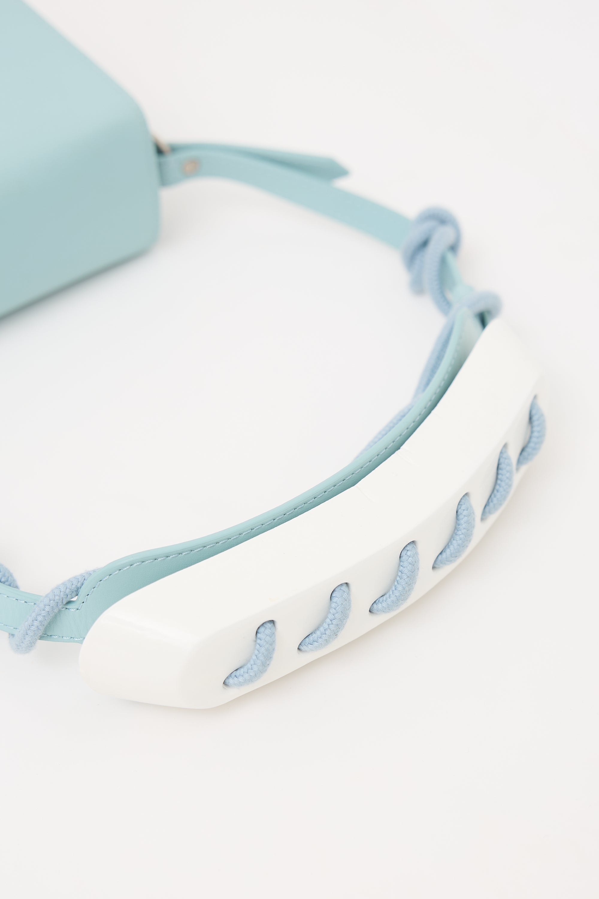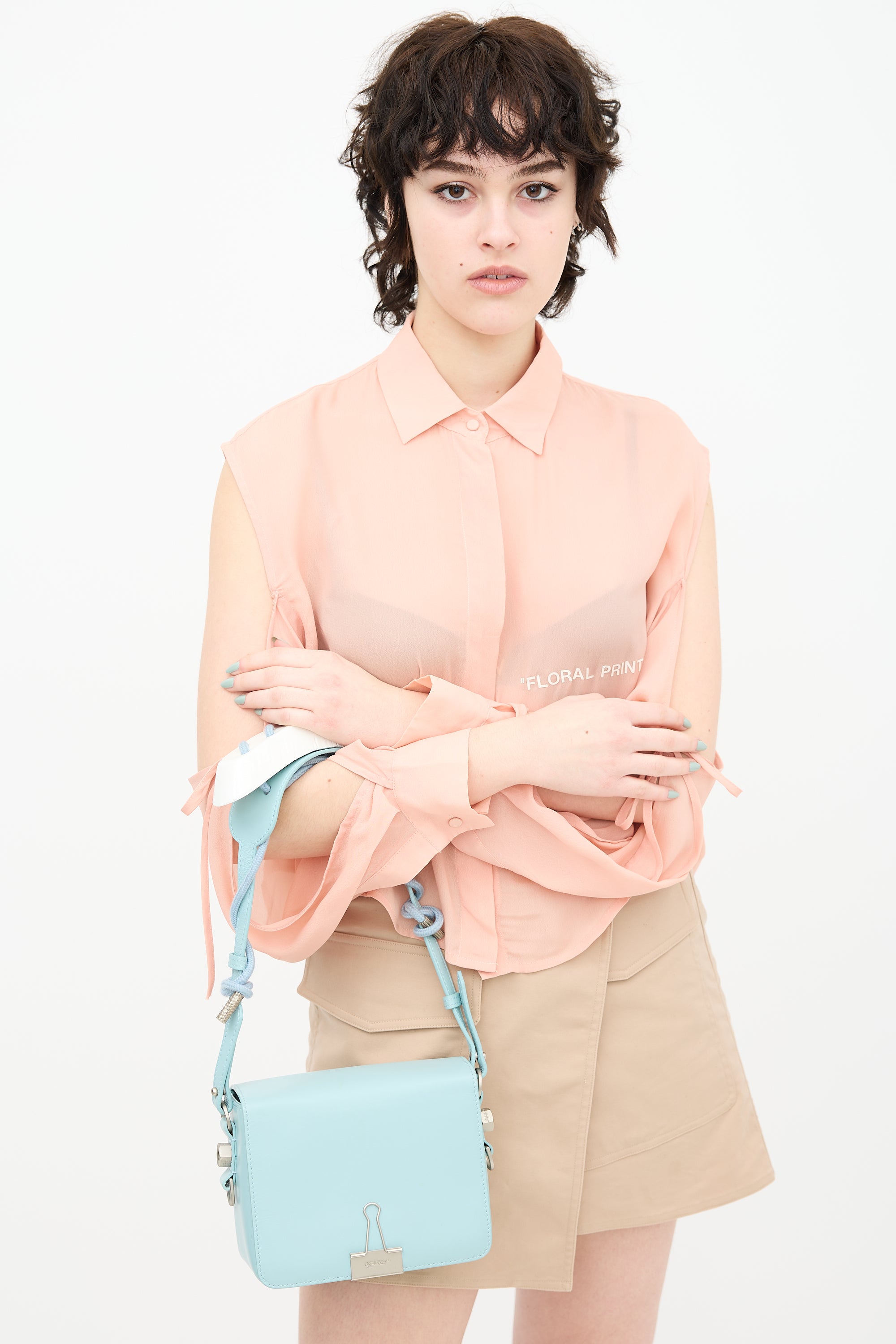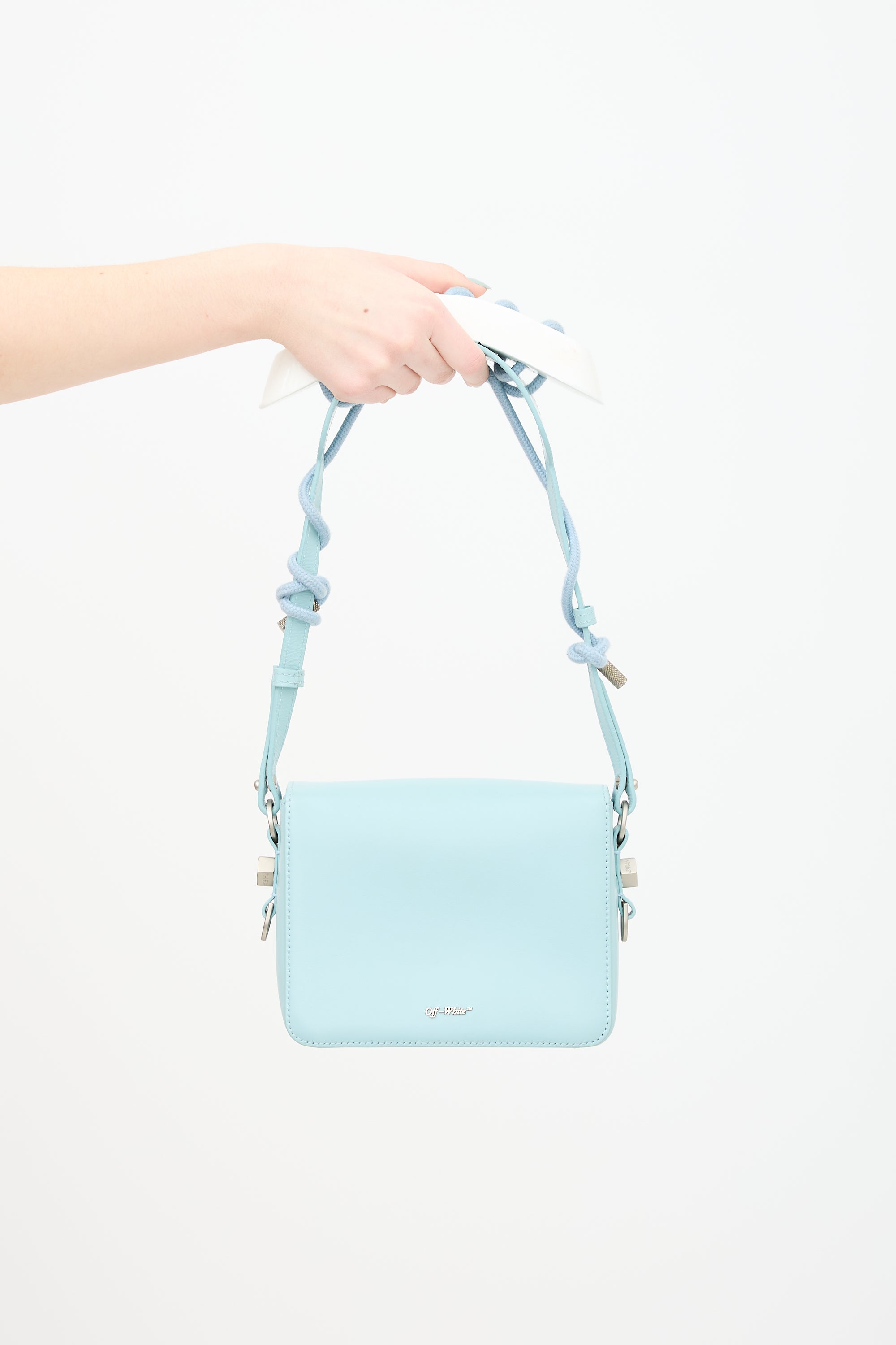 Pre-owned Off-White blue leather Binder Clip bag featuring brushed silver tone hardware, top flap with magnetic clip closure and debossed logo, embossed logo hardware at back, one main compartment with one zip pocket and one slip pocket, and a shoulder strap with padded detail and cord attachment.