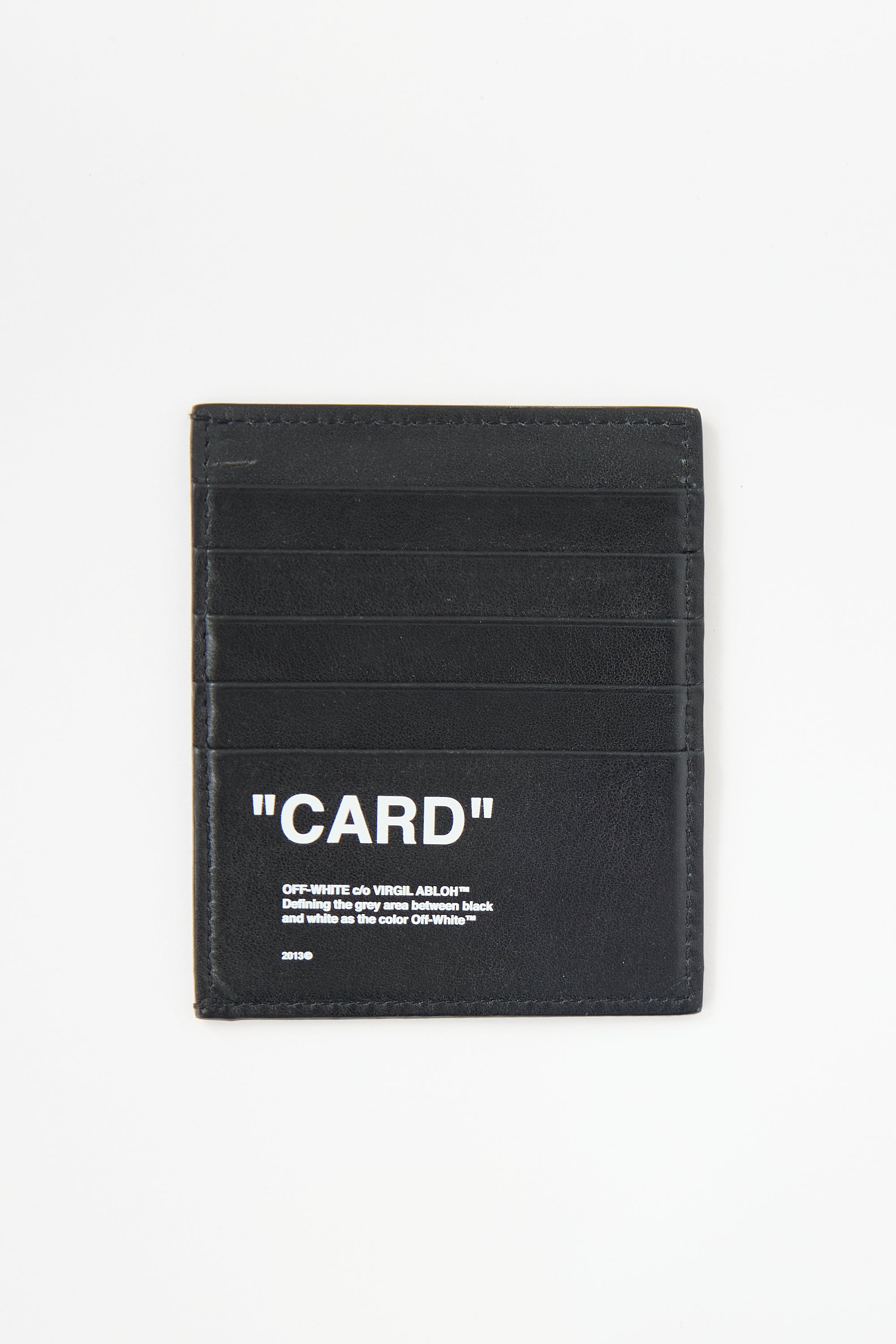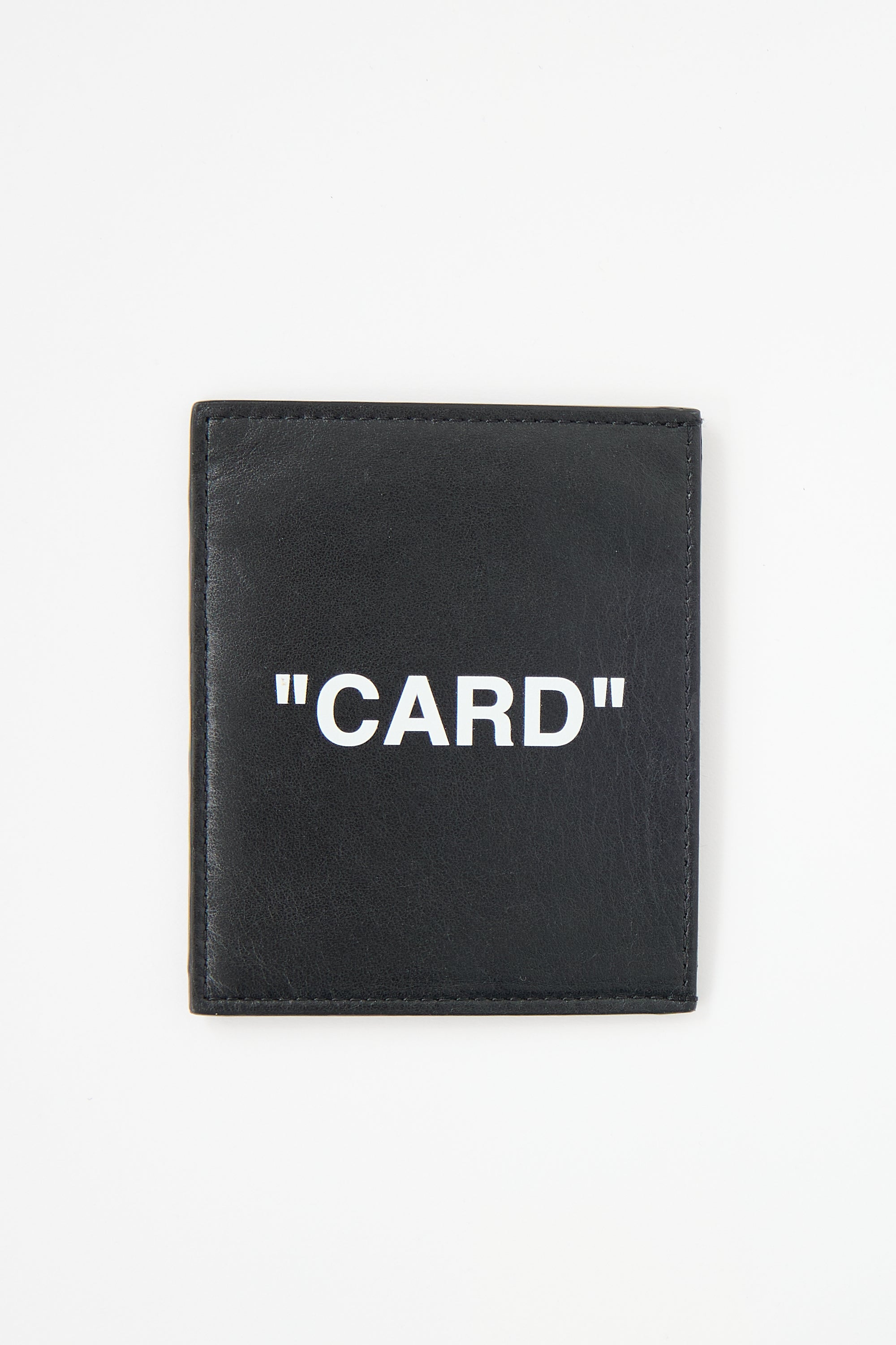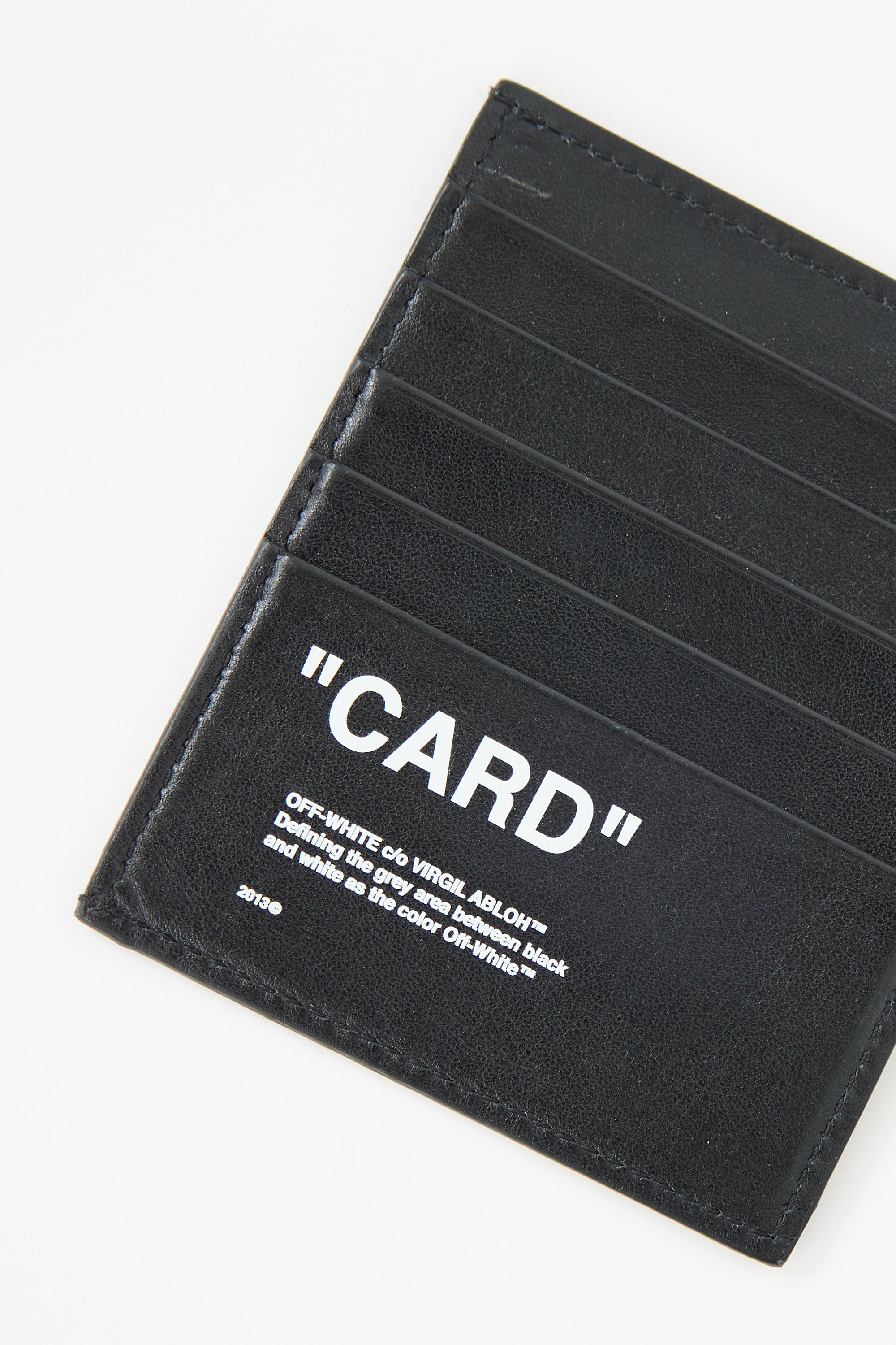 Pre-owned Off-White black leather card holder featuring white printed lettering, signature quote motif, one slip compartment, and five card slots.