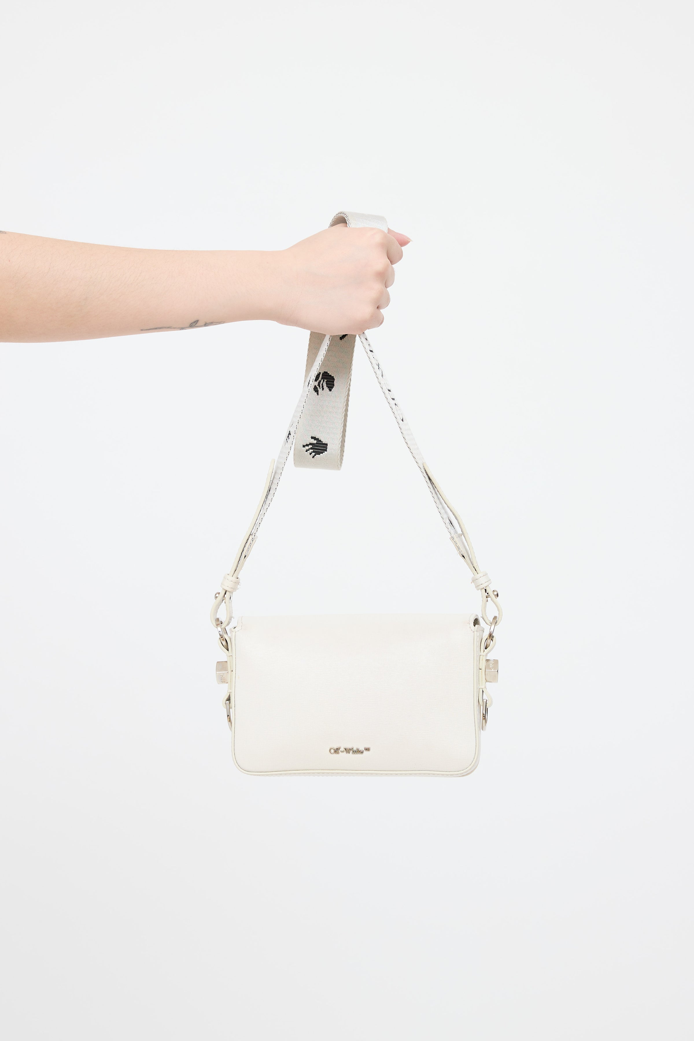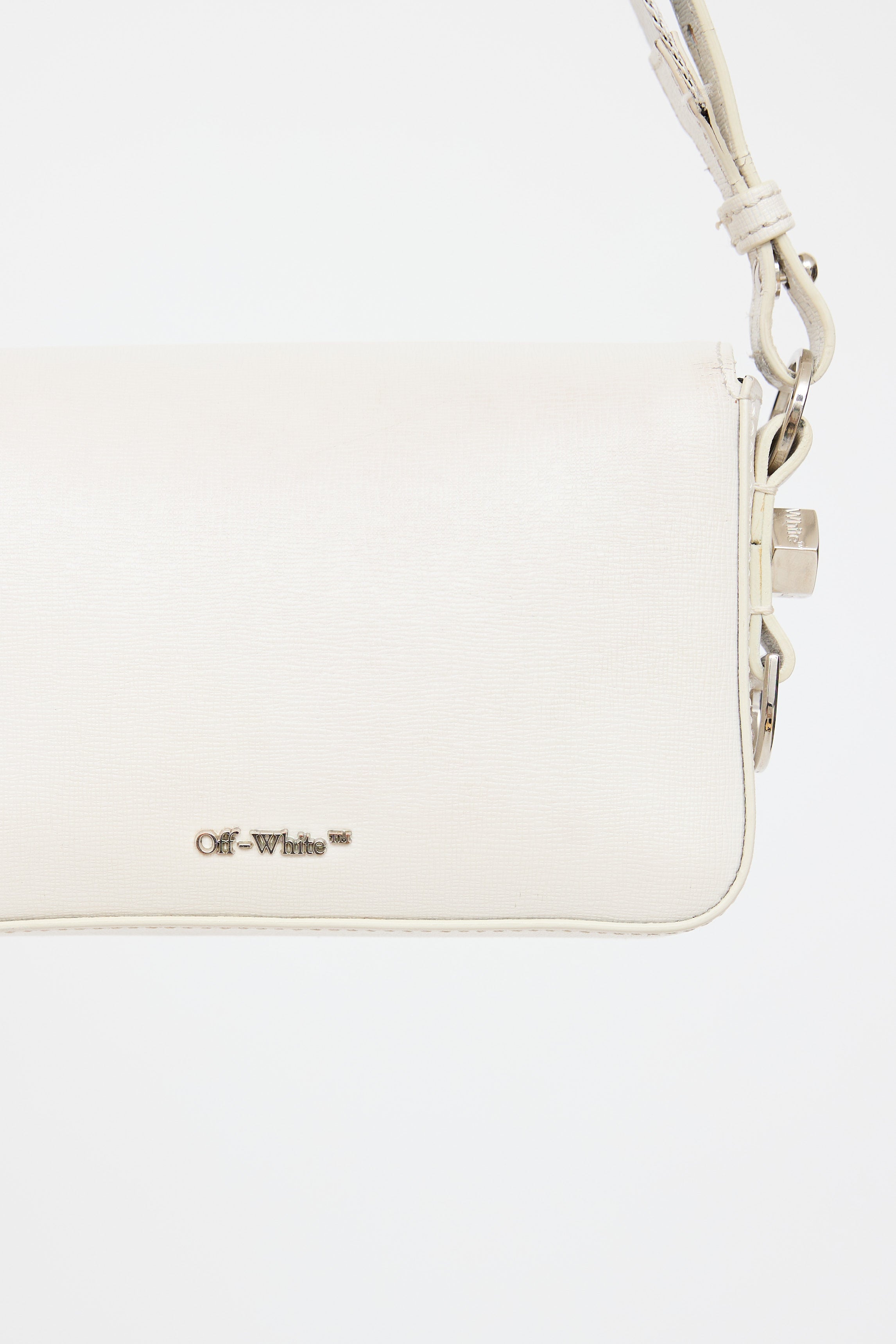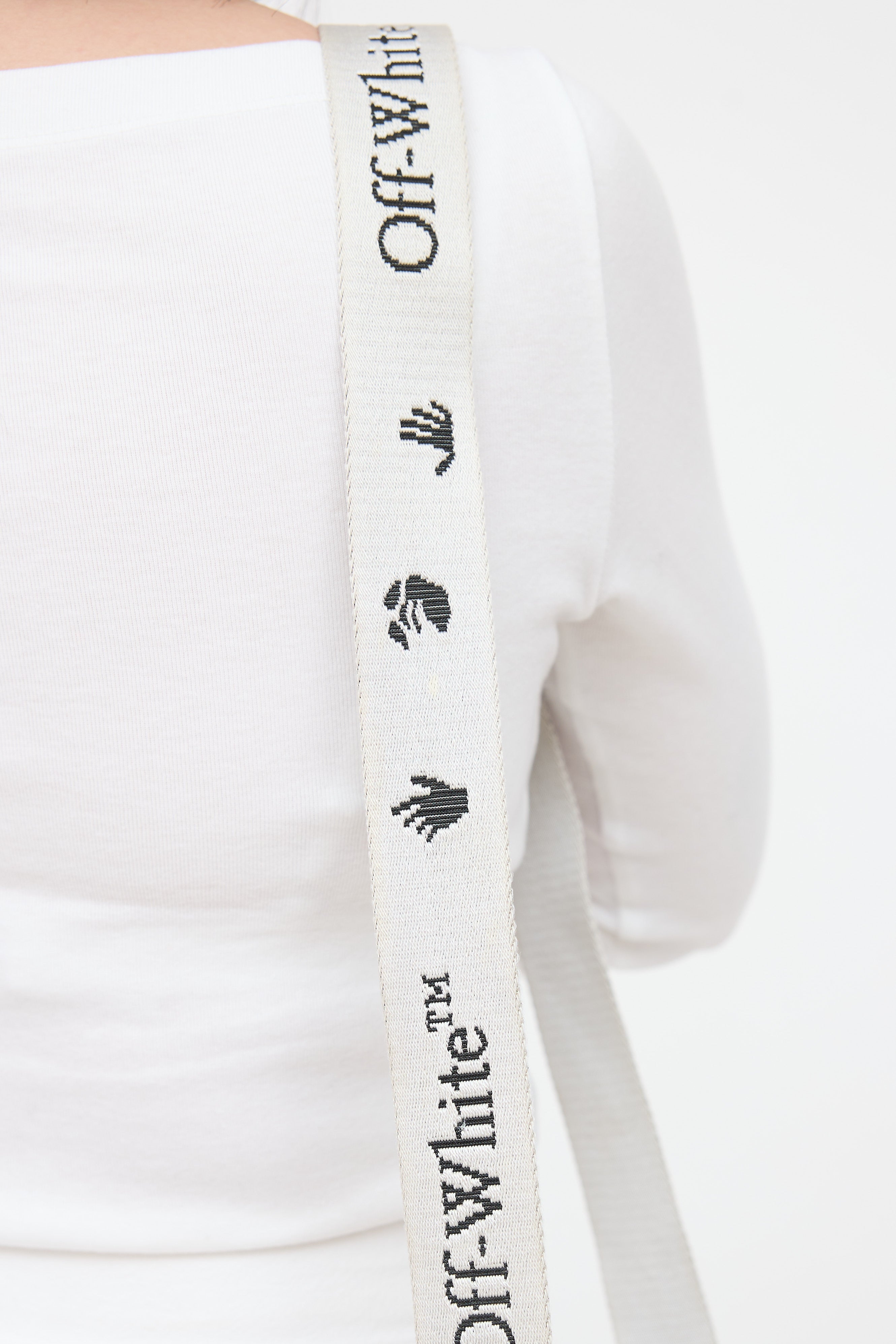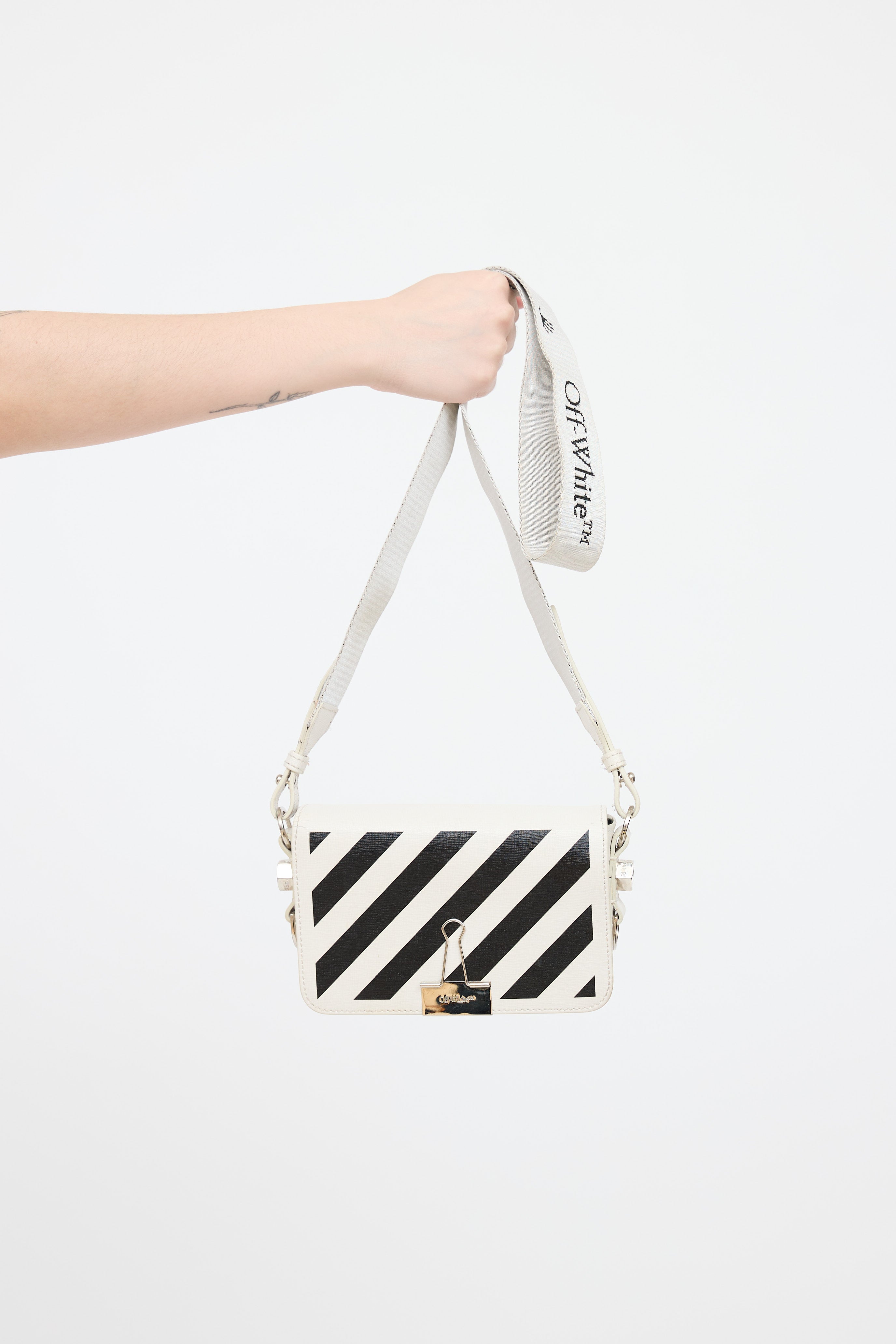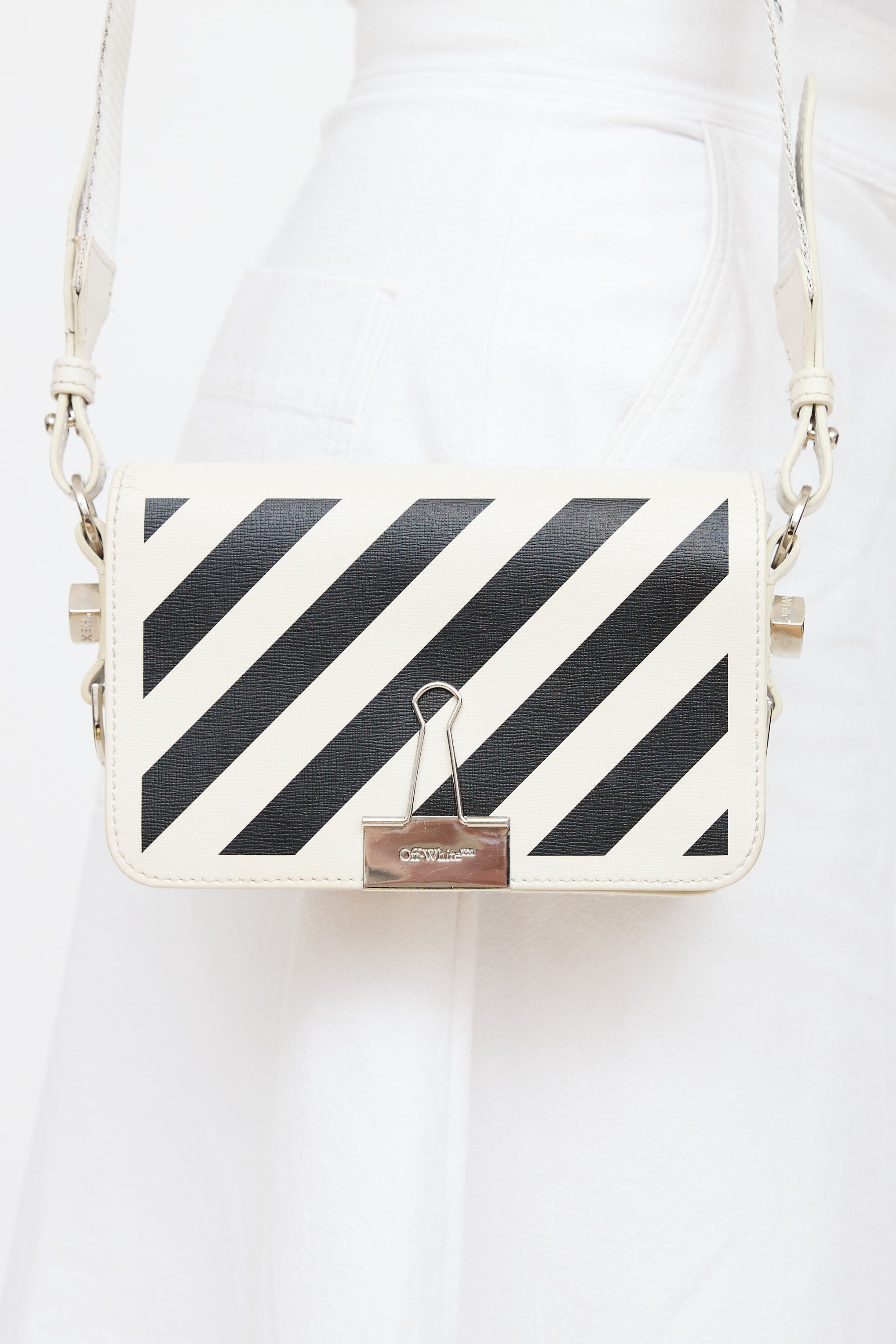 Pre-owned Off-White white Diagonal Binder bag featuring black diagonal stripes at face, silver tone binder clip with debossed logo, magnetic button closure, contrast logo webbing strap, two interior slip and one zip pocket.