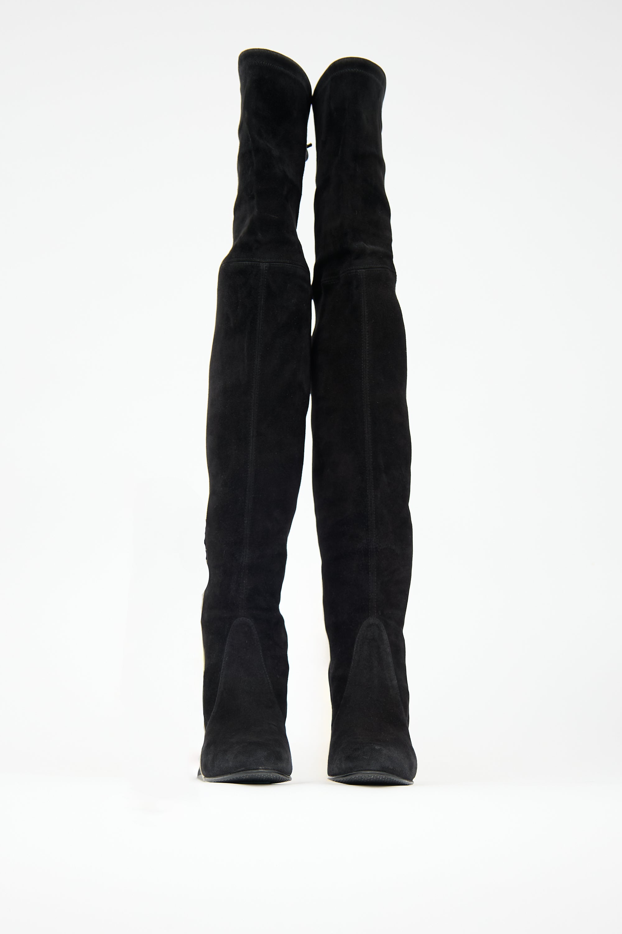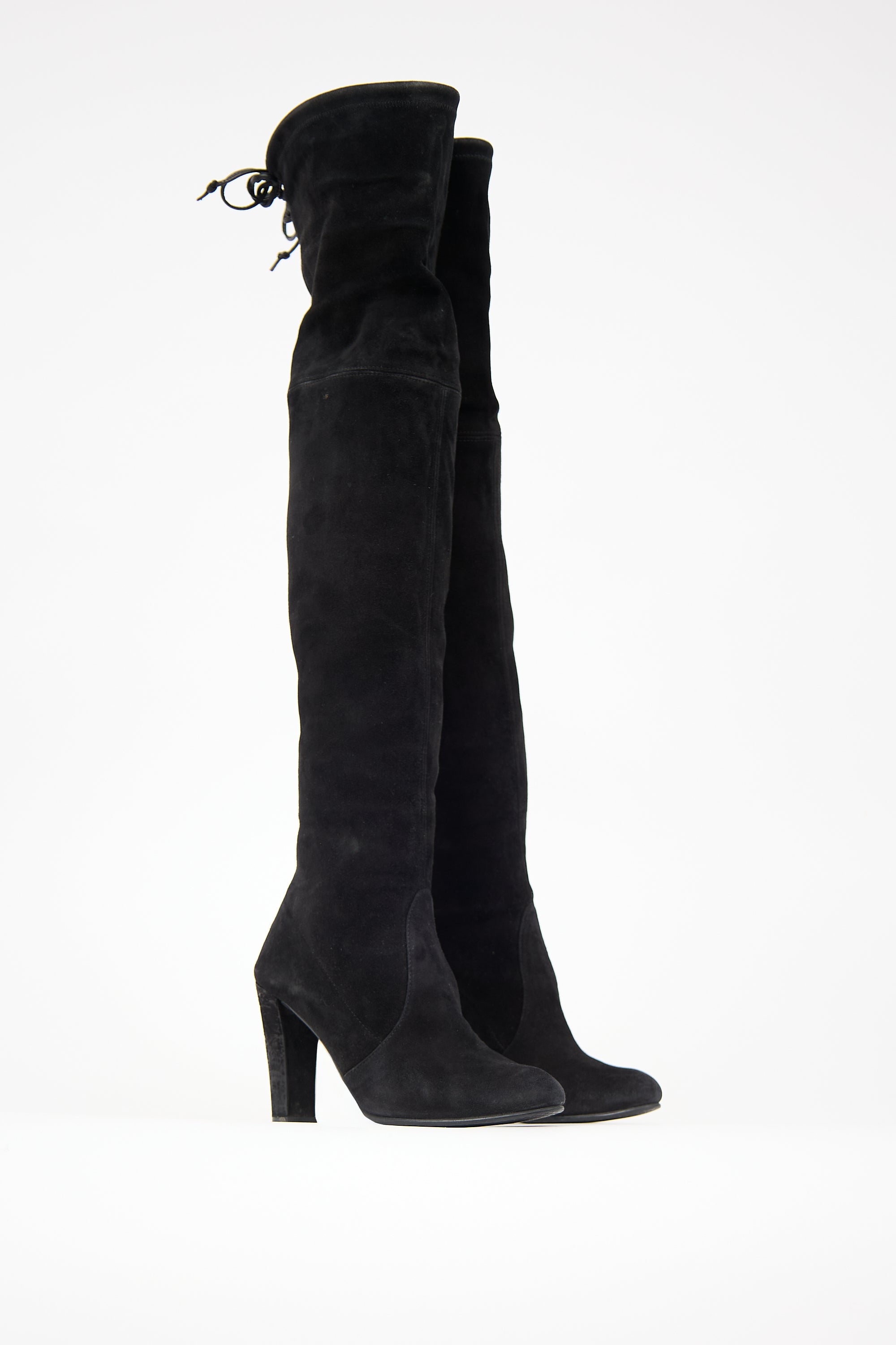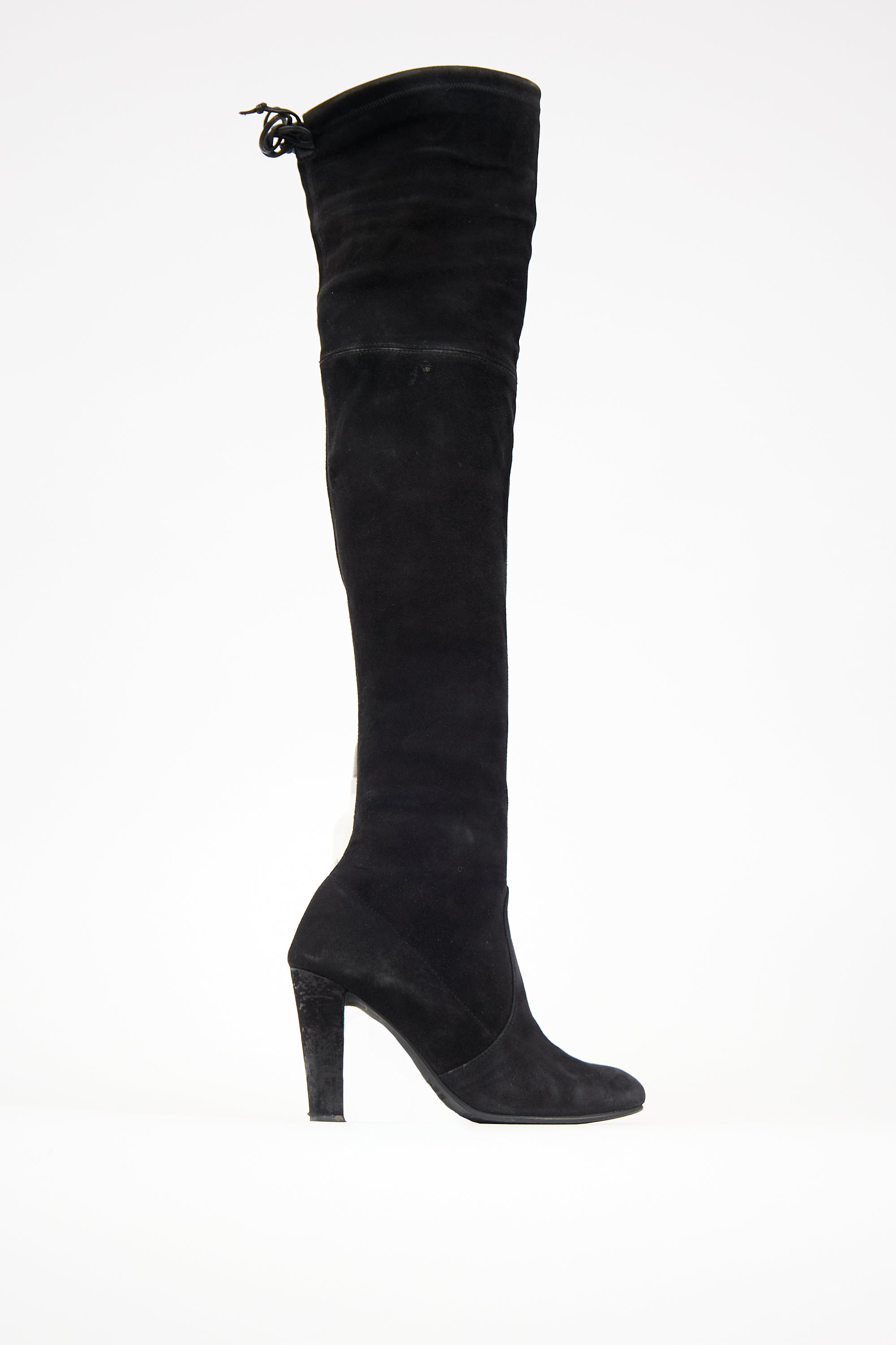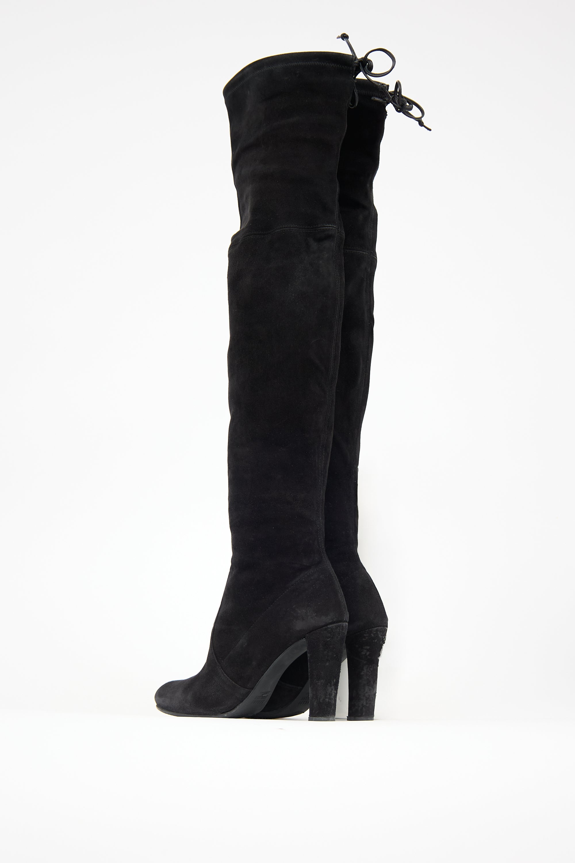 Pre-owned Stuart Weitzman black suede Highland over the knee boot featuring an almond toe, pull on entry, drawstring collar, and a covered block heel.