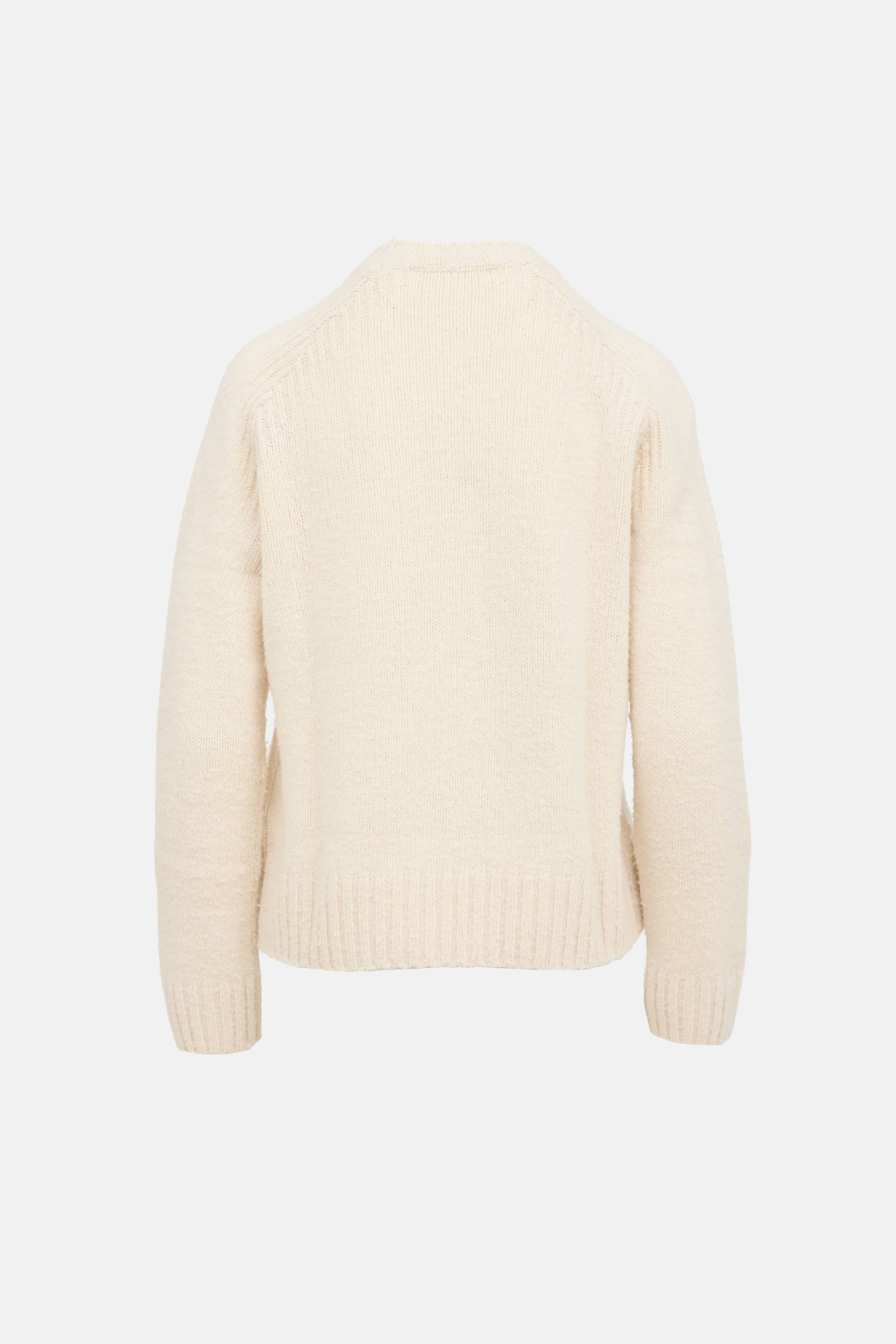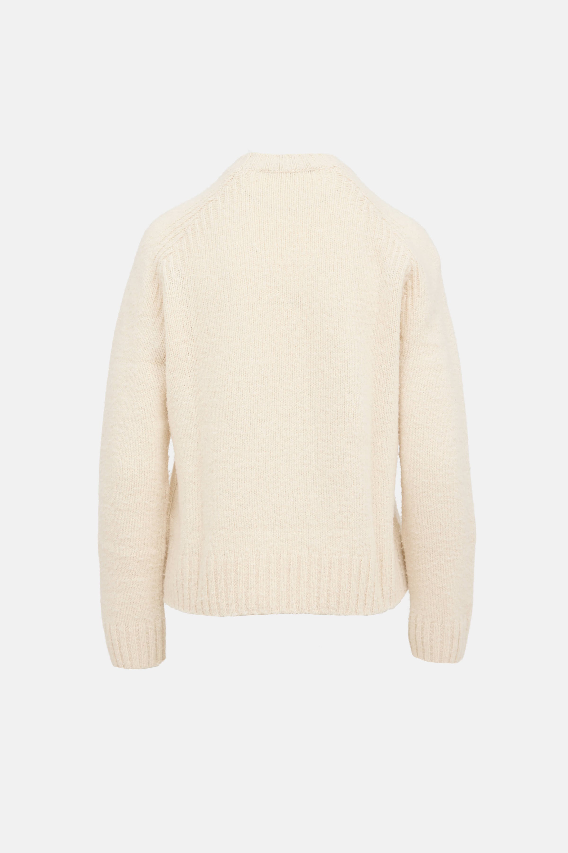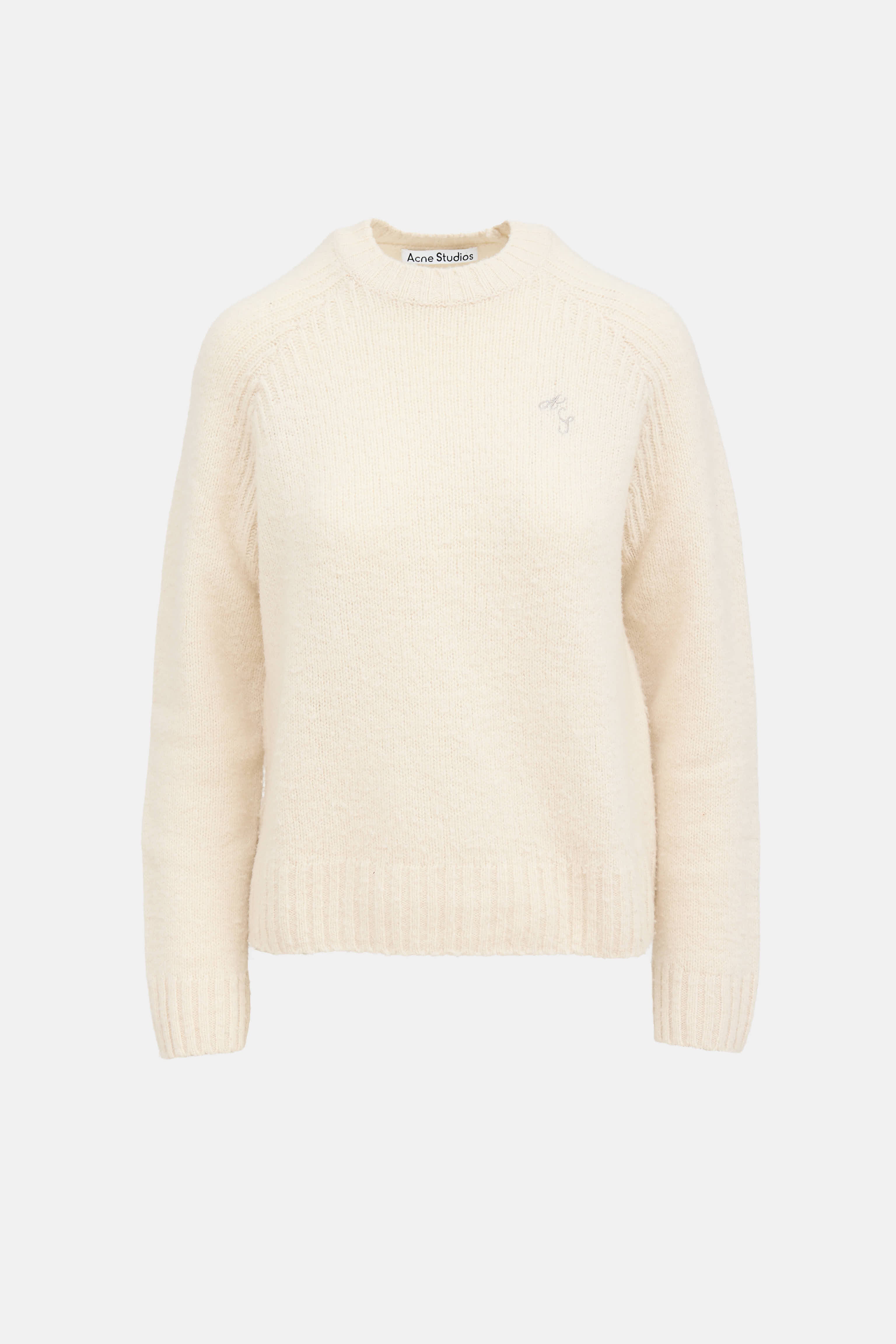 Pre-owned Acne Studios cream wool sweater featuring crew neckline, ribbed neck, cuffs, and hem, and embroidered logo initials at chest.