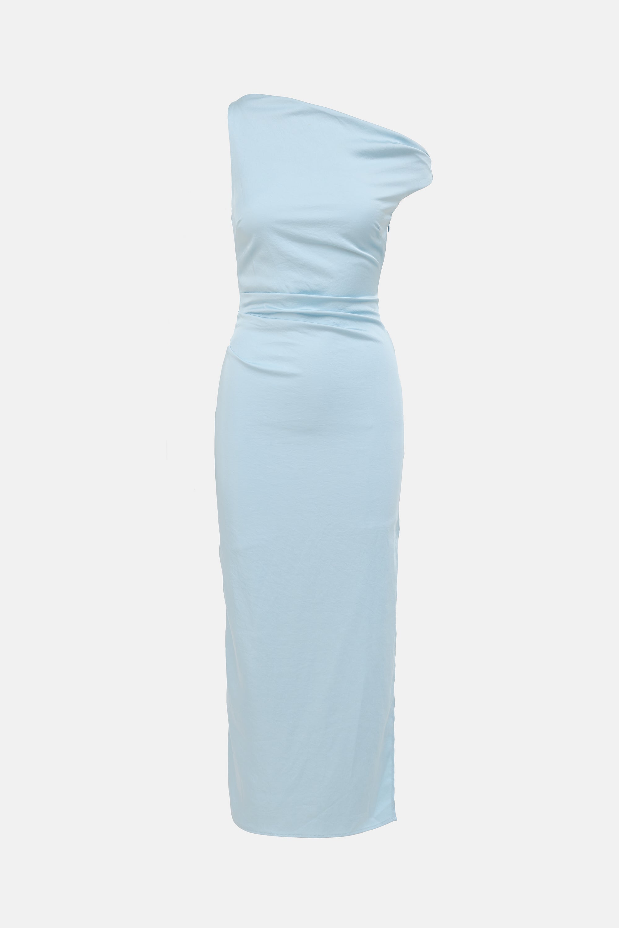Bec + Bridge blue satin Rochelle midi dress featuring an asymmetric shoulder, side zip closure, darts at bust, ruched side, and high cut slit at left leg. Lined.