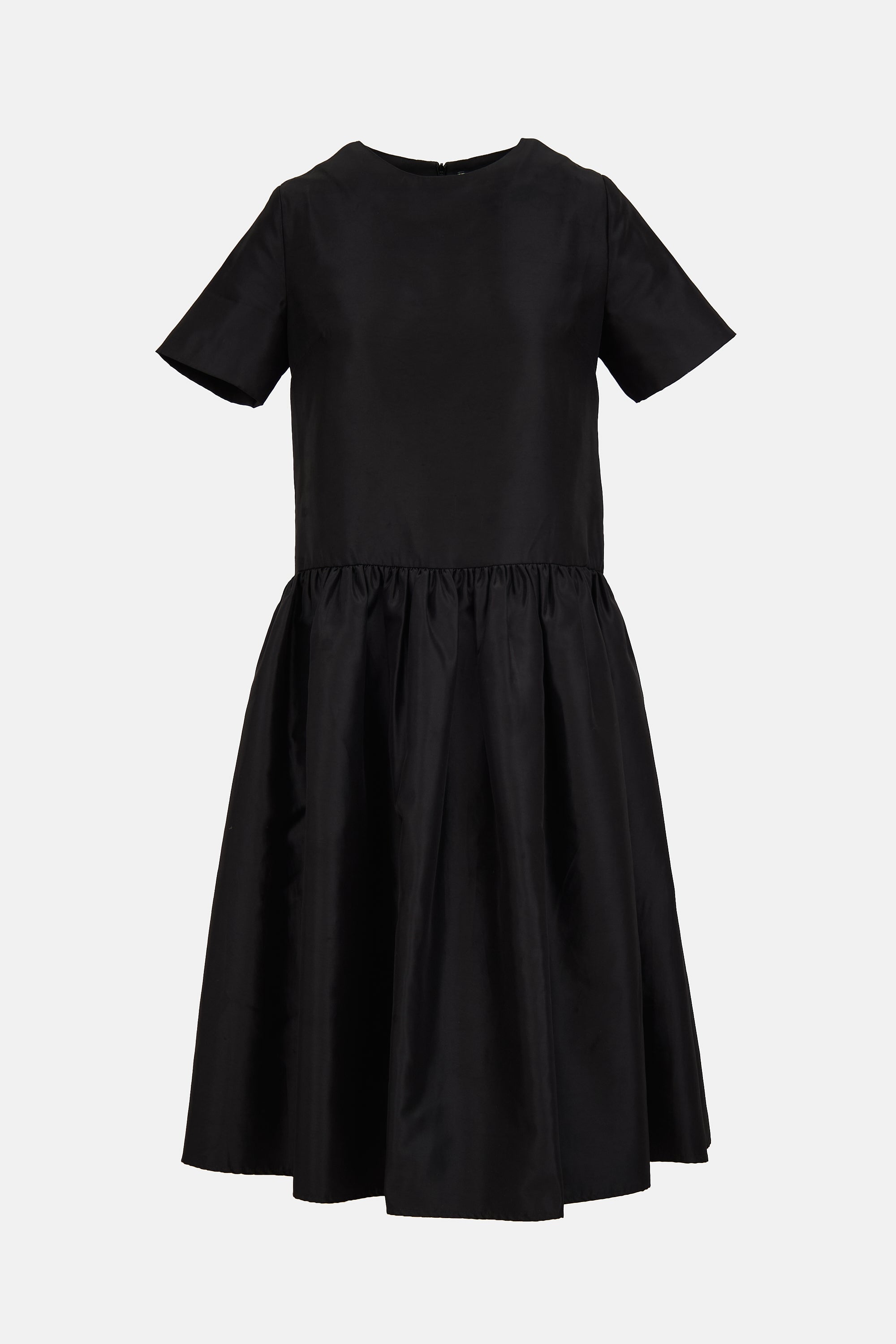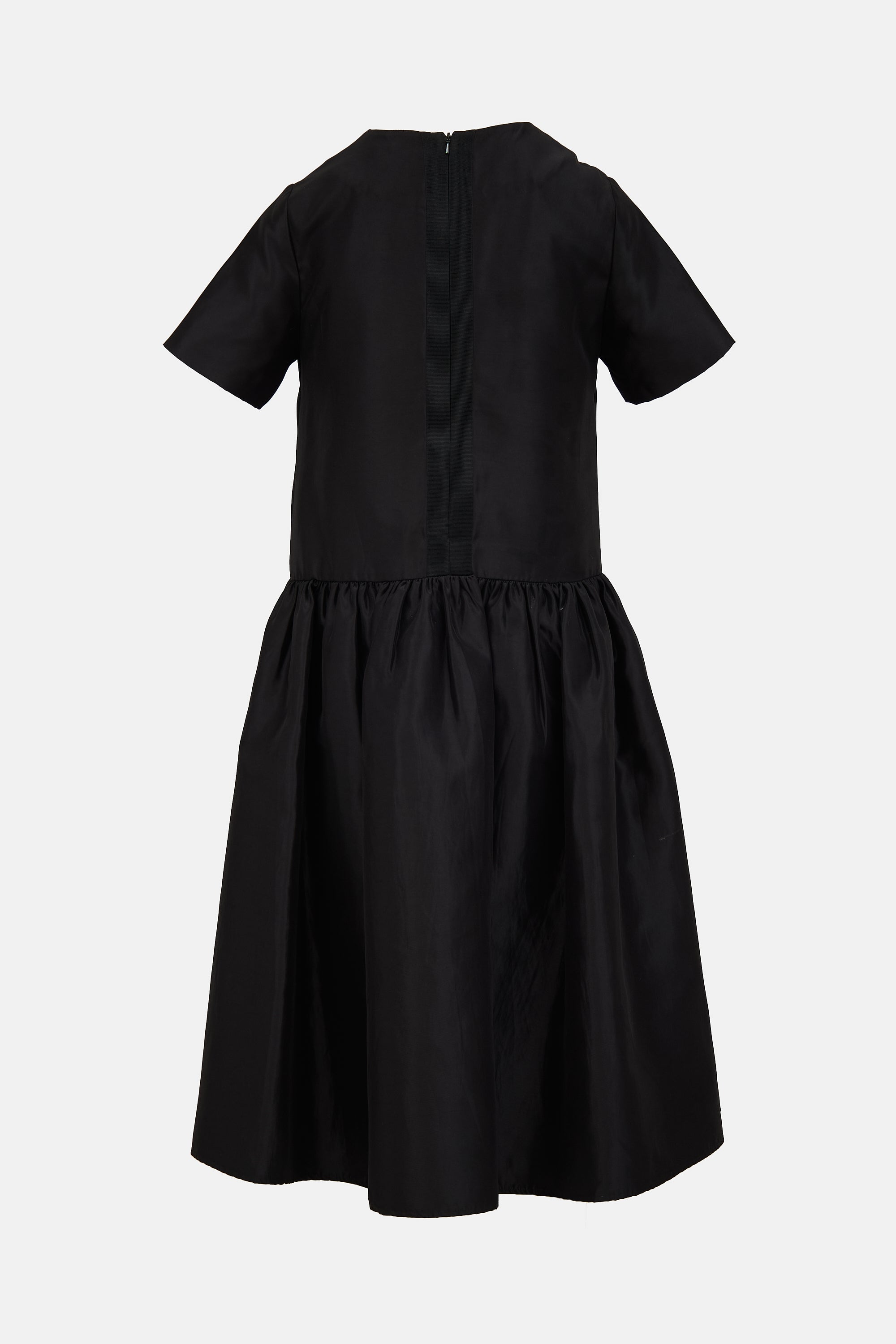 Pre-owned EDIT black dress featuring round neckline, short sleeves, gathered skirt, two inseam pockets, and zip closure at back.