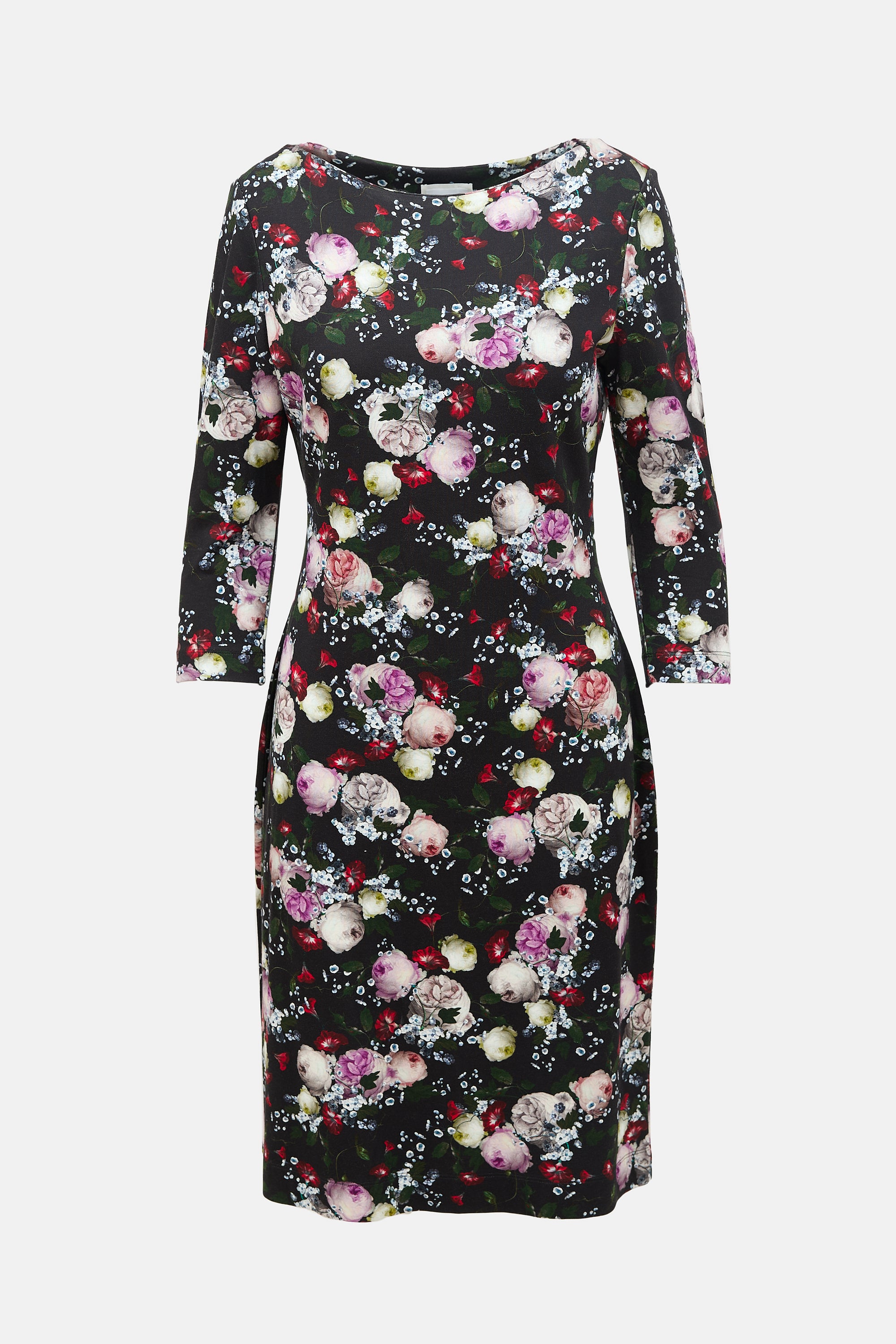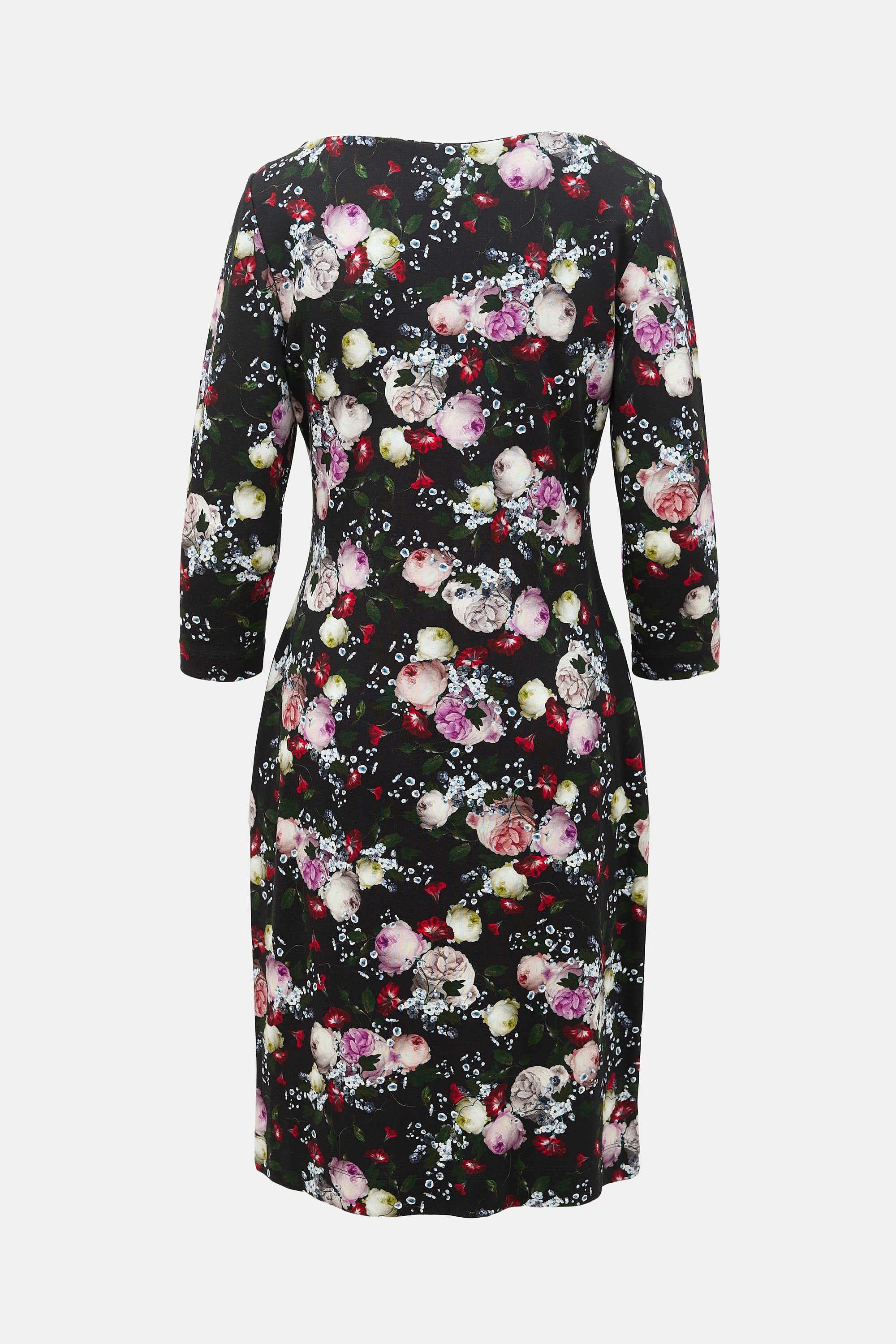Pre-owned Erdem black stretch jersey Reese dress featuring a bateau neckline, multicolour floral print throughout, three quarter length sleeves, and bodycon silhouette. Lined bust.