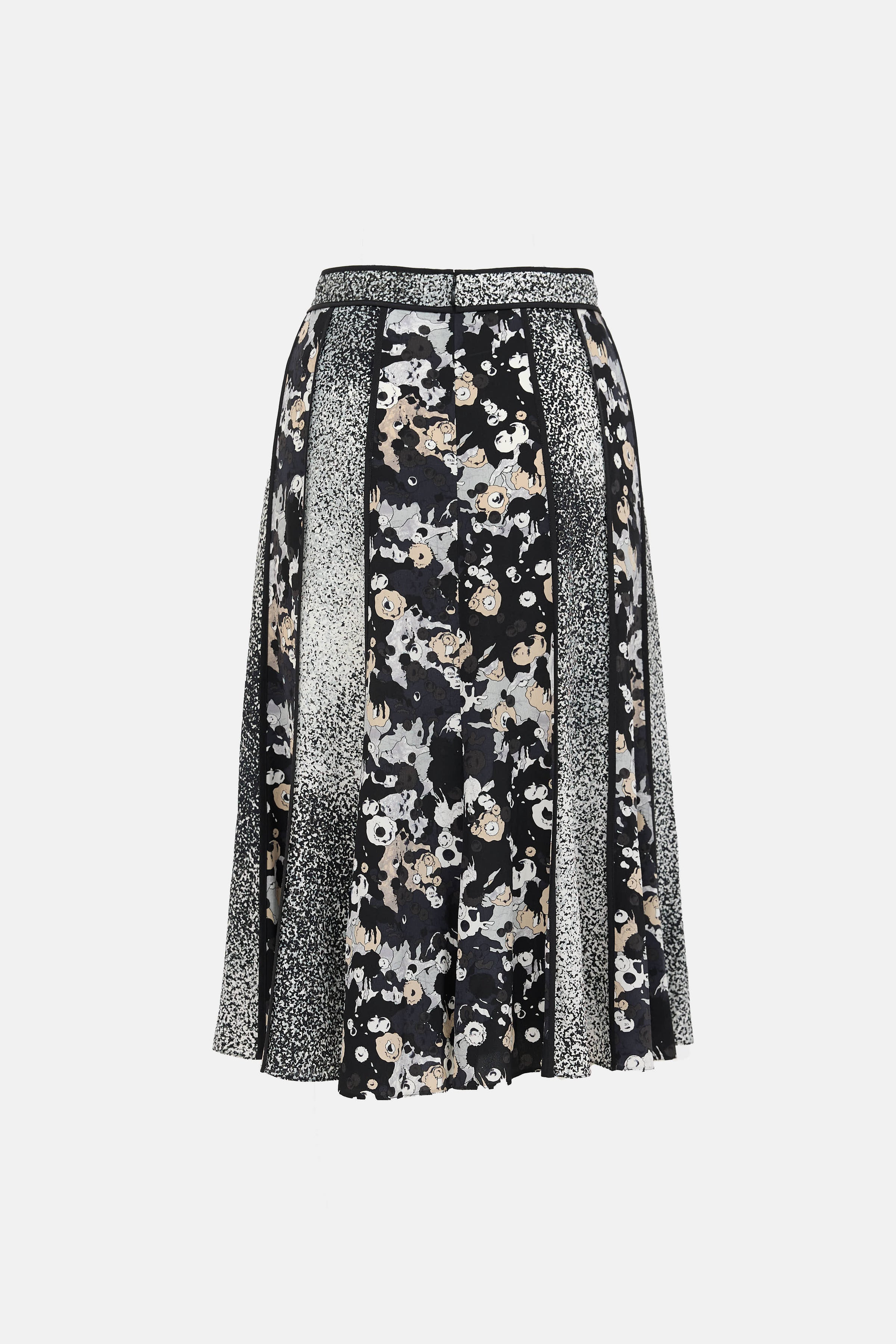 Pre-owned Kenzo grey and multicolour silk Moon Map midi skirt featuring multi pattern panels throughout and zip closure at back.