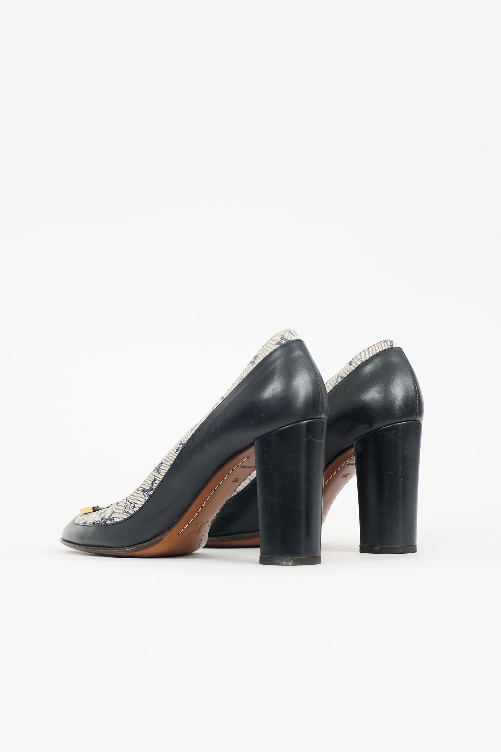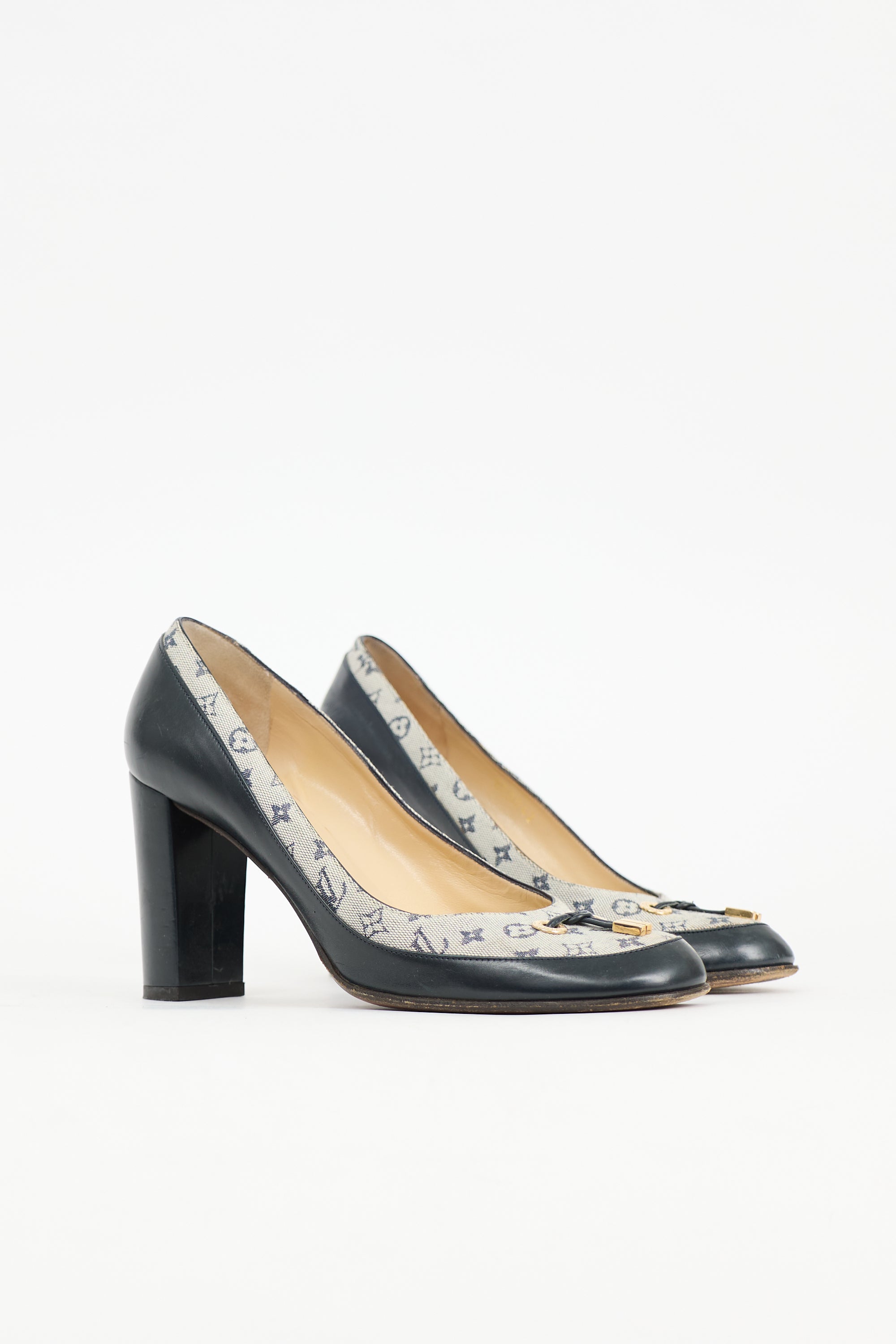 Pre-owned Louis Vuitton navy Mini Lin pumps featuring rounded toe, gold tone hardware, navy leather trim, monogram canvas upper, and covered block heel.
