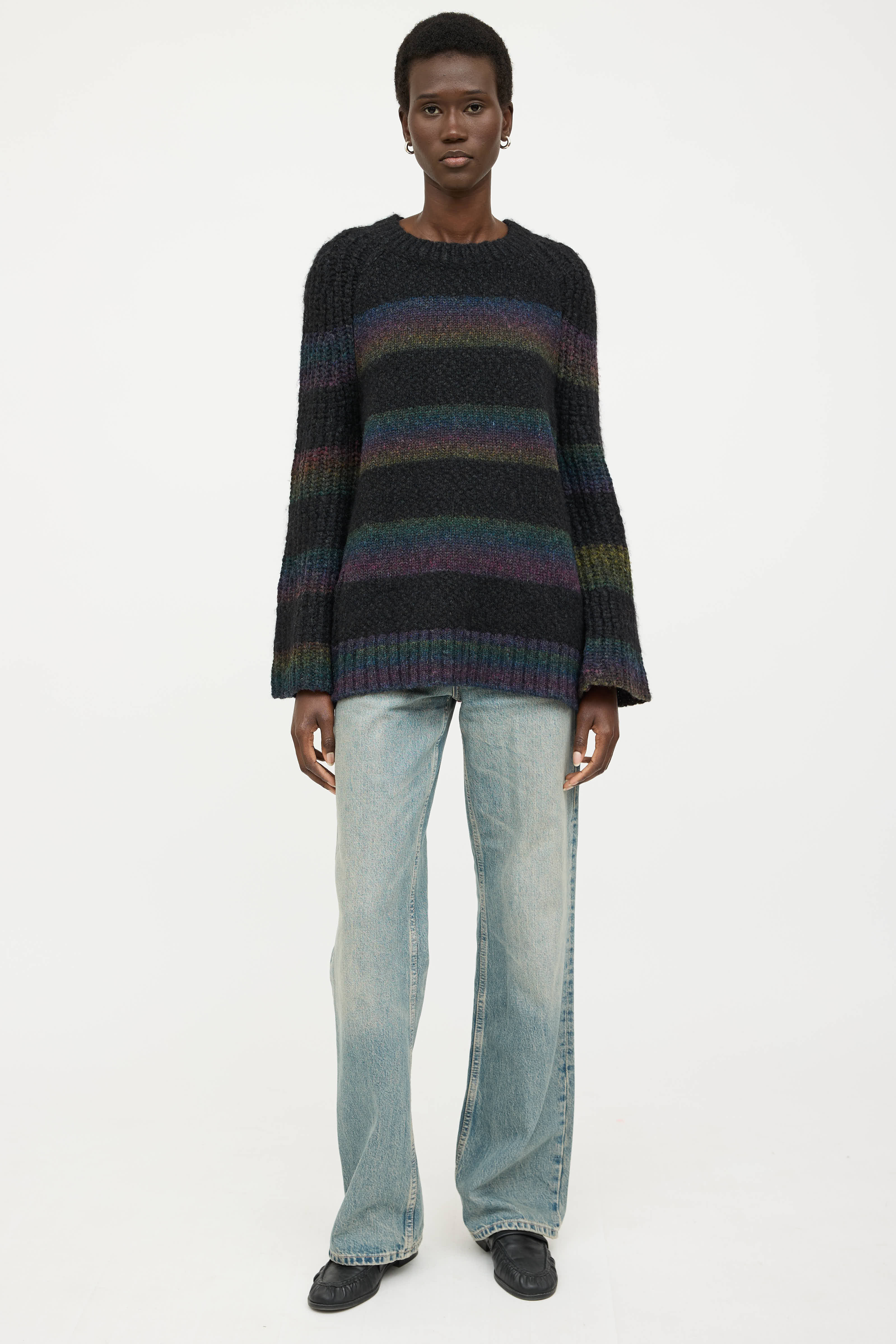 Pre-owned Raquel Allegra black wool knit sweater featuring a multicolour striped pattern throughout, crew neckline, long raglan flared sleeves, and ribbed hem.