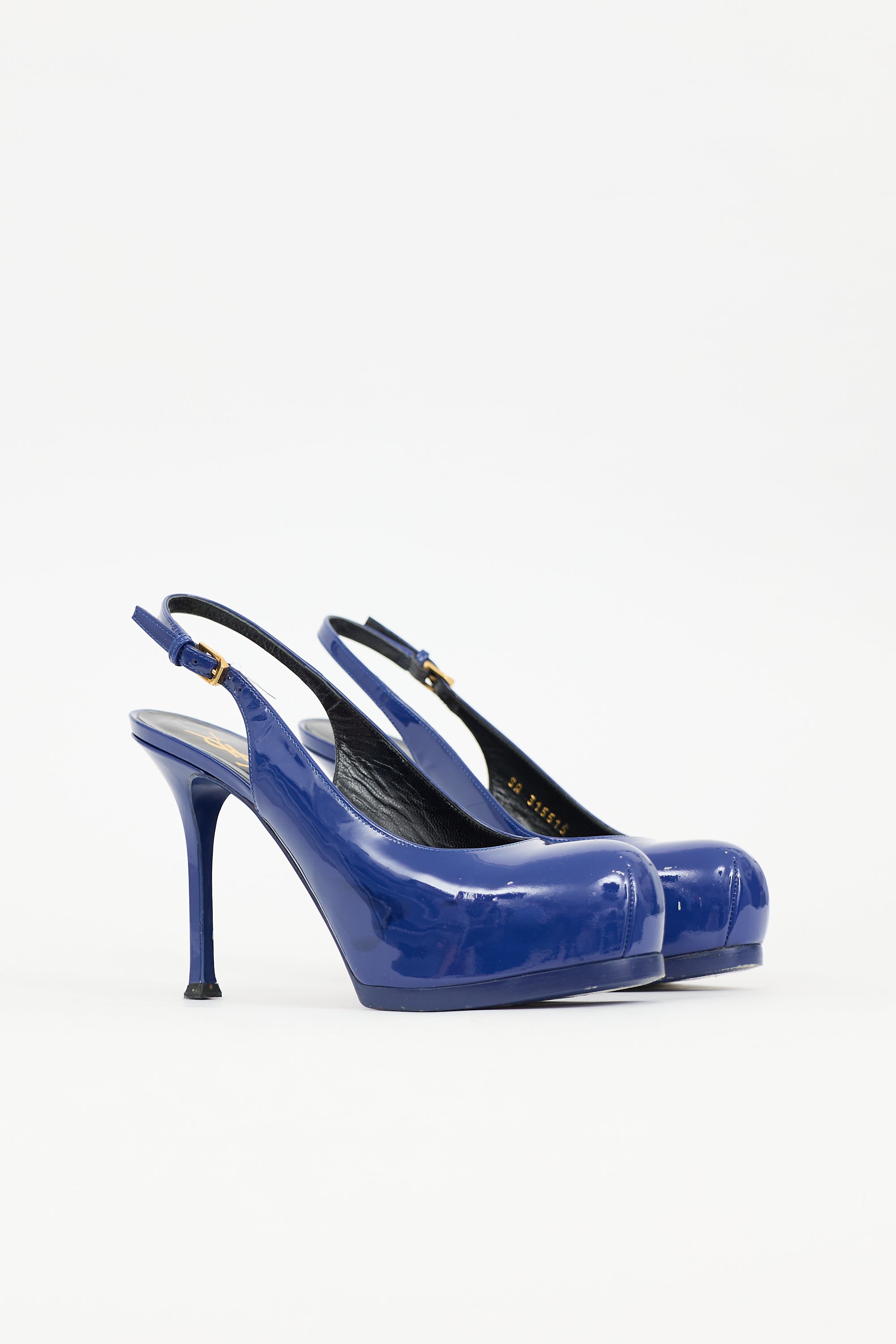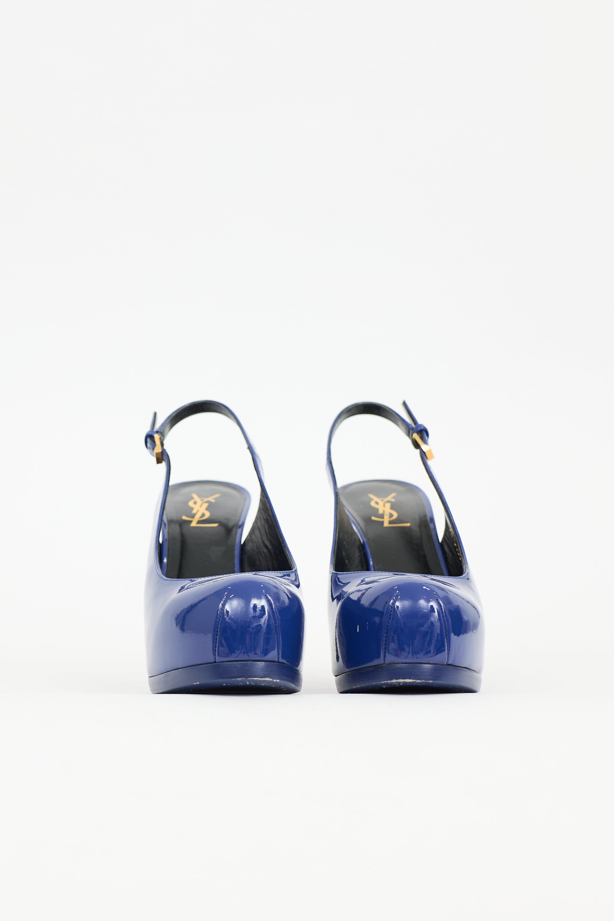 Pre-owned Yves Saint Laurent blue patent leather Tribtoo heels featuring rounded toe, adjustable slingback strap, concealed platform box, and stiletto heel.
