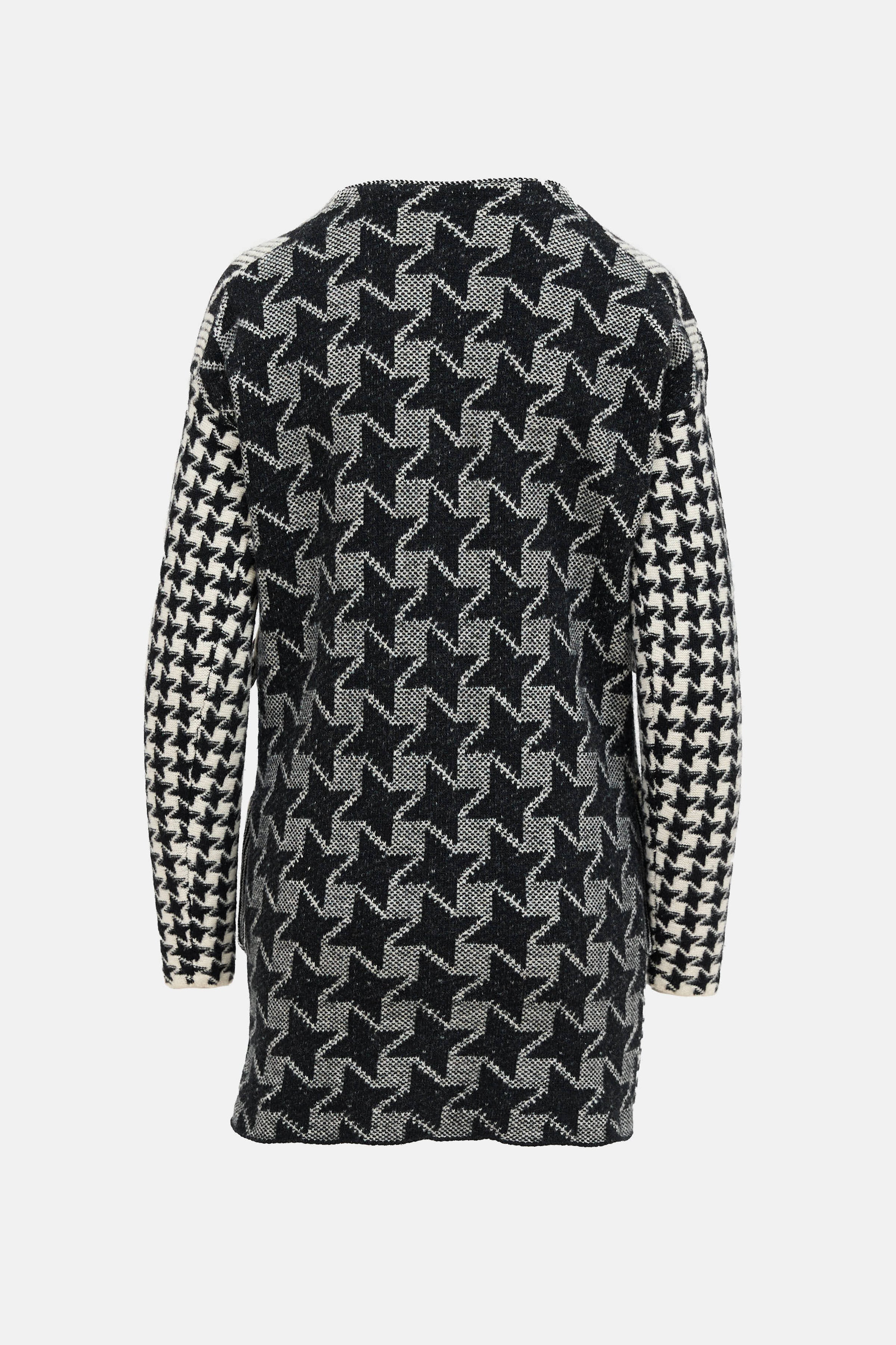 Pre-owned Stella McCartney black and white houndstooth fringe sweater dress featuring crew neckline, two slip pockets at hips, and fringe trim at front.