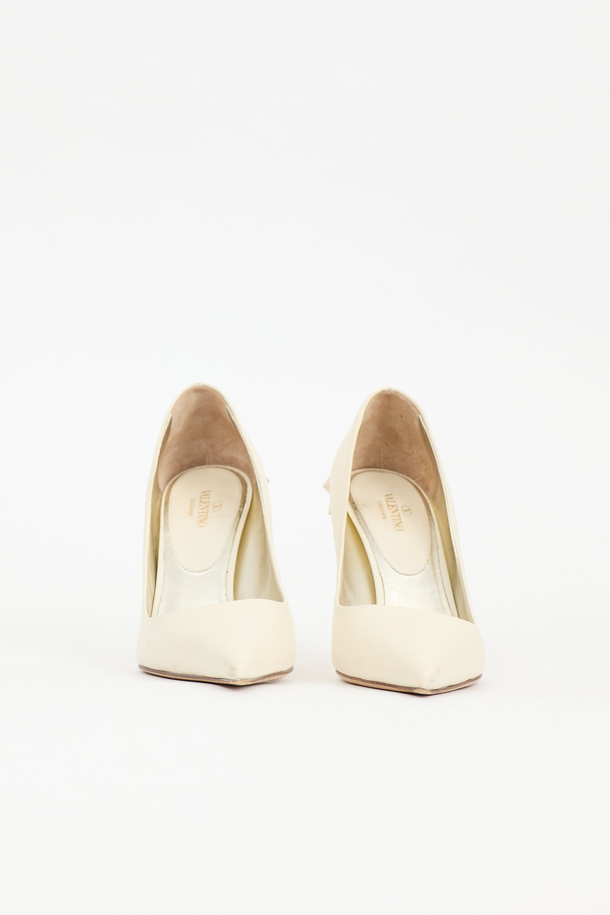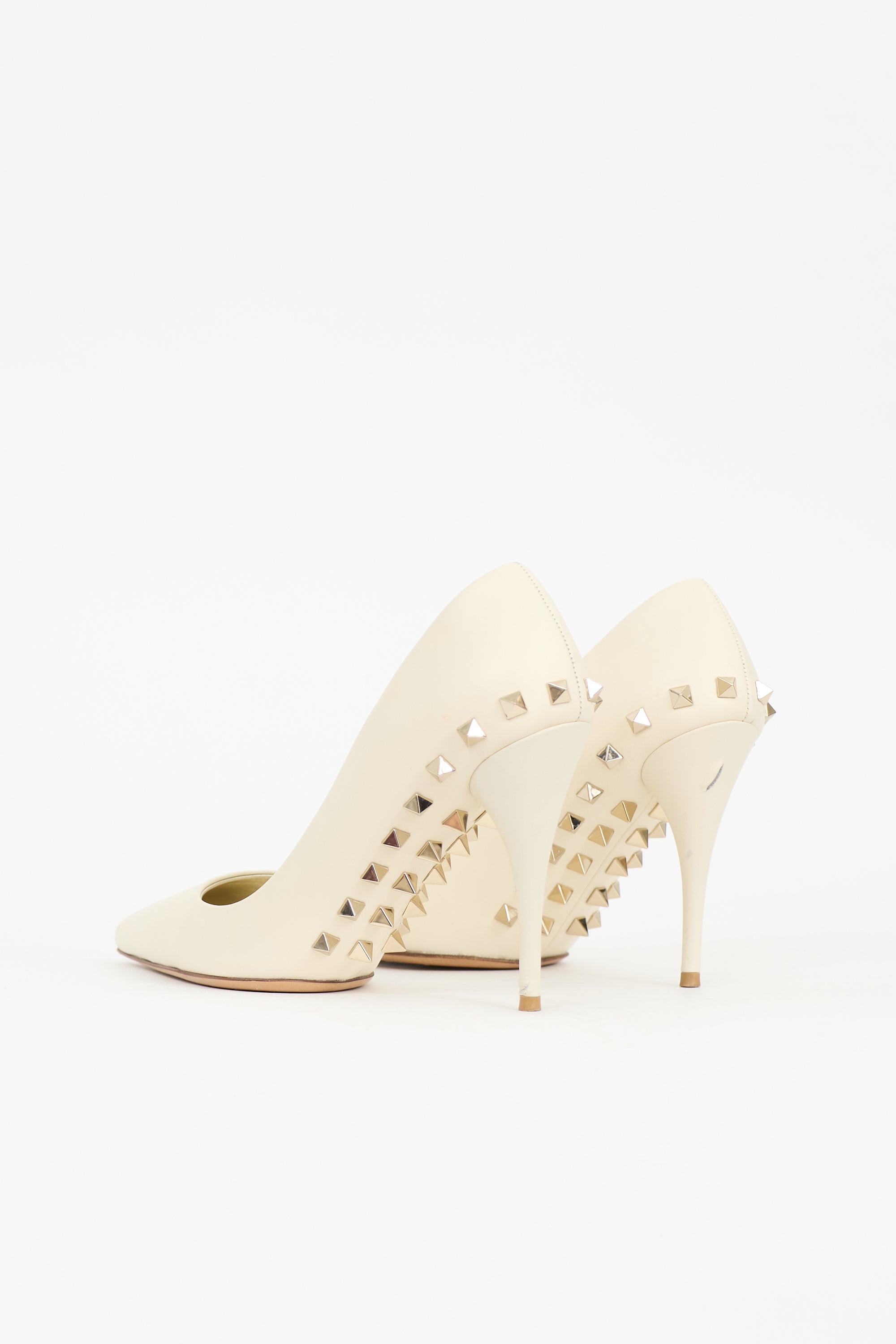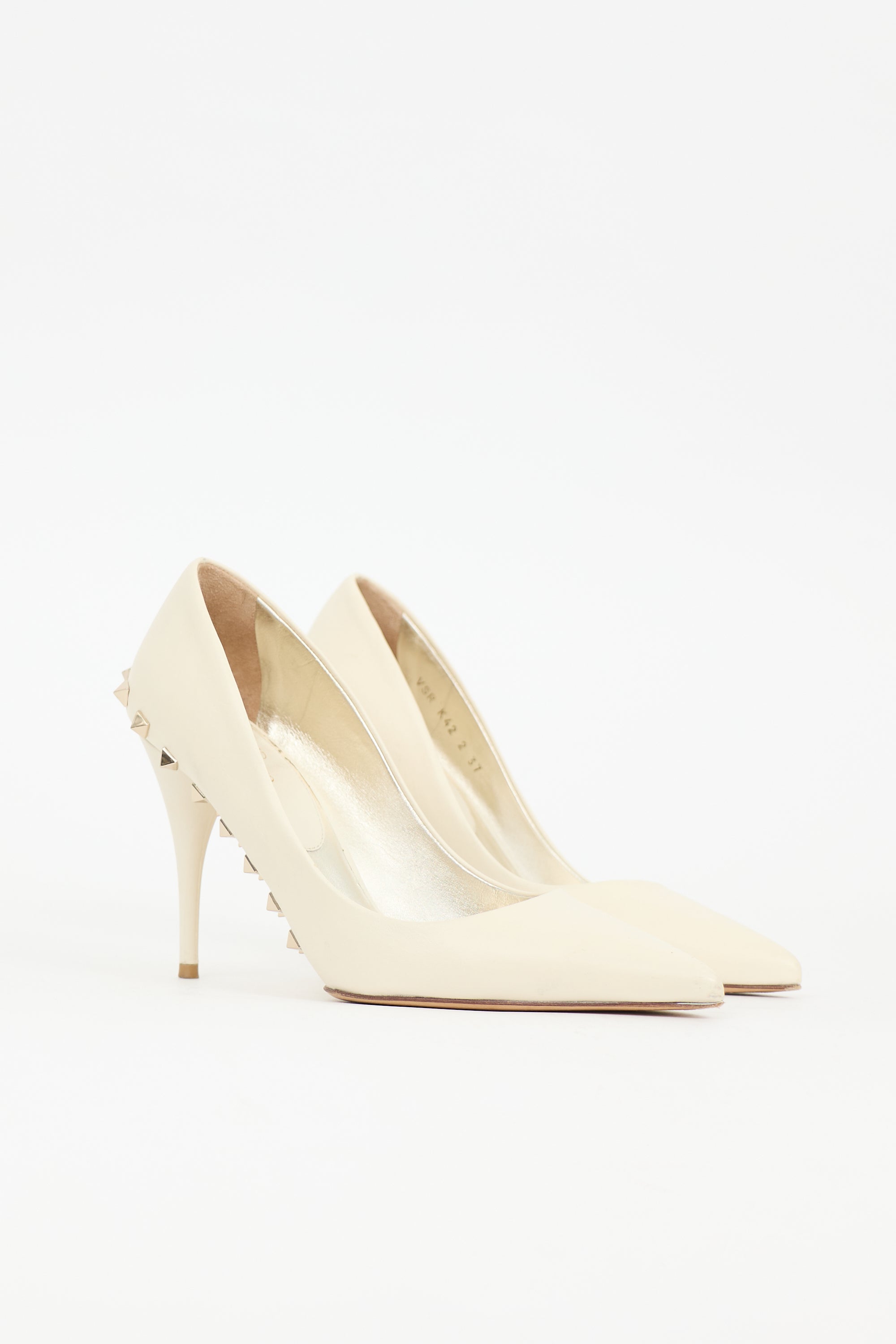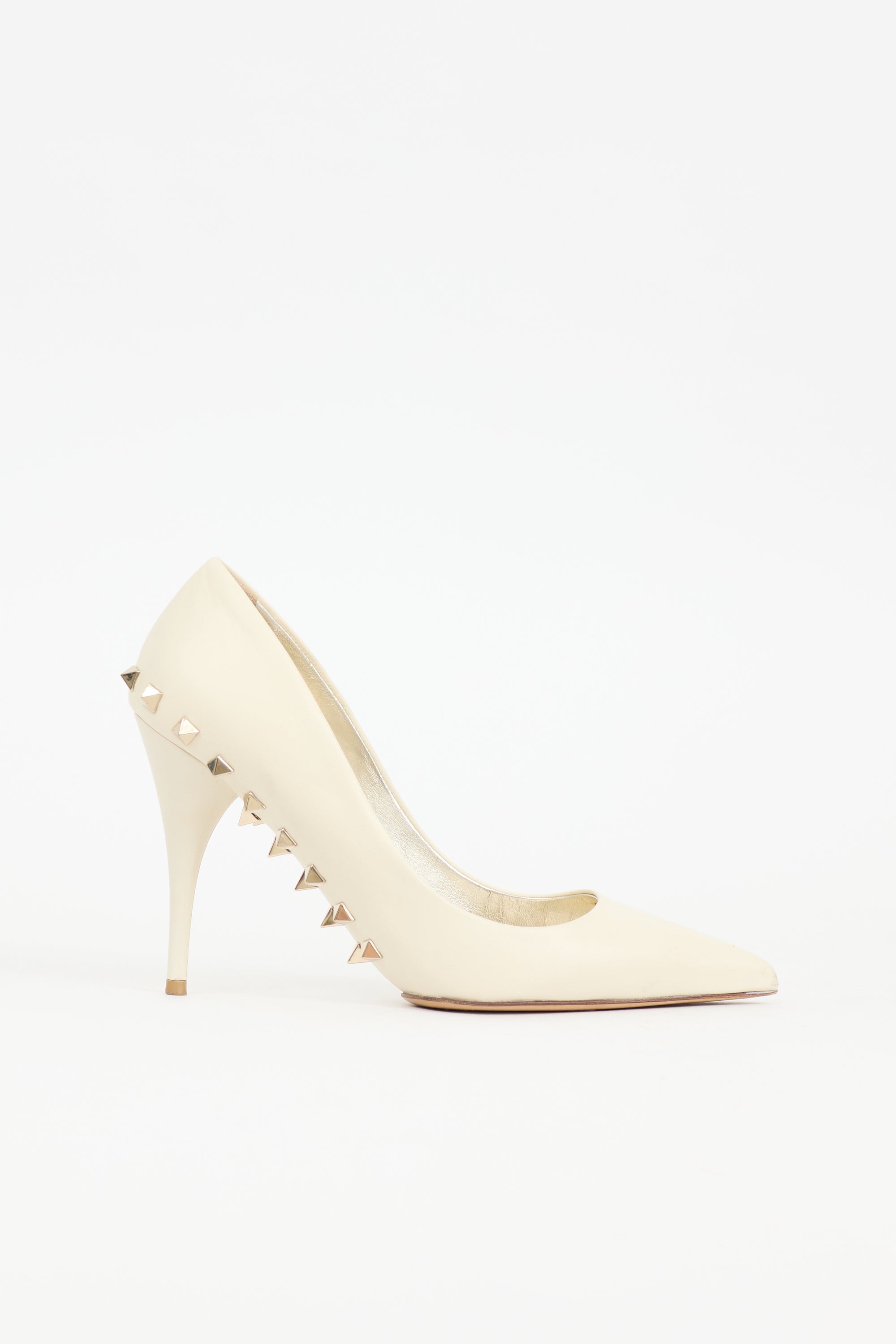 Pre-owned Valentino cream leather pumps featuring pointed toe, stiletto heel, and gold tone Rockstud embellishment at heel counter and sole.