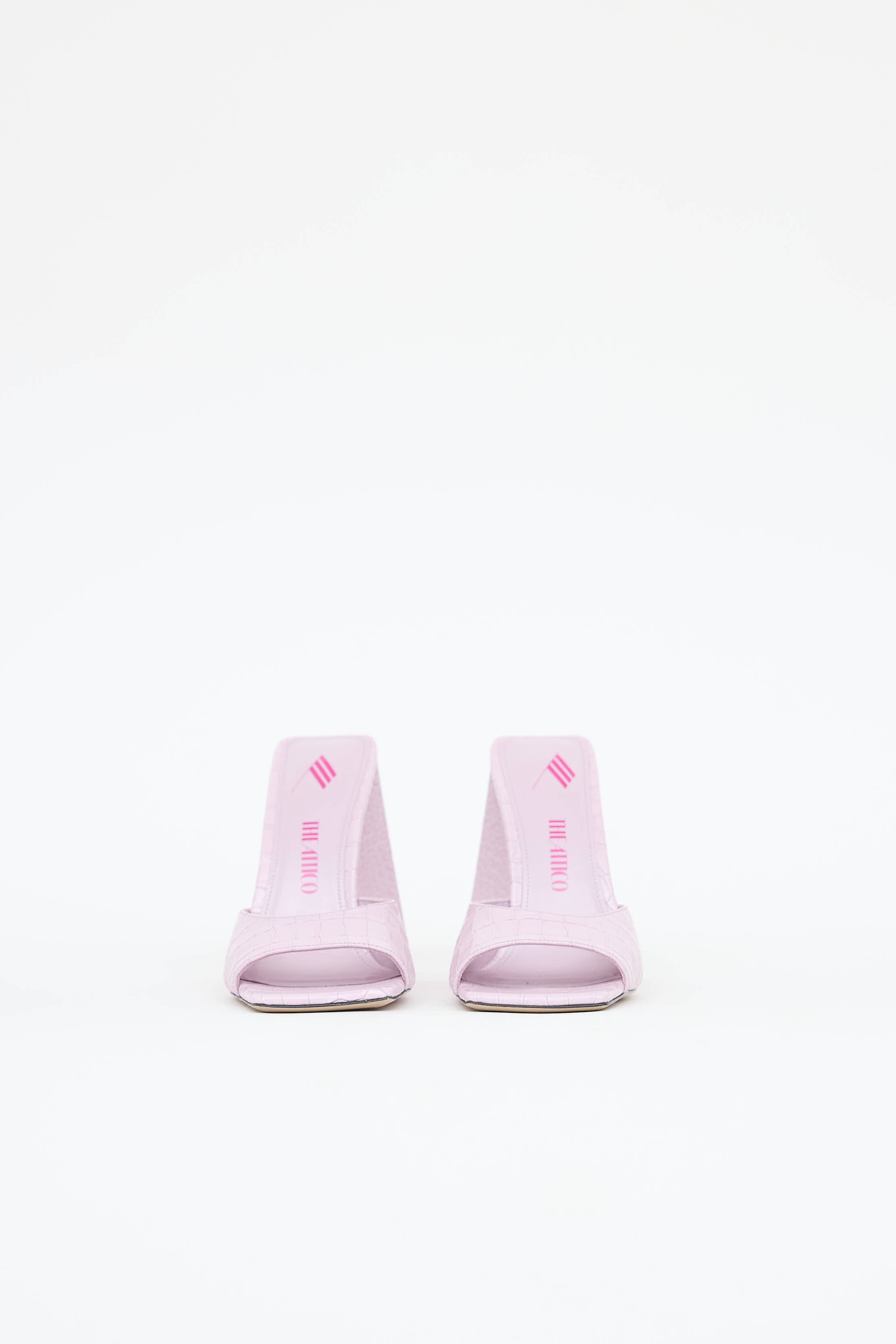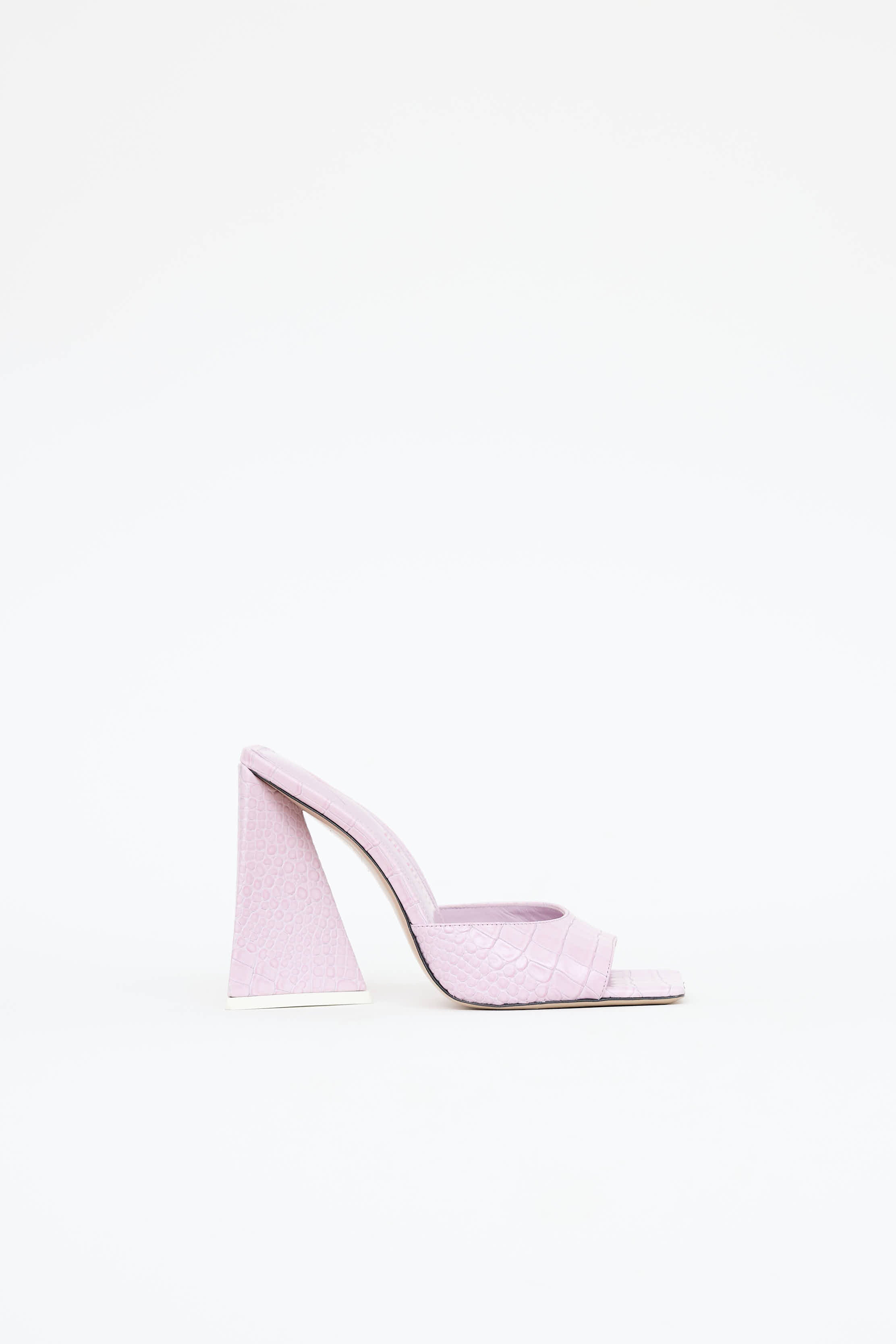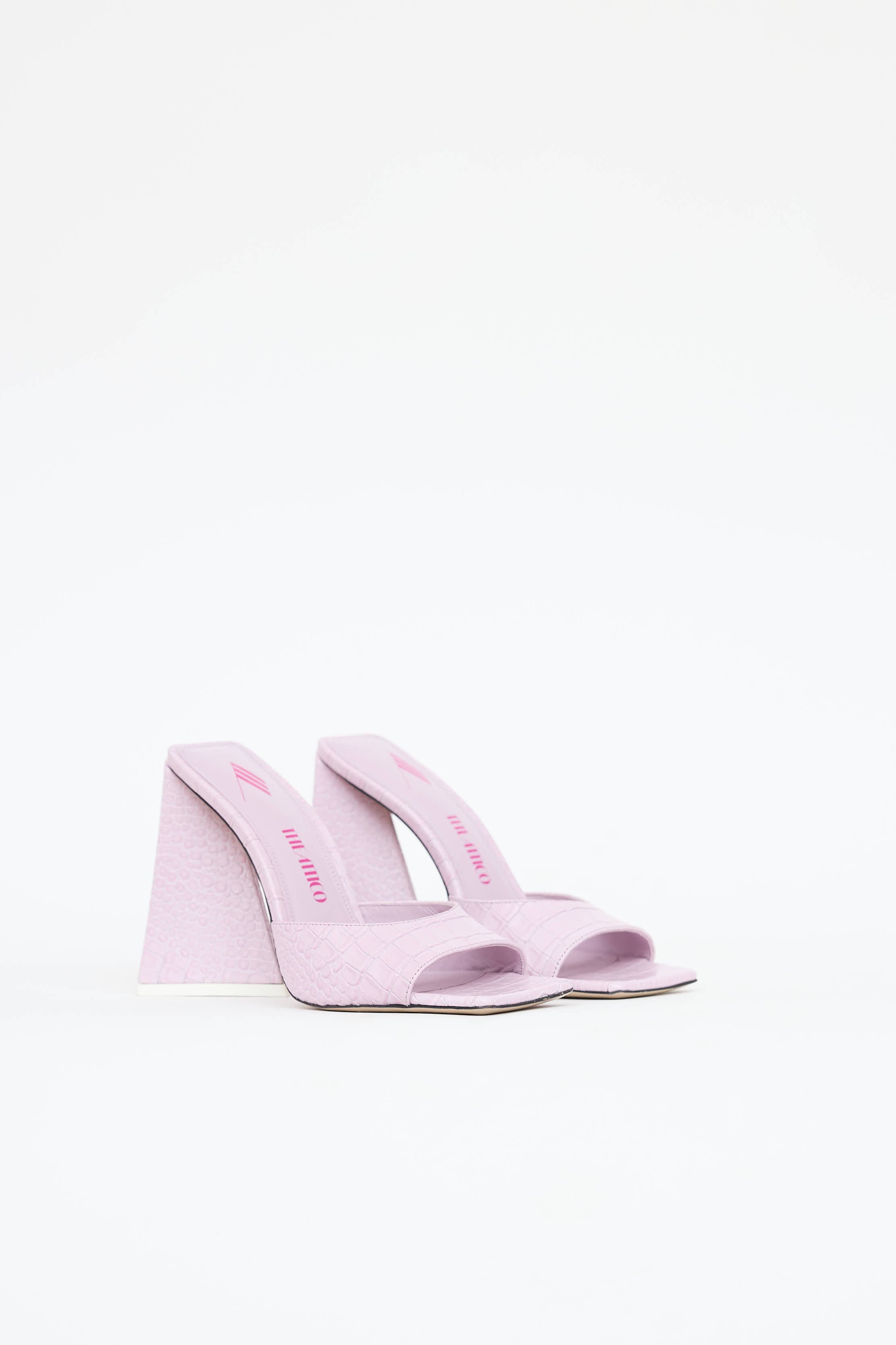 Pre-owned The Attico purple leather Devon heeled sandals featuring open square toe, croc embossed, and covered block heel.