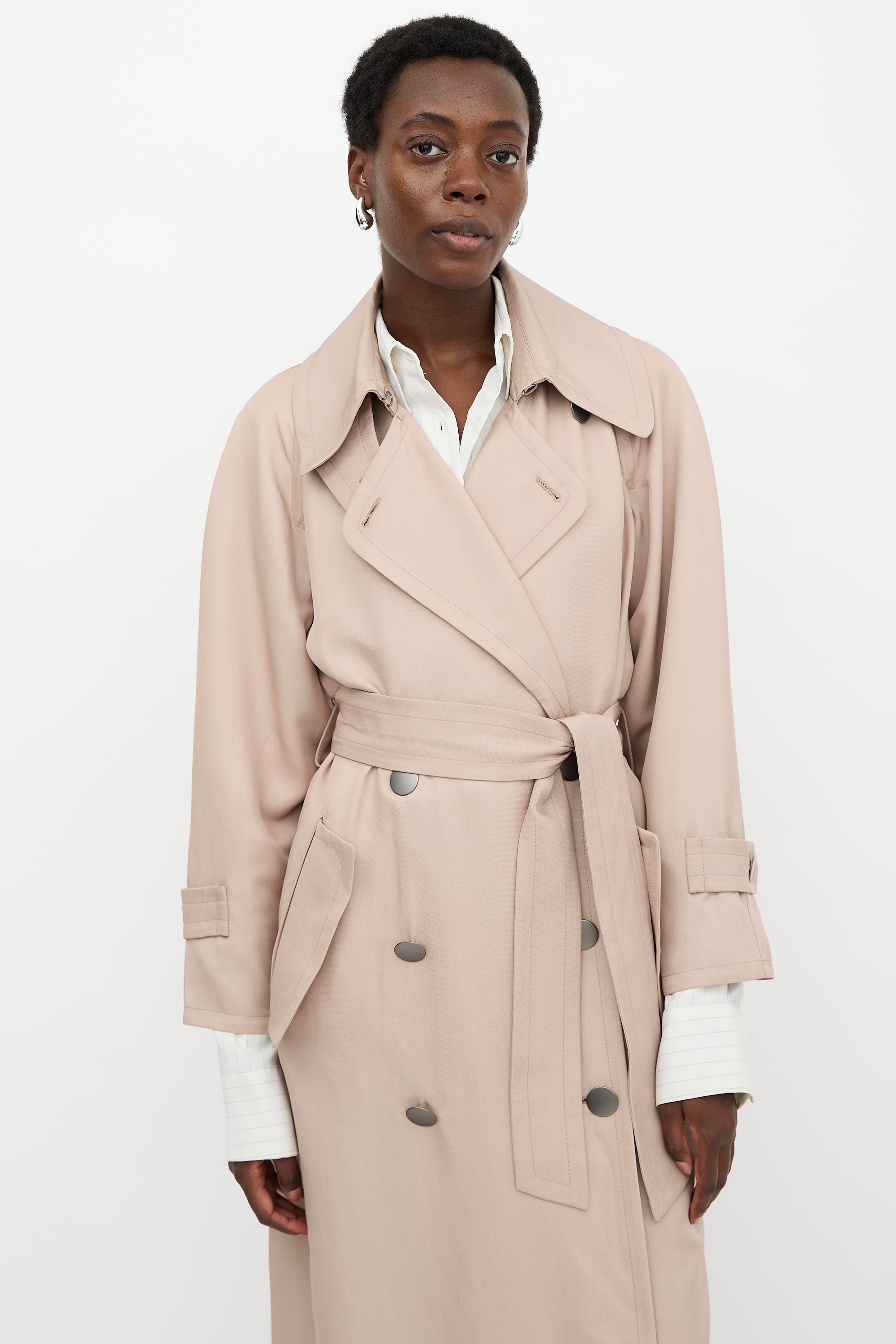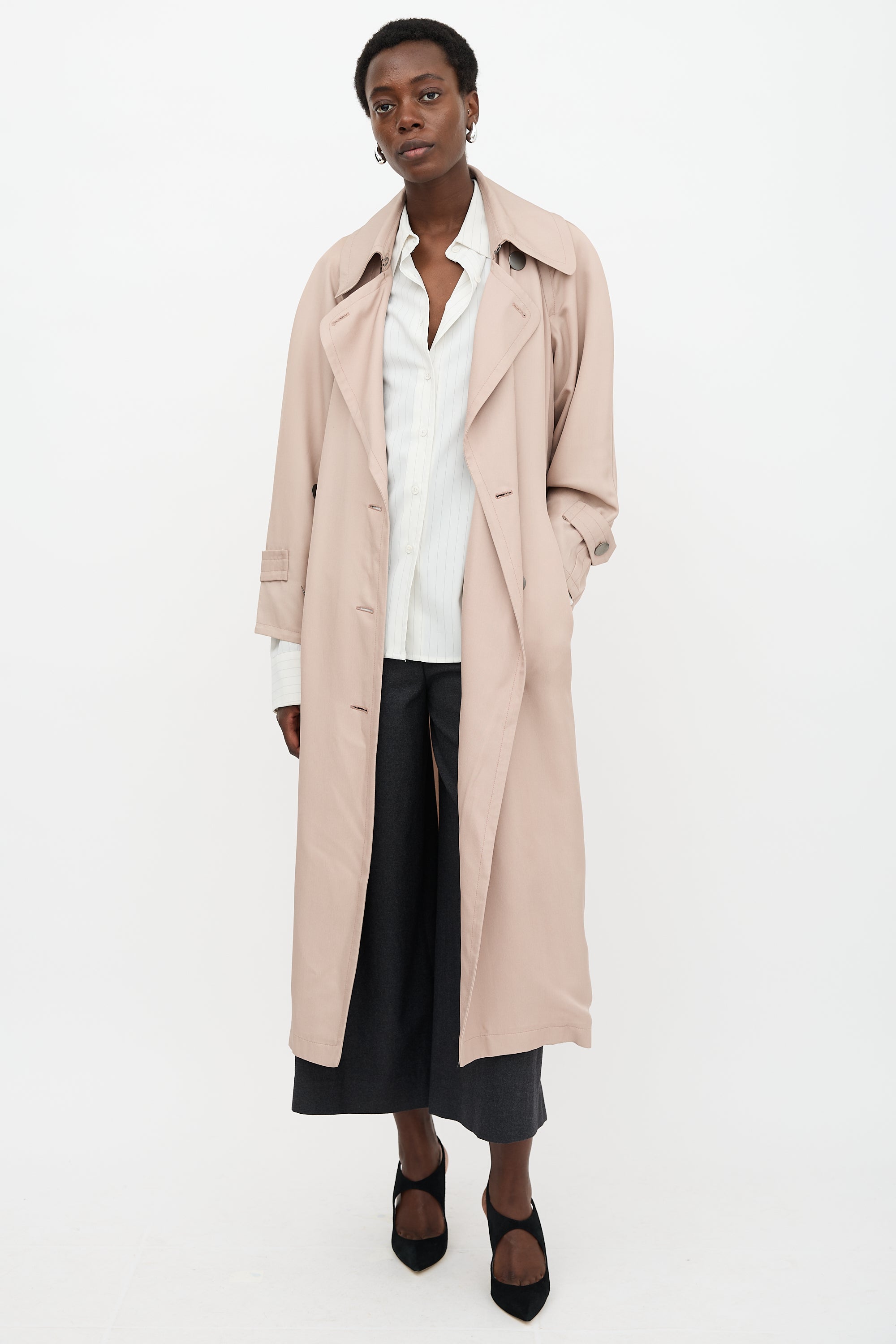 Pre-owned Giorgio Armani beige silk blend trench coat featuring a wide collar and lapels, double breasted button front, tie belt, double welt pockets, and back vent with button fastening. Partially lined.
