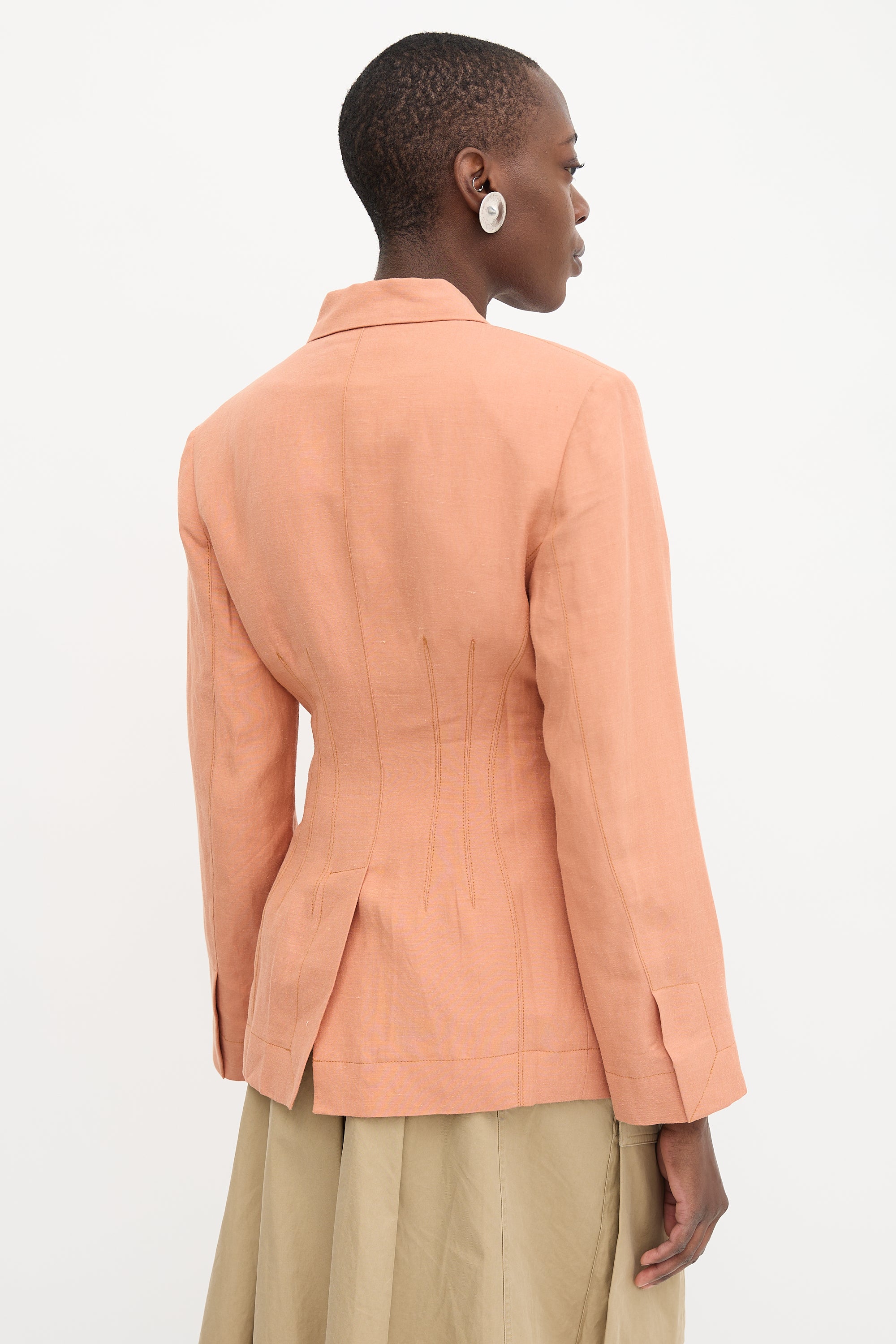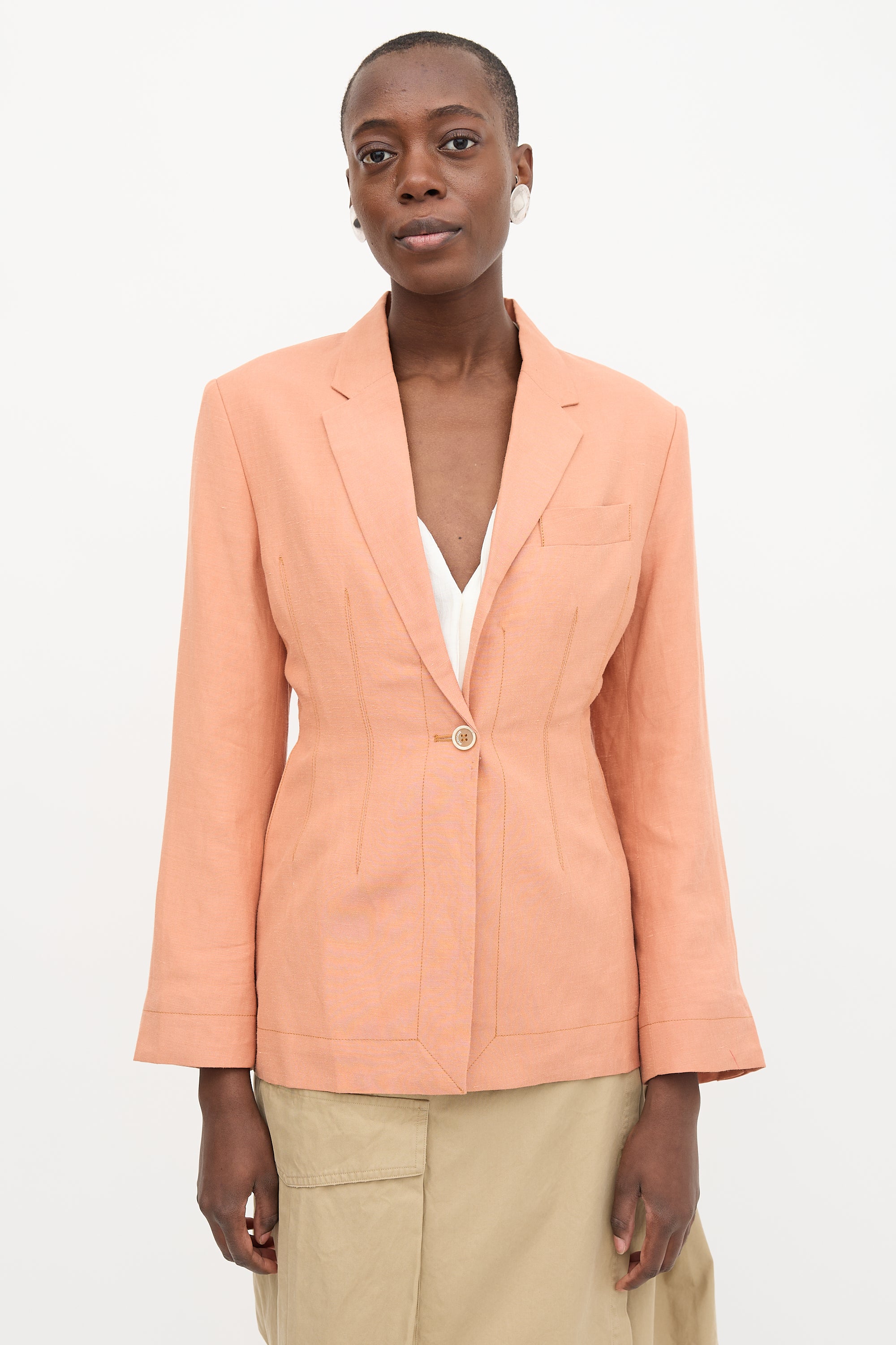 Pre-owned Jacquemus hemp and wool blend L'Amour d'un Gitan pink blazer featuring a notched collar, padded shoulder, single button front, in seam pockets, and back vent. Lined.