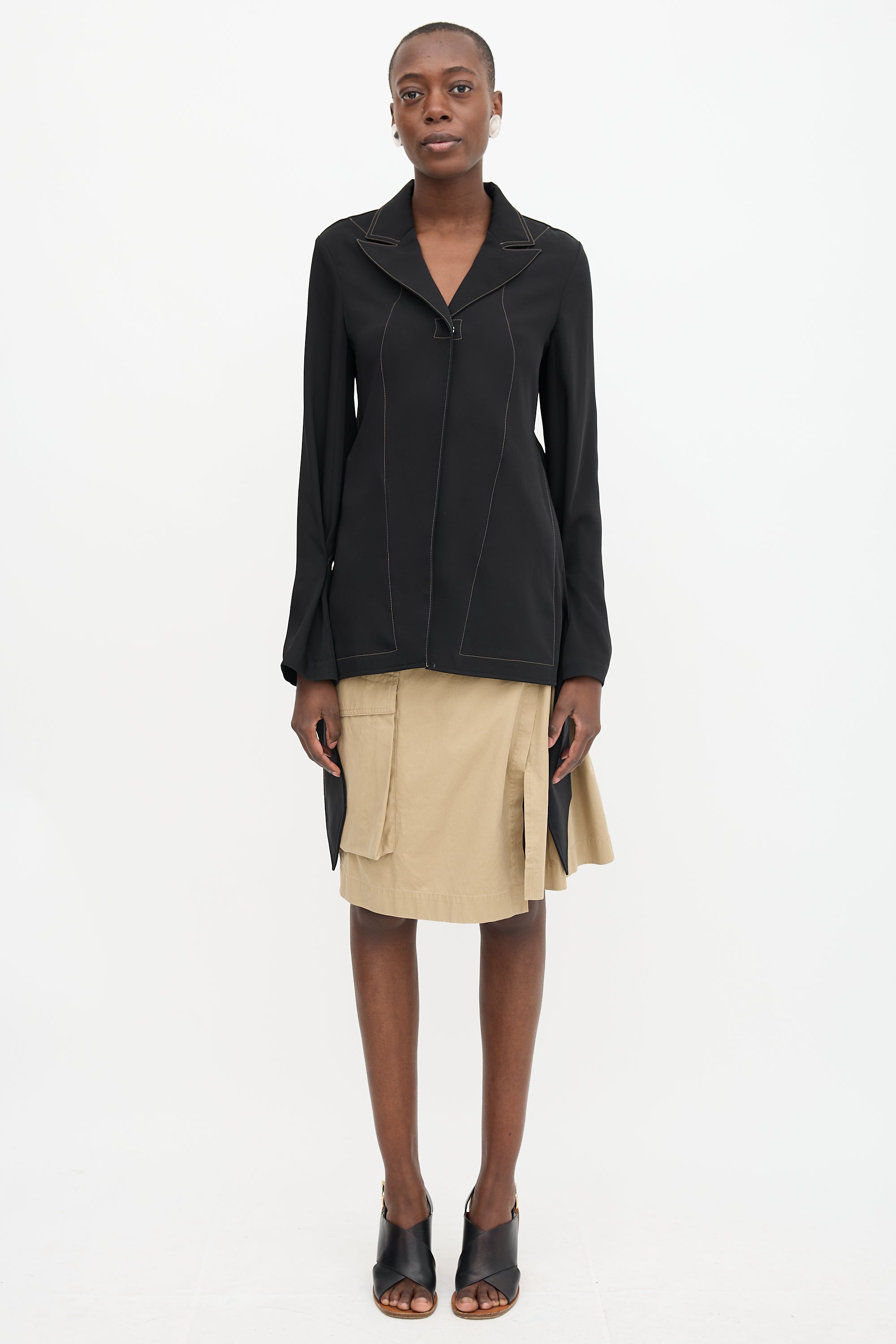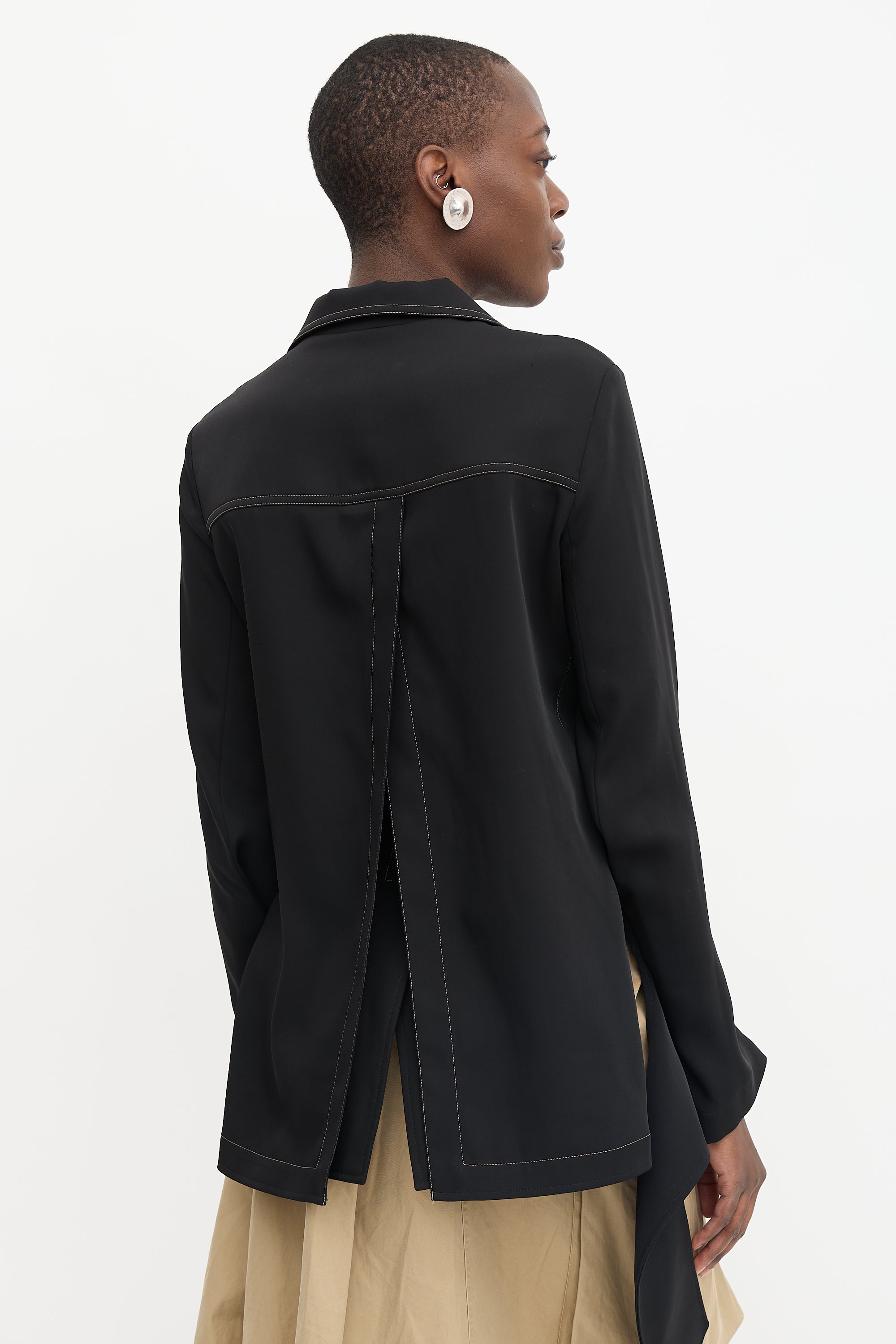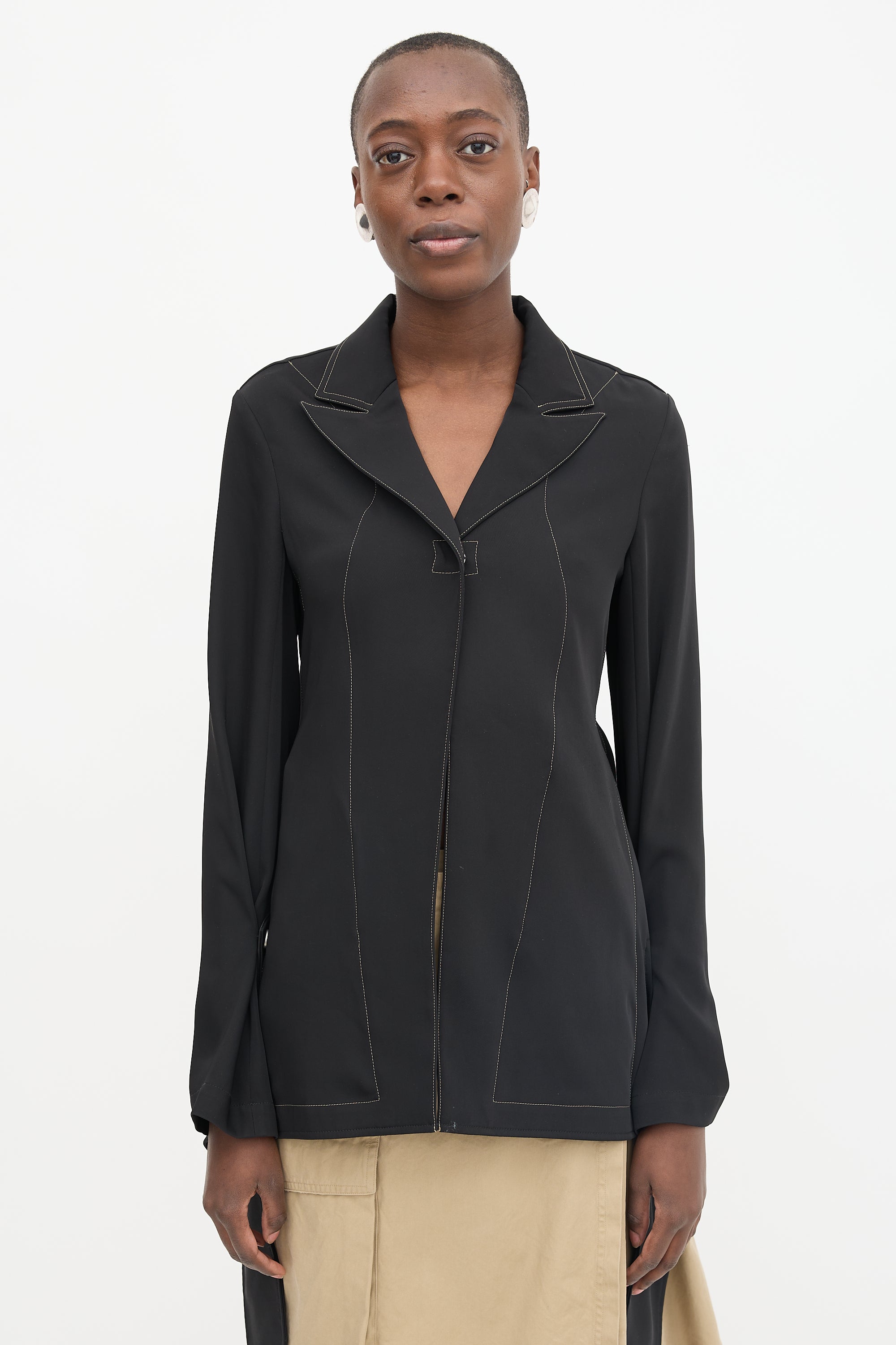 Pre-owned Kiko Kostadinov black shirt jacket featuring a deconstructed design, contrast stitching, peak lapel, button front, and back vent.