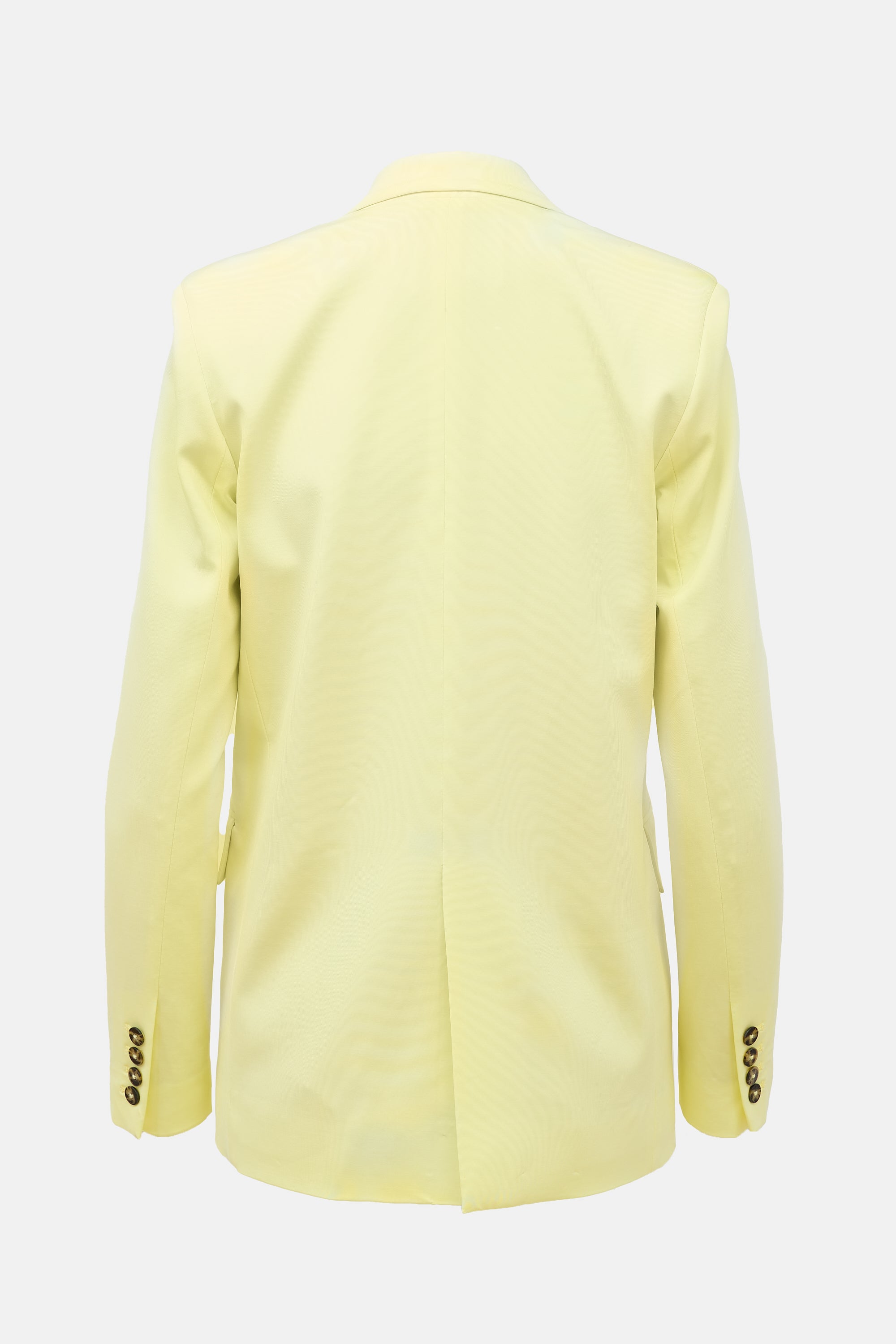 Pre-owned Remain Birger Christensen pastel yellow blazer featuring a peak lapel, single button front, padded shoulder, and double welt pockets.