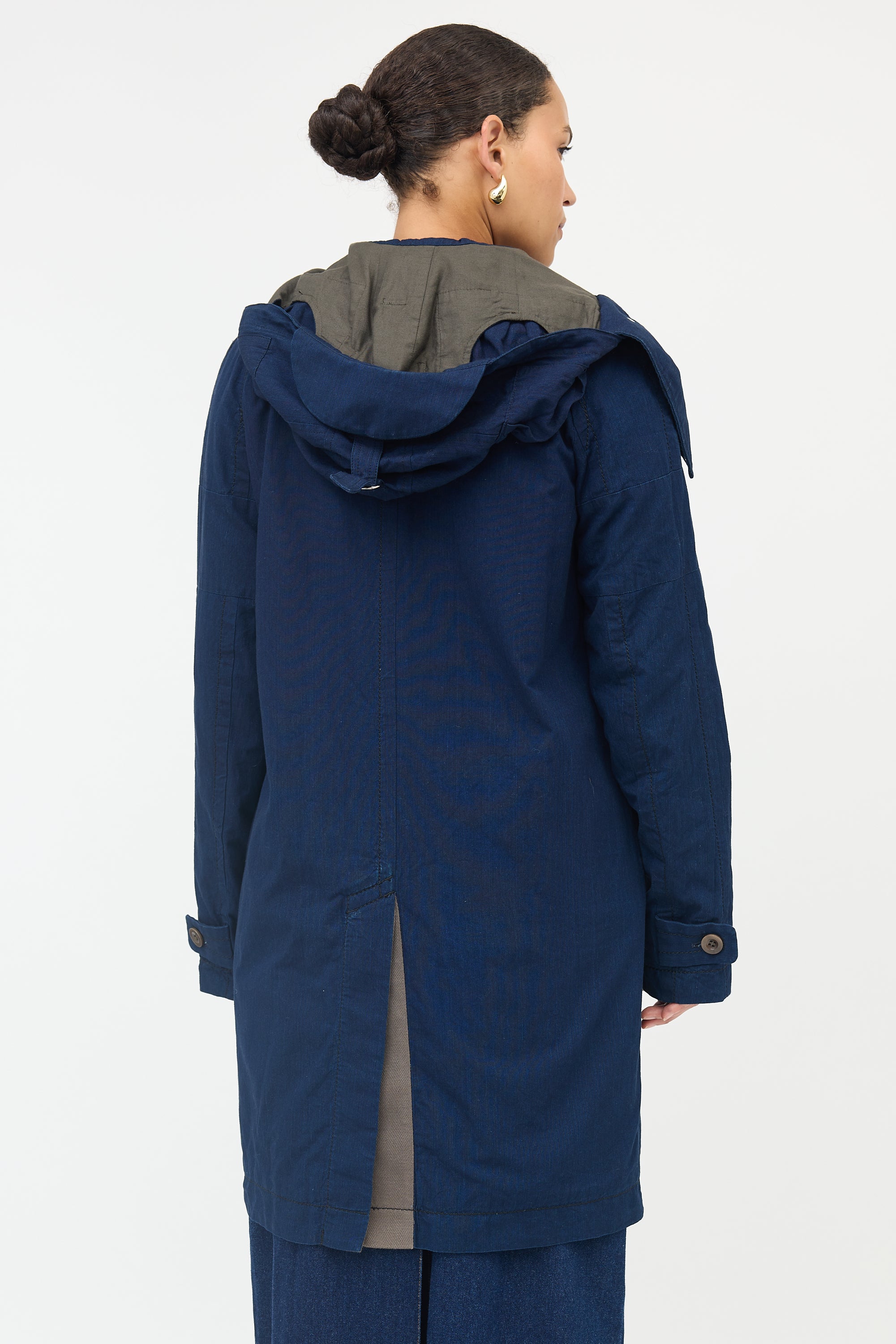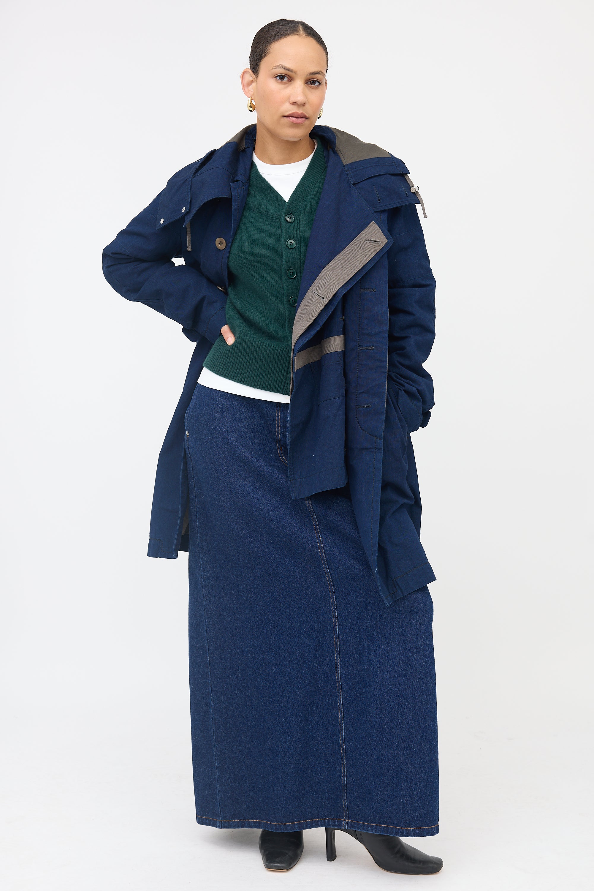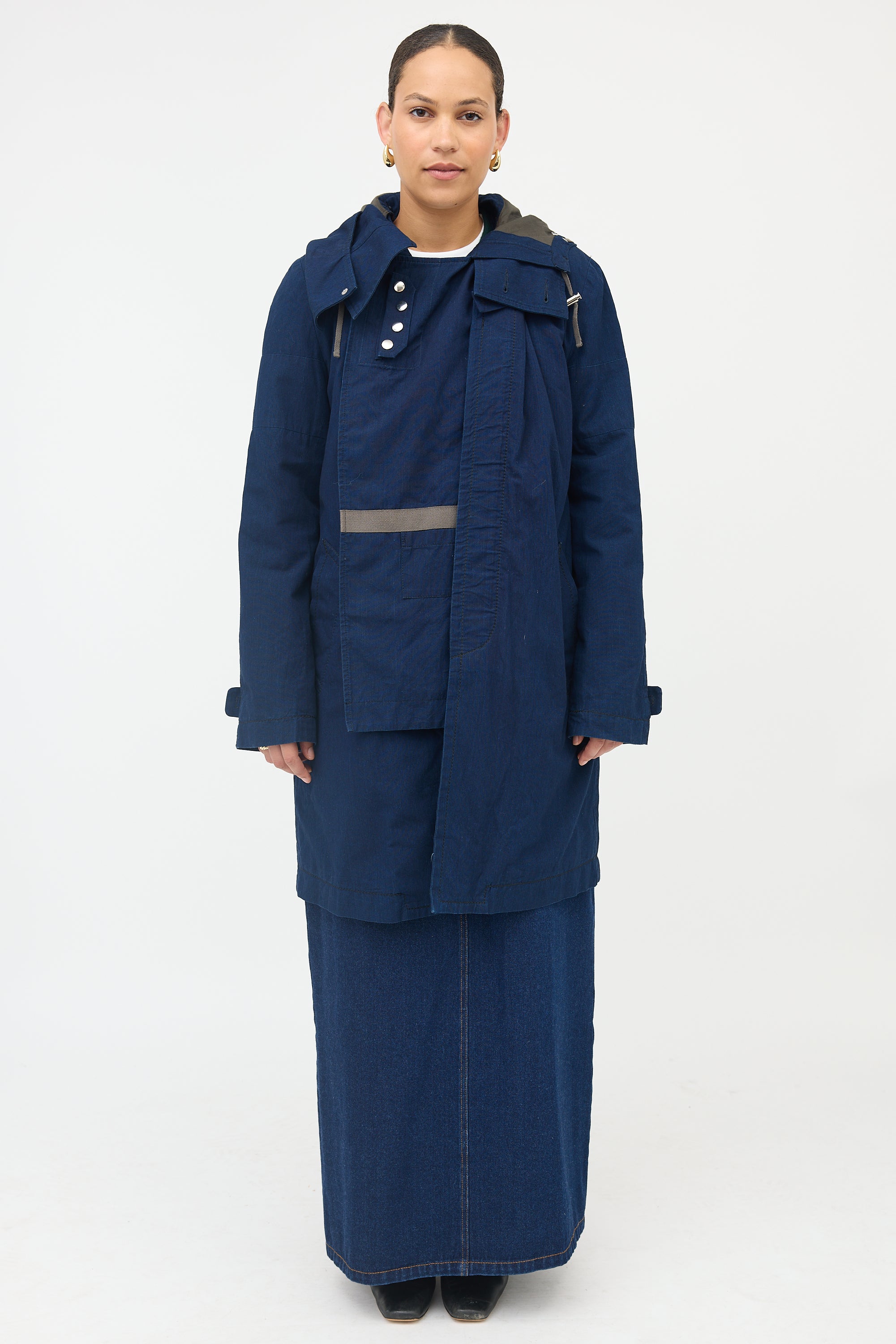 Pre-owned Sacai navy chambray coat featuring a funnel neck with button fastenings, removable and adjustable drawstring hood, point collar with velvet lining, concealed button front, removable placket panel, two welt pockets at hip, vented back with grosgrain trim, and button cuffs. Lined.