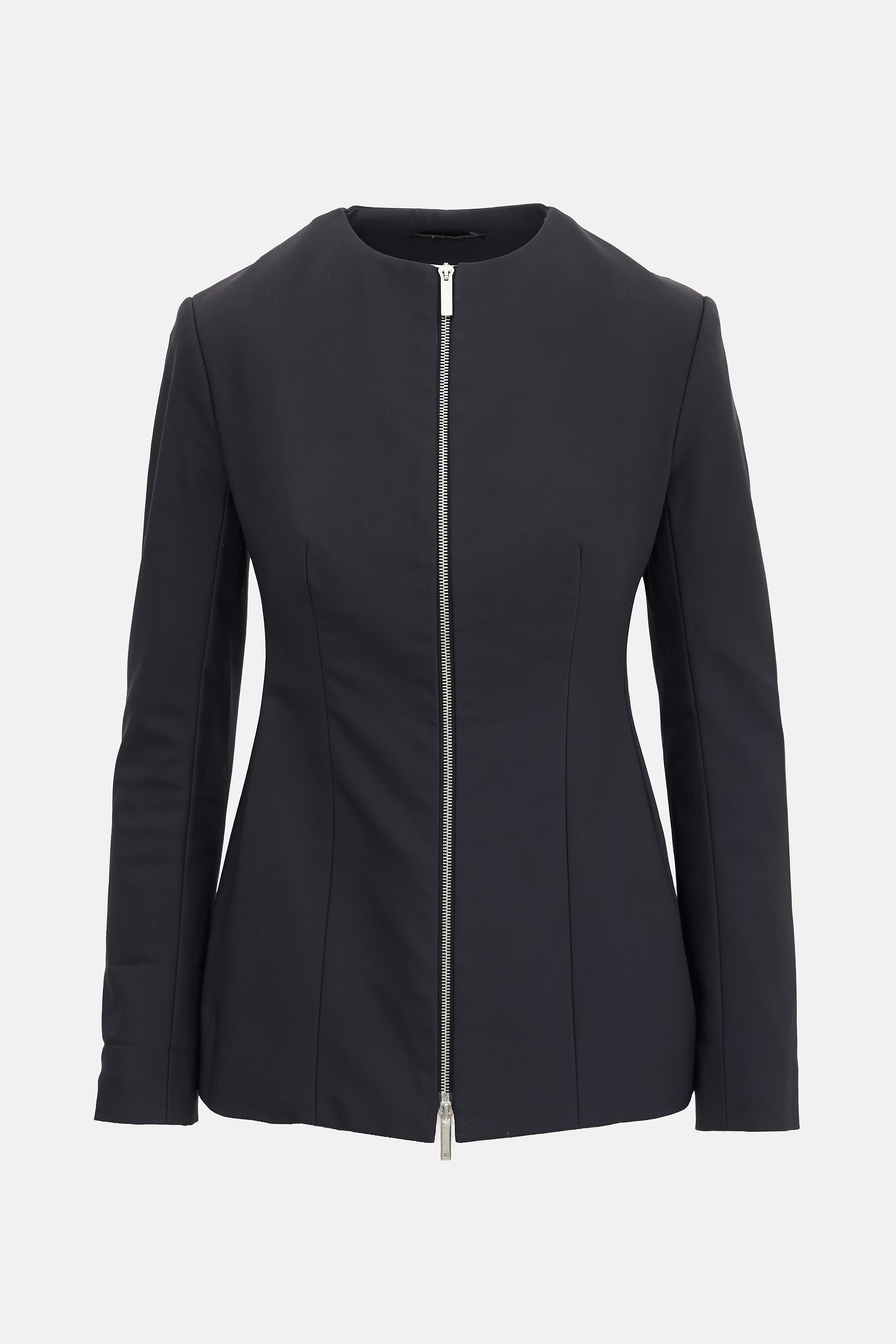 Pre-owned The Row black nylon blend jacket featuring round neckline, two way zip up front, peplum design, in seam pockets, and padded shoulders. Lined.